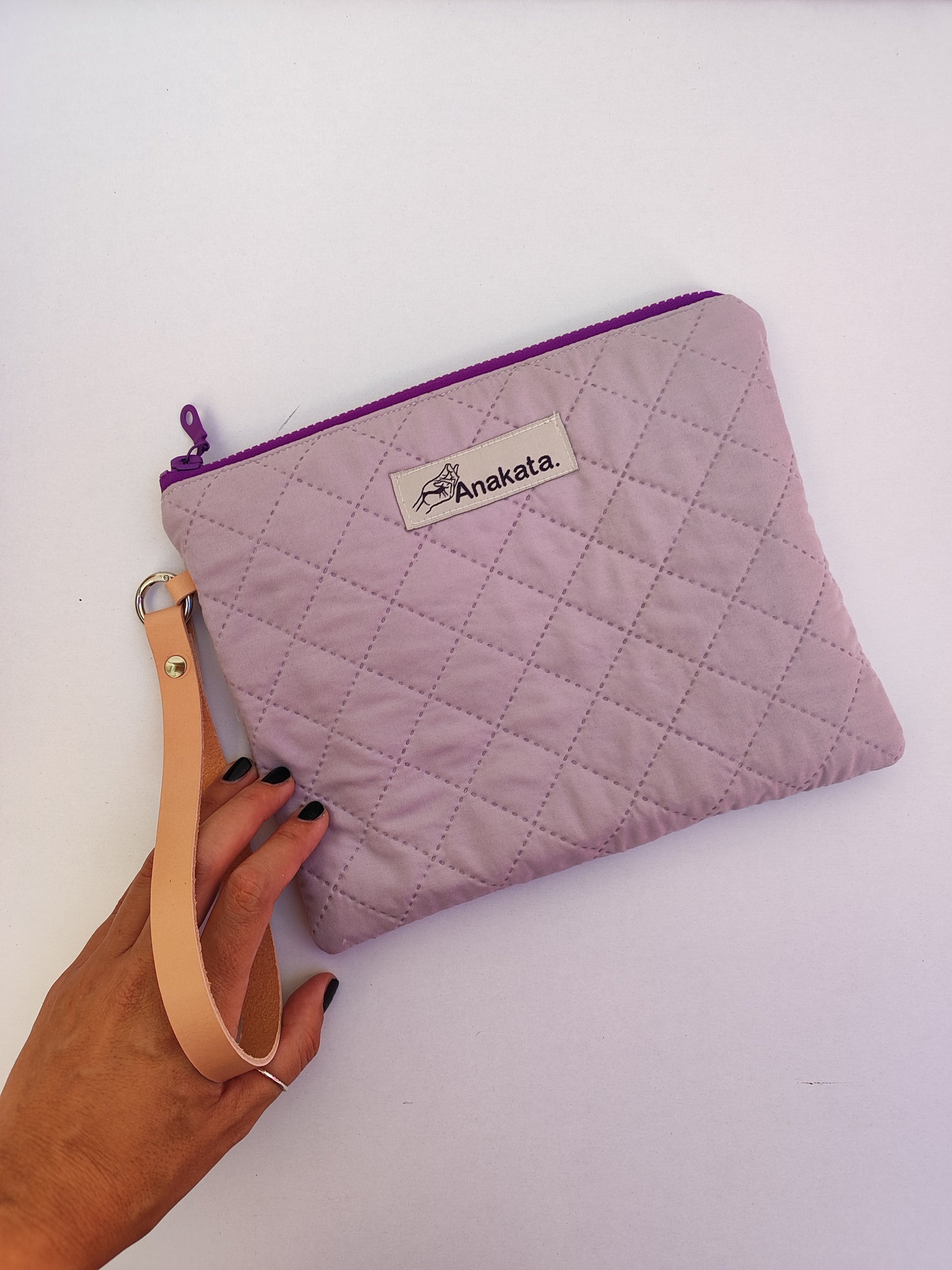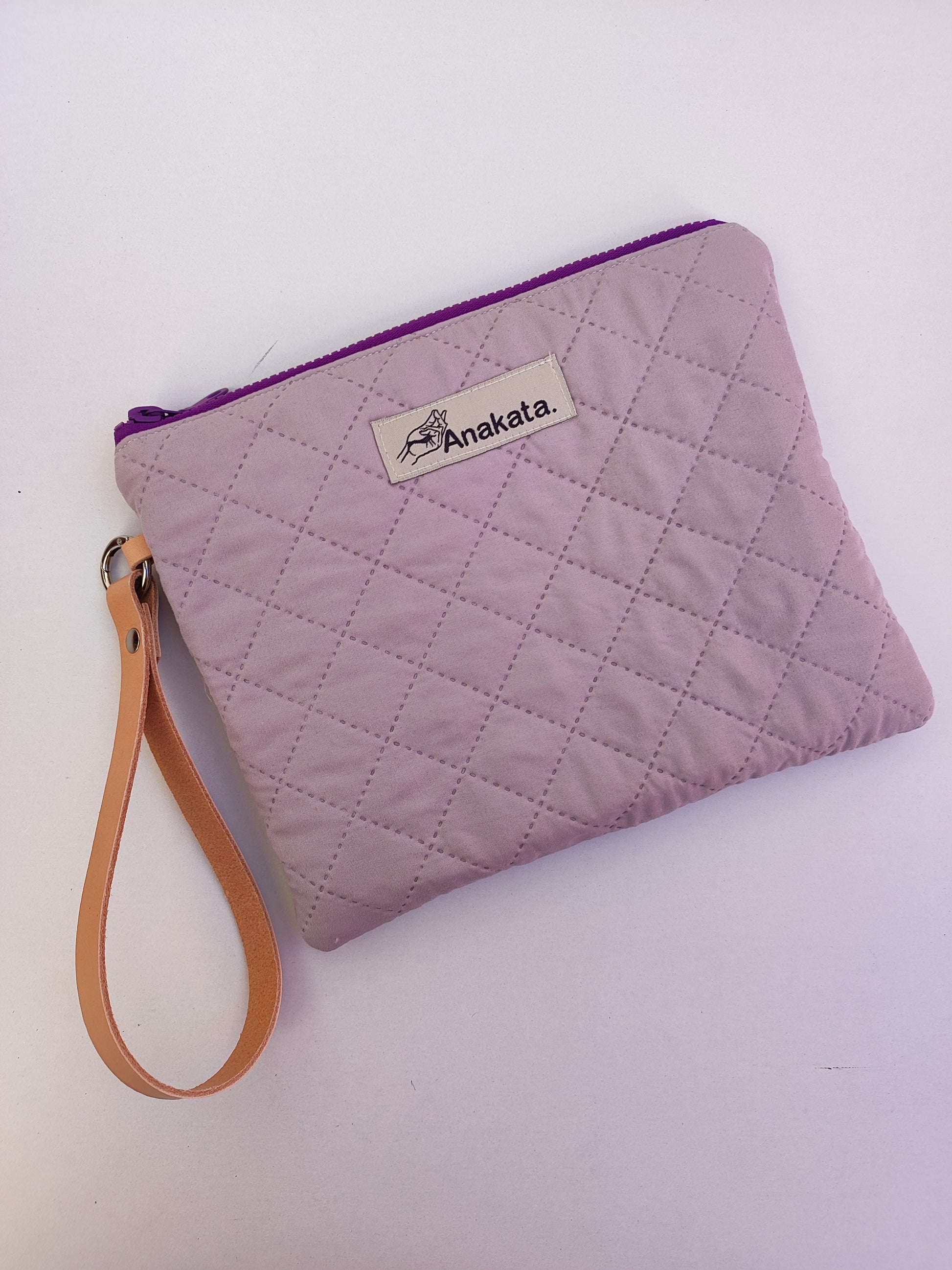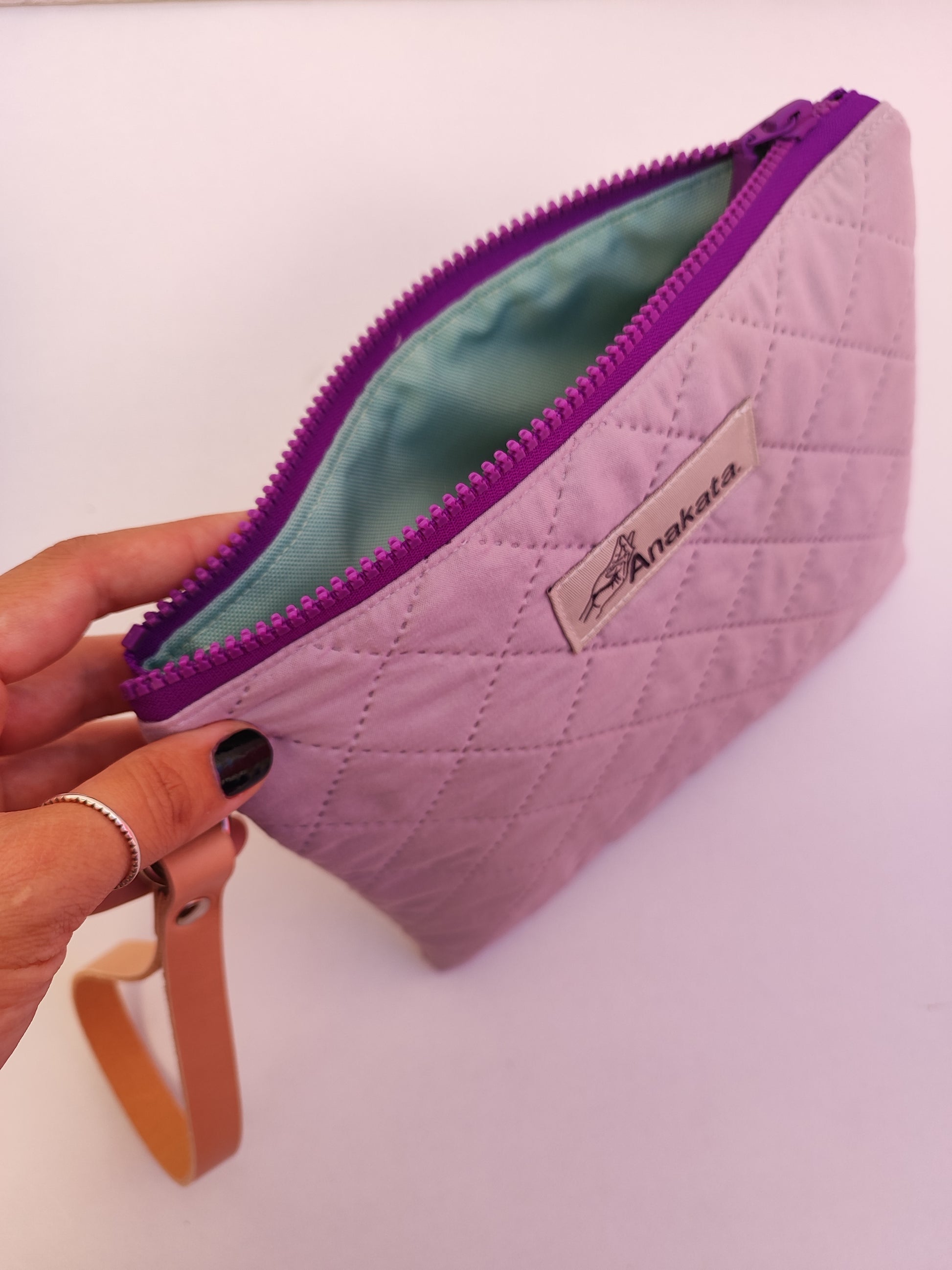 Χειροποίητο φλάφι καπιτονέ τσαντάκι με αδιάβροχη επένδυση και δερμάτινο αποσπώμενο λουράκι.