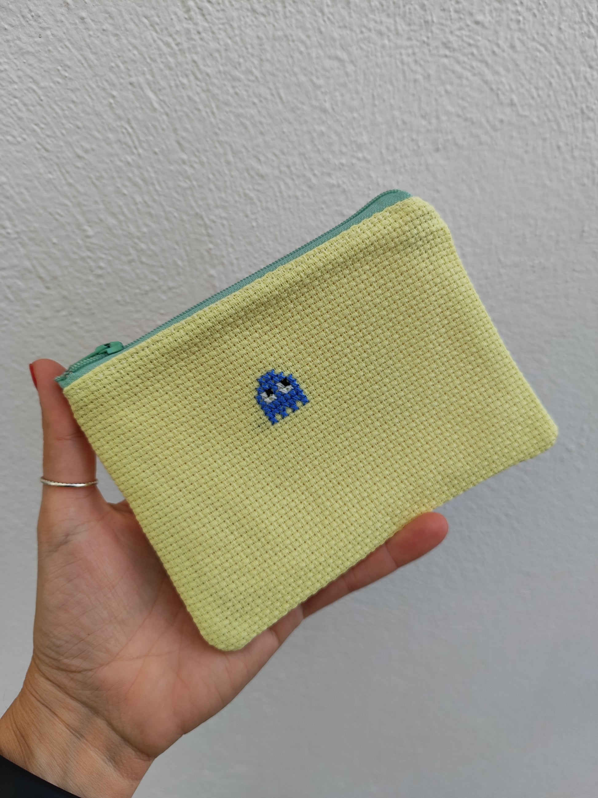 Μικρό κεντημένο πορτοφολάκι - κίτρινο με γαλάζιο φαντασματάκι (PAC-MAN).