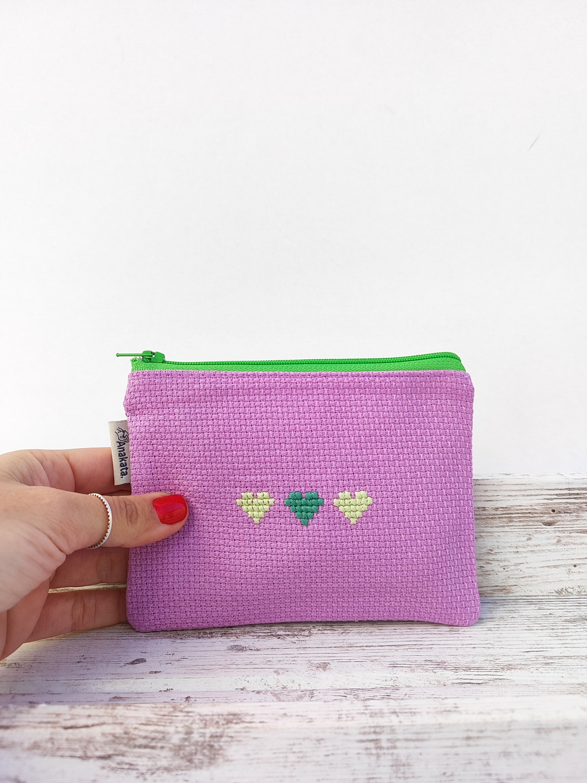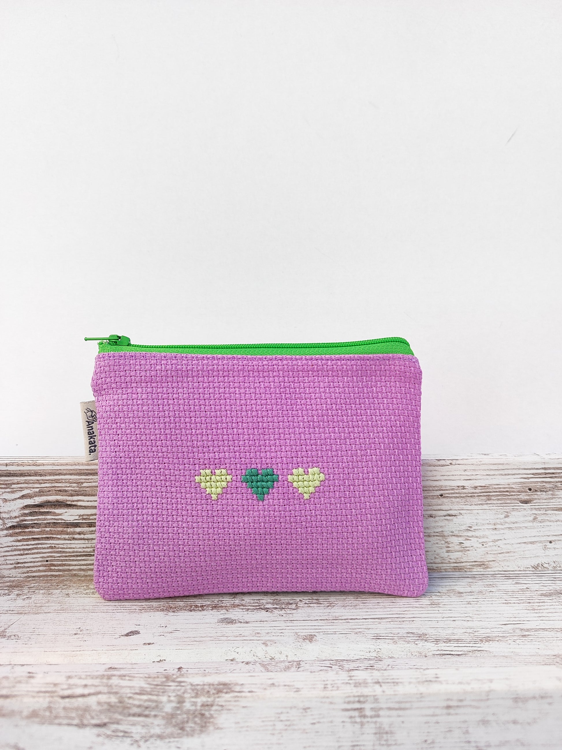 Μικρό κεντημένο πορτοφολάκι - μωβ με πράσινες καρδιές