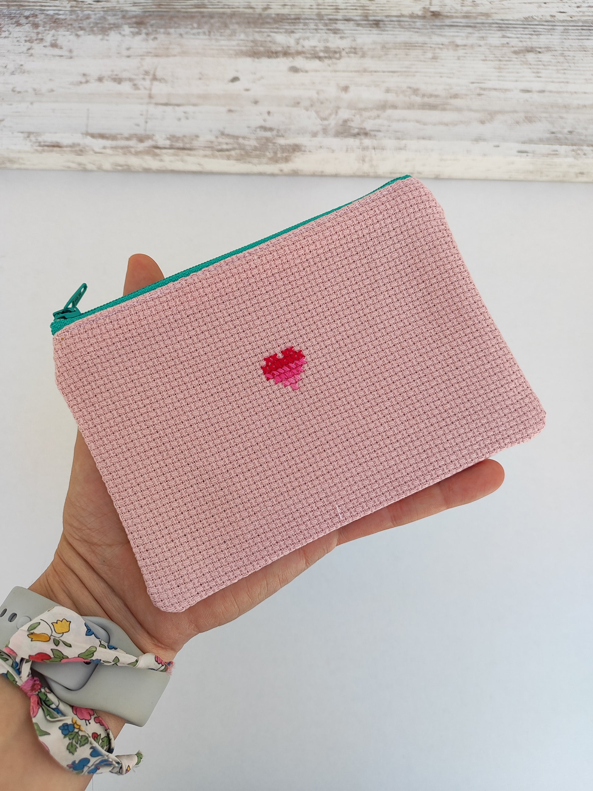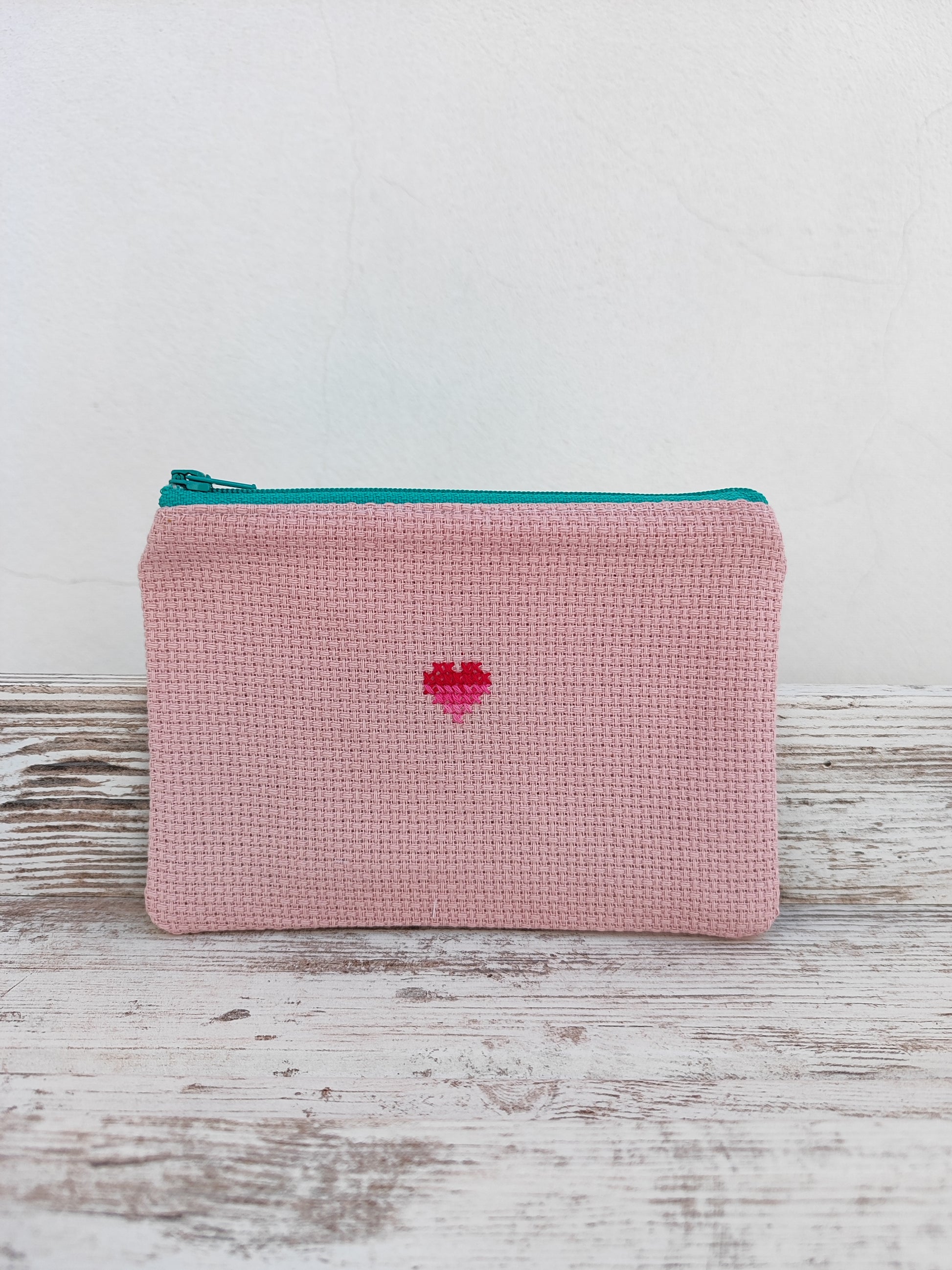 Μικρό κεντημένο πορτοφολάκι - ροζ με καρδούλα