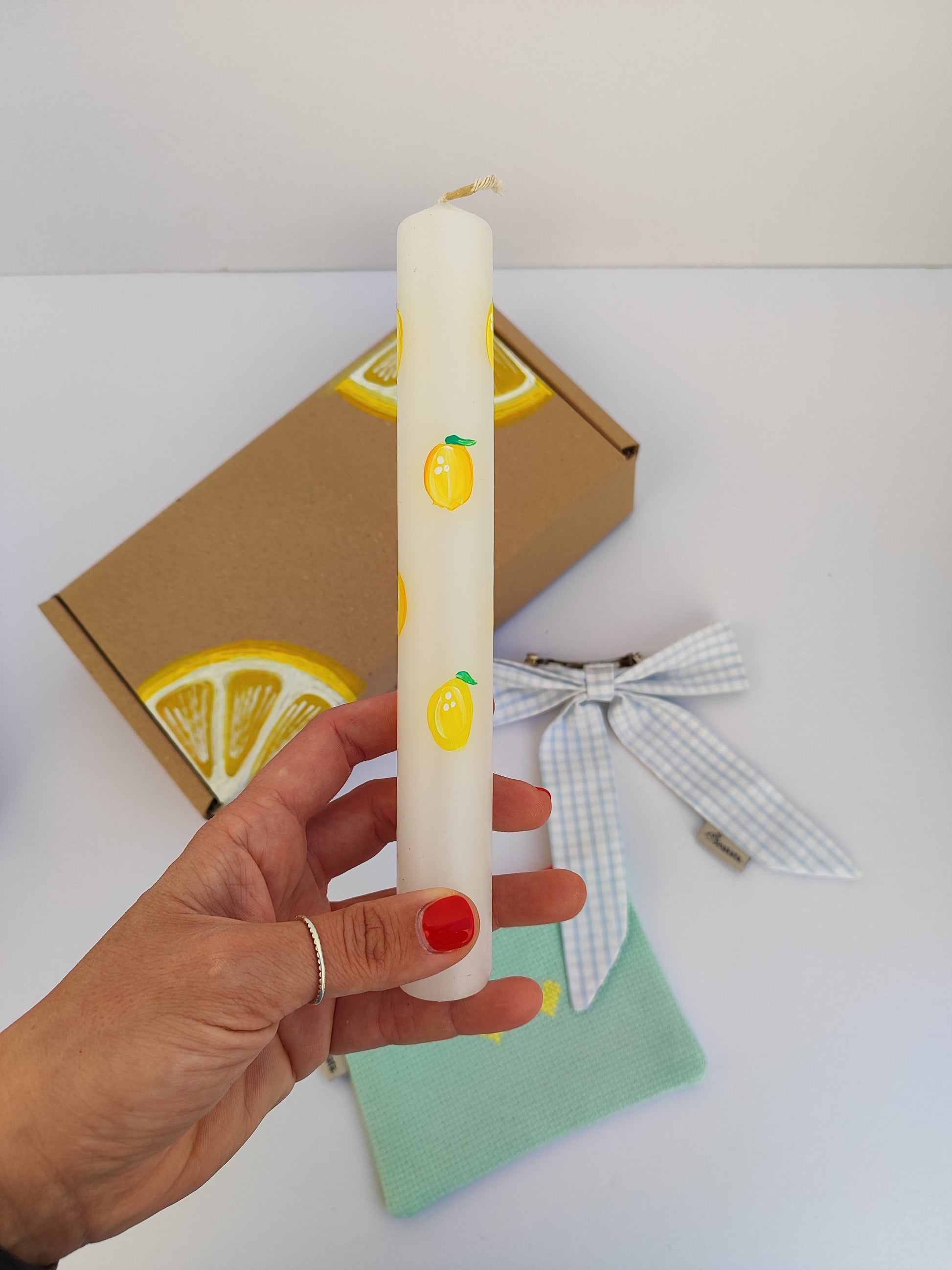 Πασχαλινό gift box ''λαμπάδα, κεντημένο πορτοφόλι και φιόγκος με κλιπ''