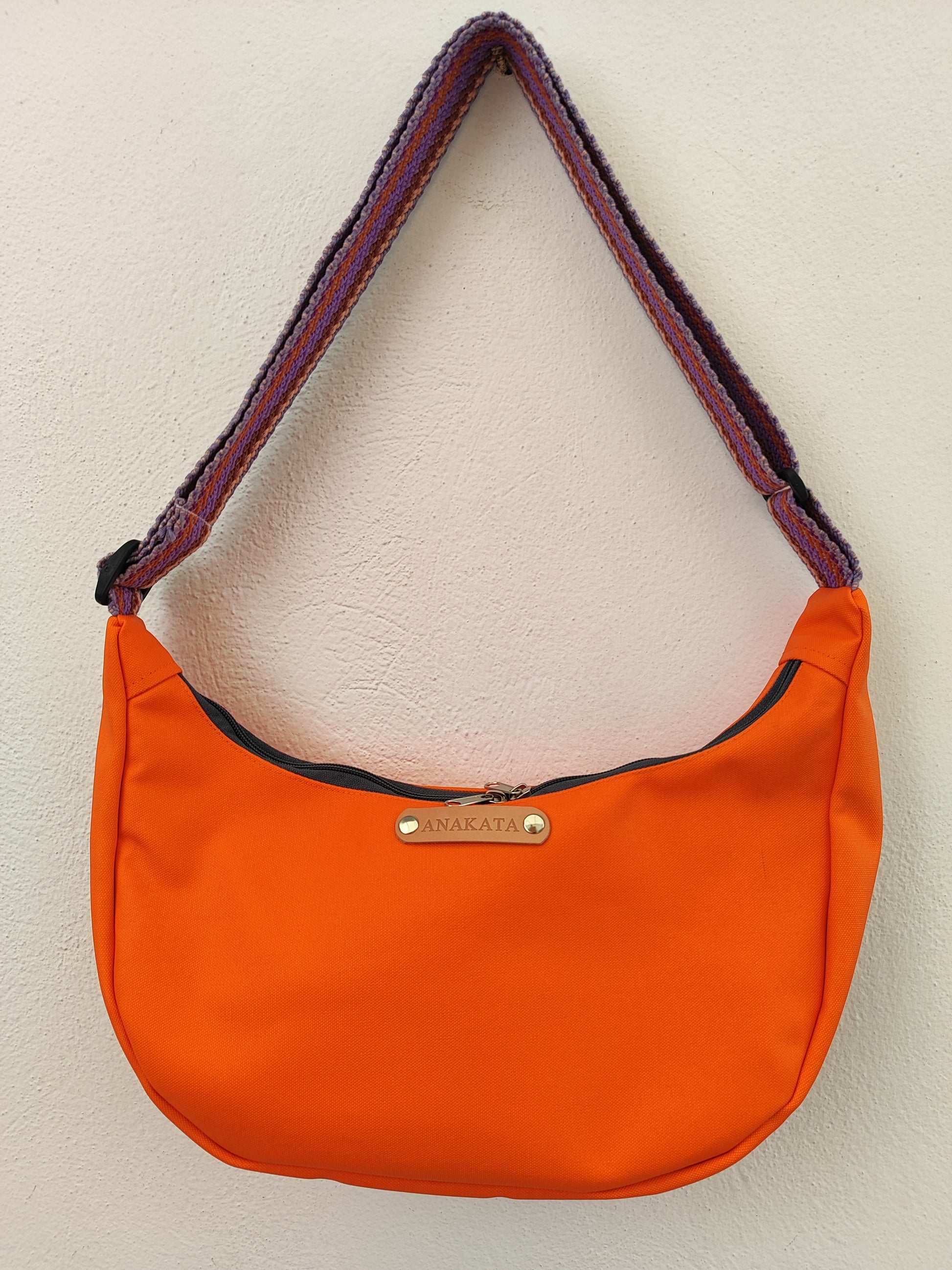 Τσάντα ''κρουασάν'' - πορτοκαλί με πολύχρωμο παστέλ ιμάντα.