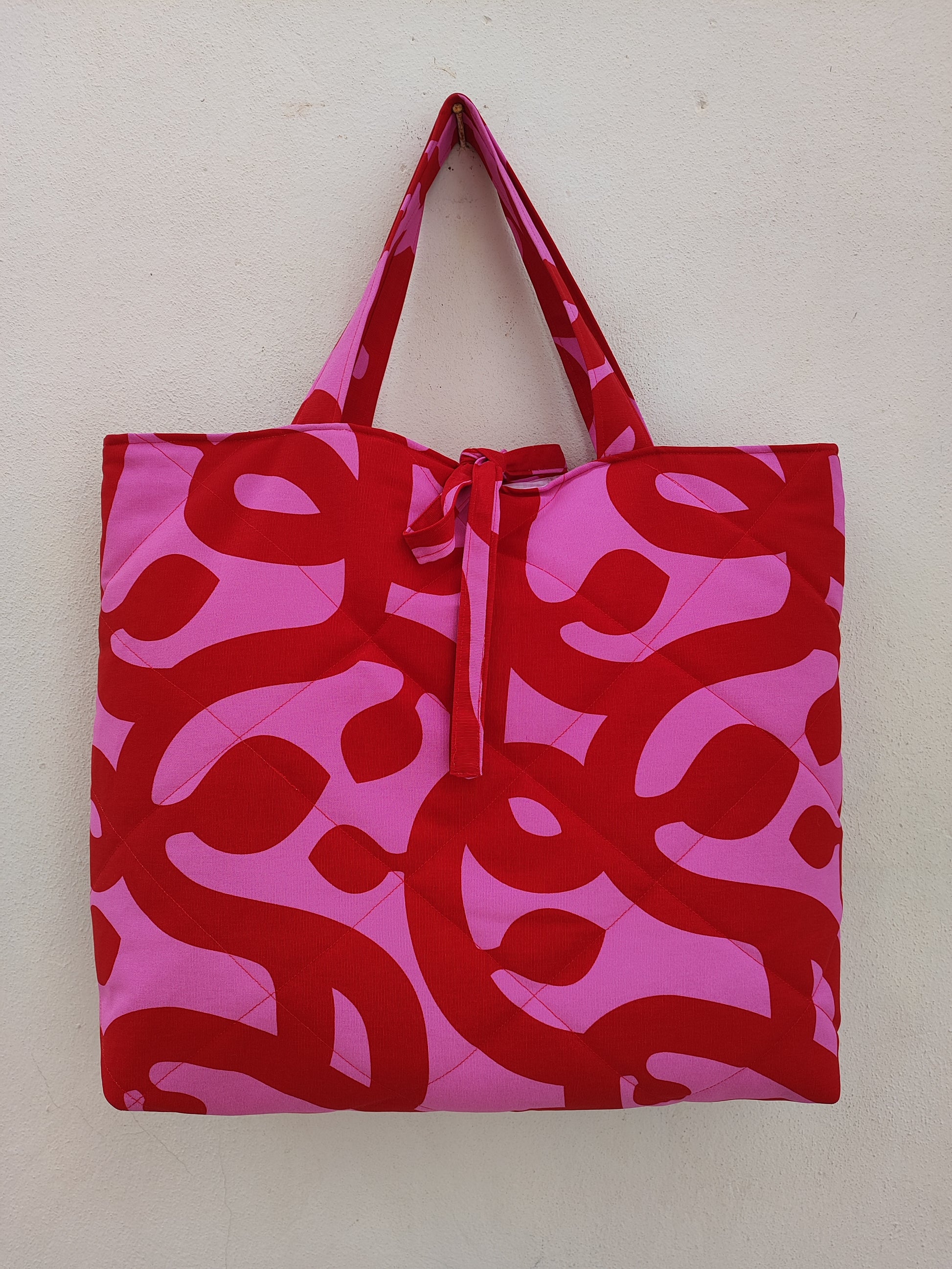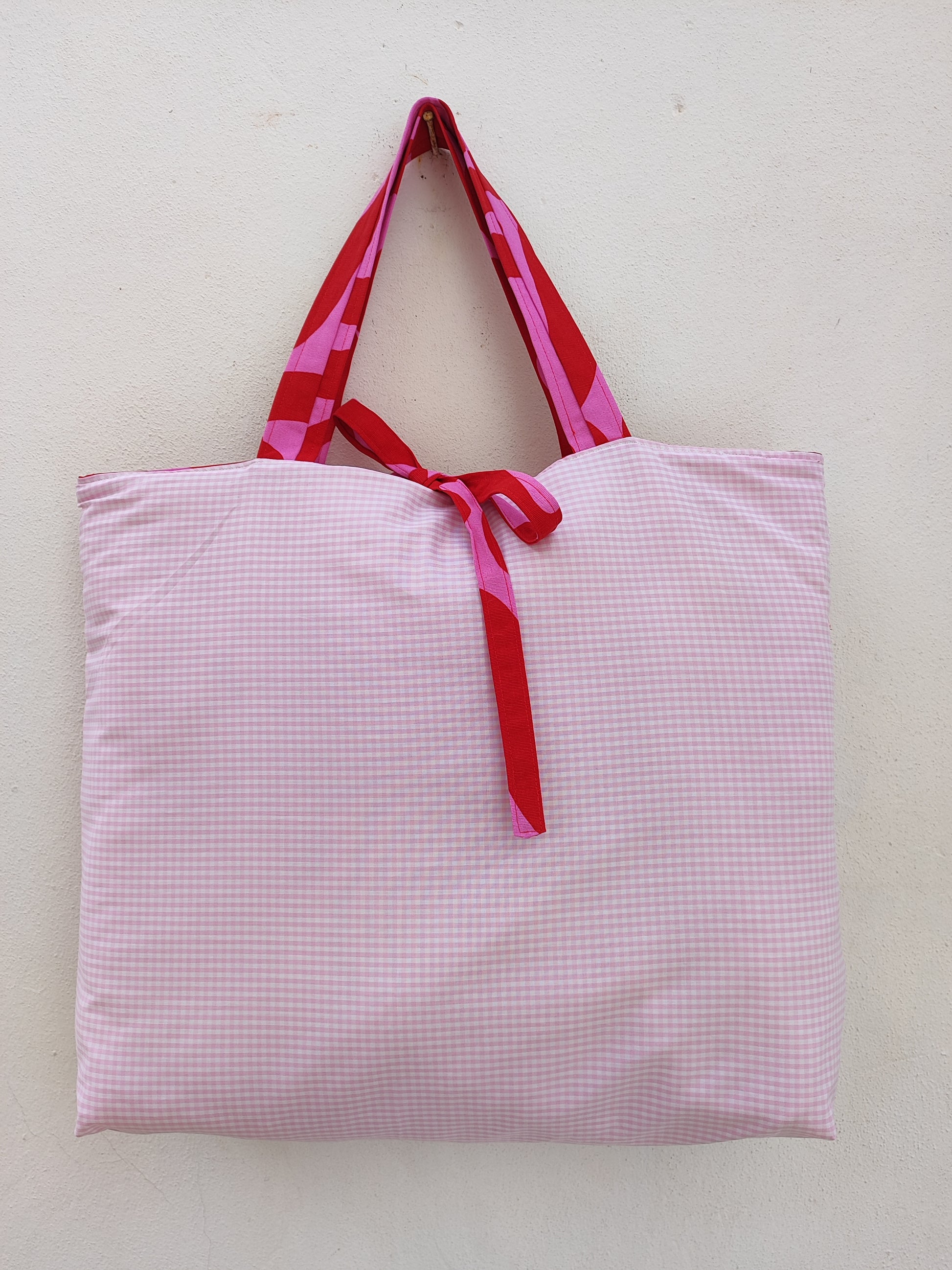 Τσάντα Παραλίας Διπλής Όψης – Χειροποίητη, Πολύχρωμη & Ευρύχωρη '' ροζ κόκκινο - ροζ καρό''