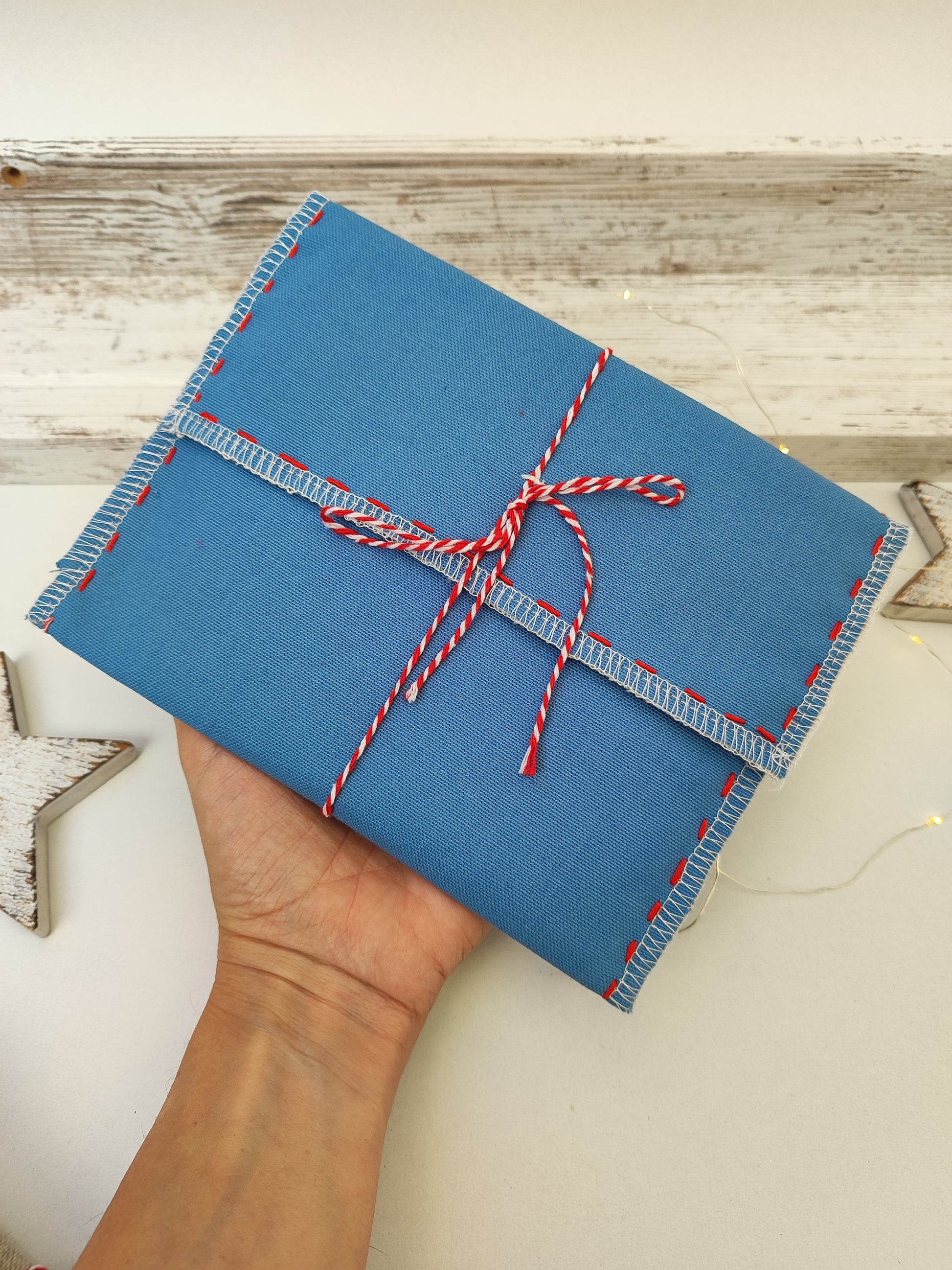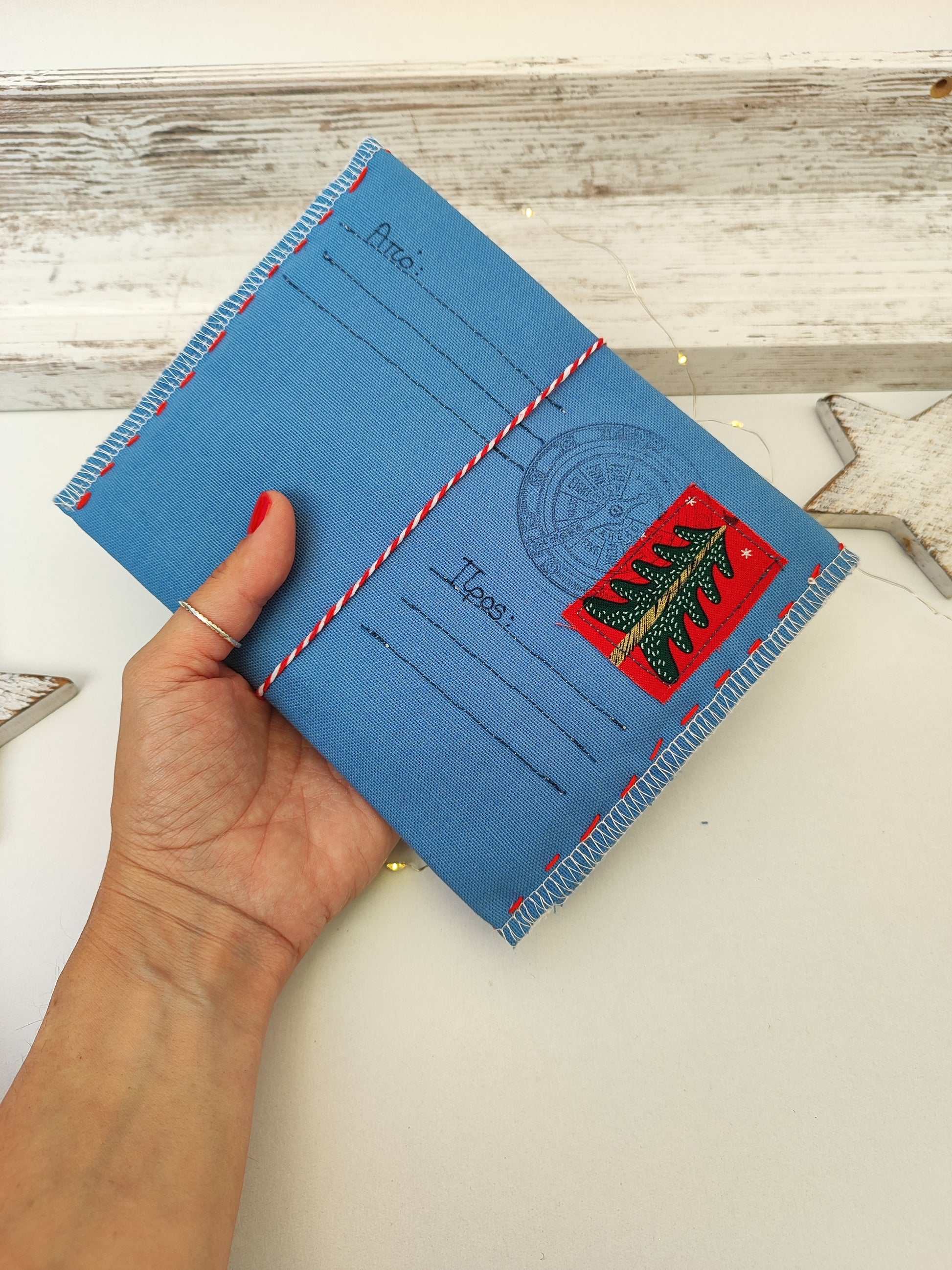 Υφασμάτινος φάκελος για το γράμμα στον Άγιο Βασίλη - γαλάζιο με κόκκινες λεπτομέρειες.