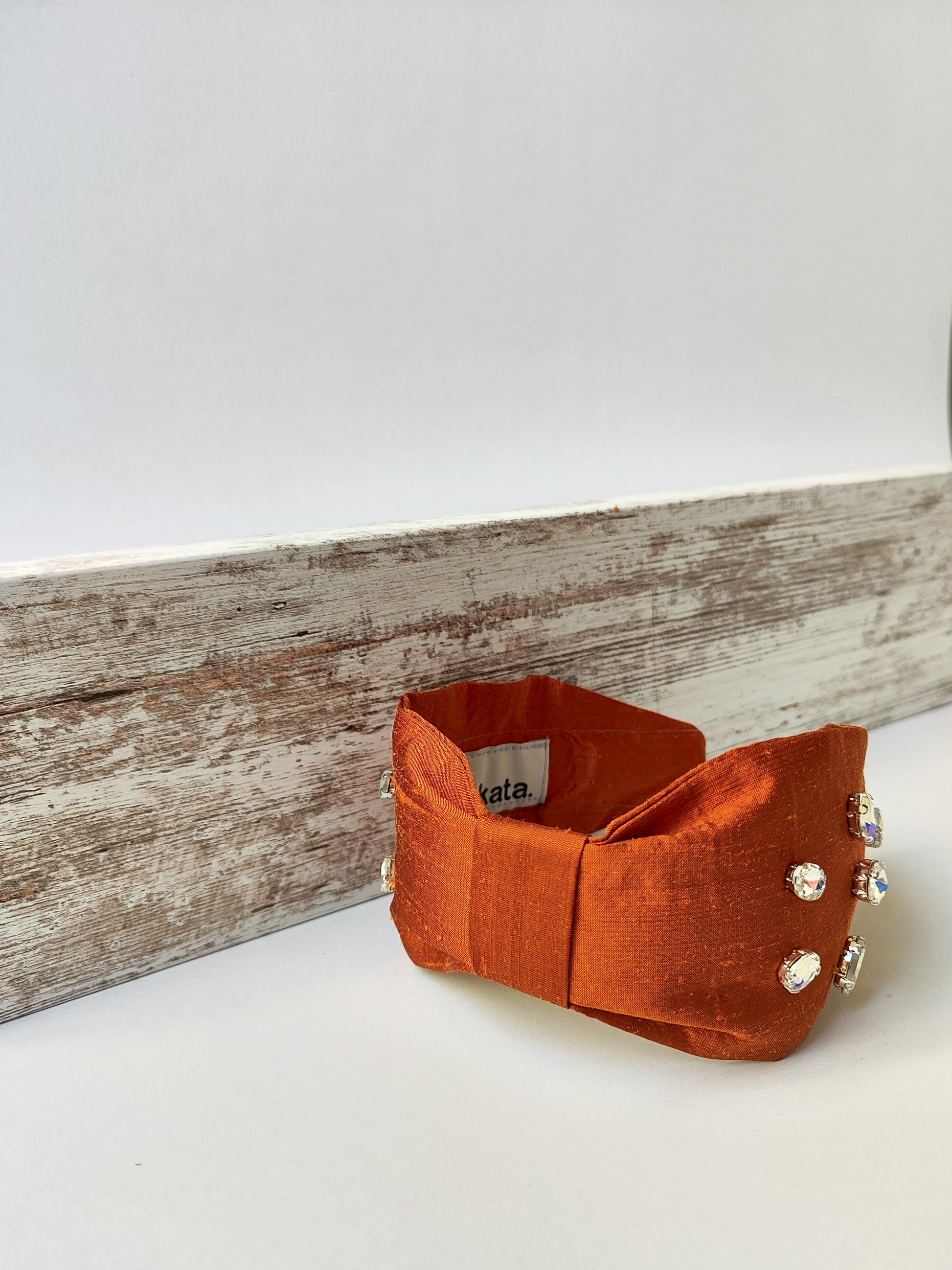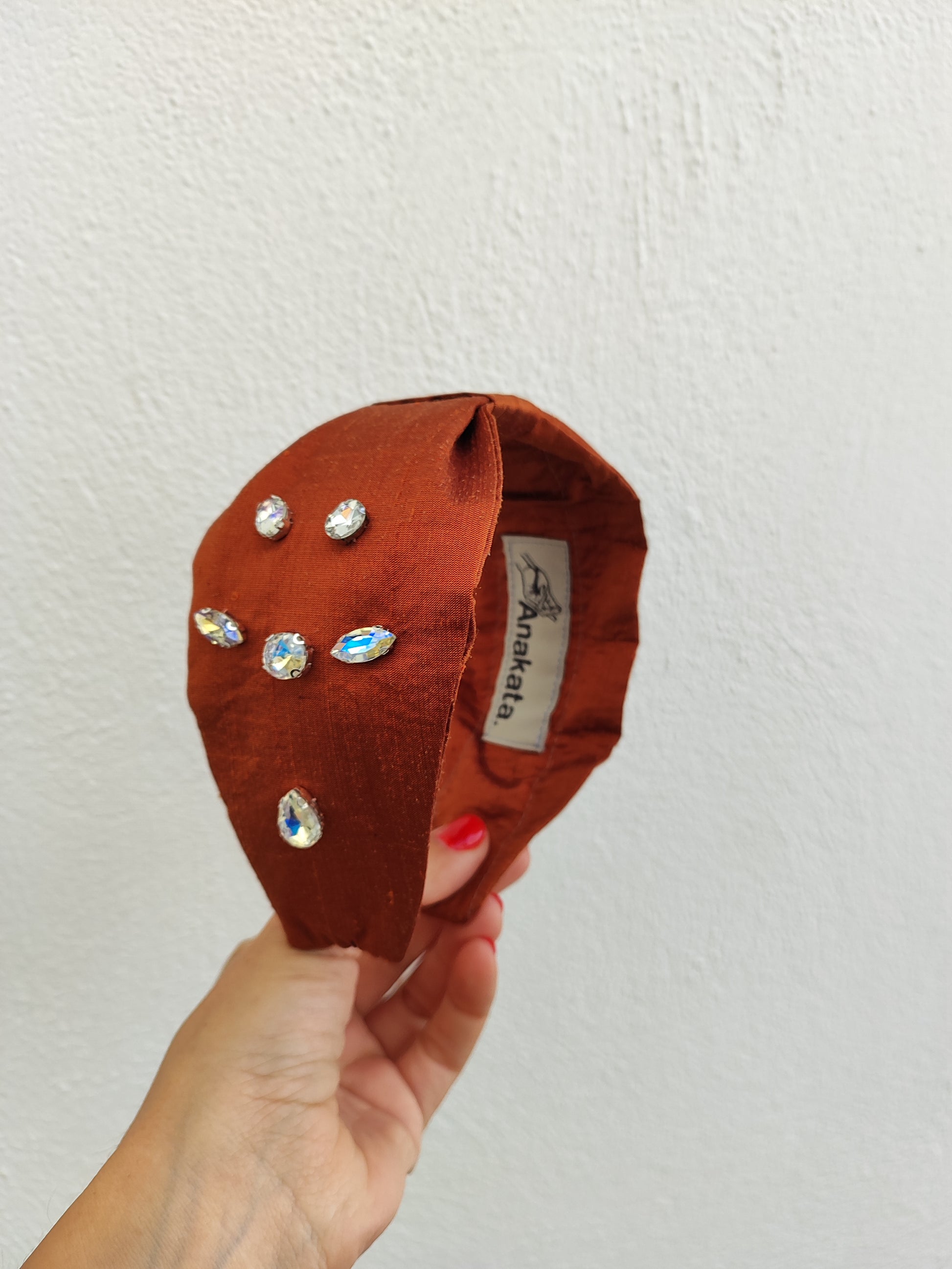 Χειροποίητη στέκα μαλλιών - κεραμμυδί κεντημένη με διάφανα στρας