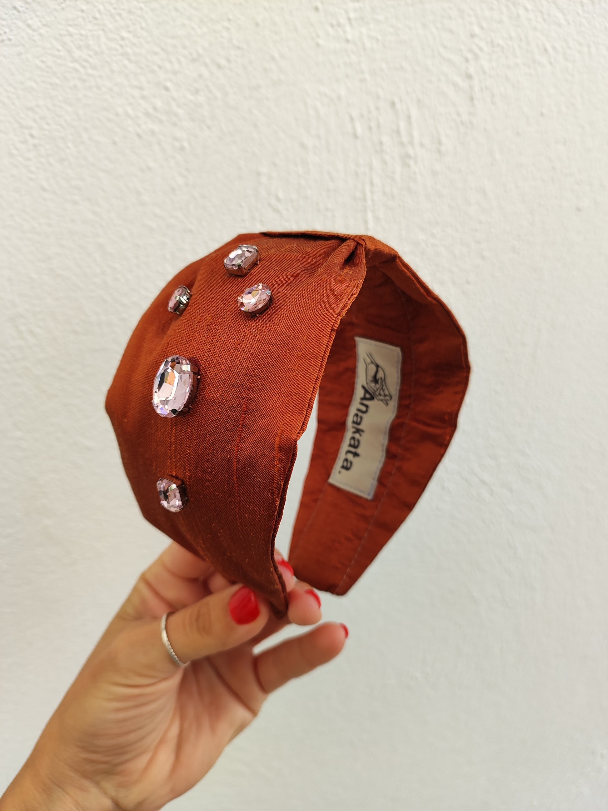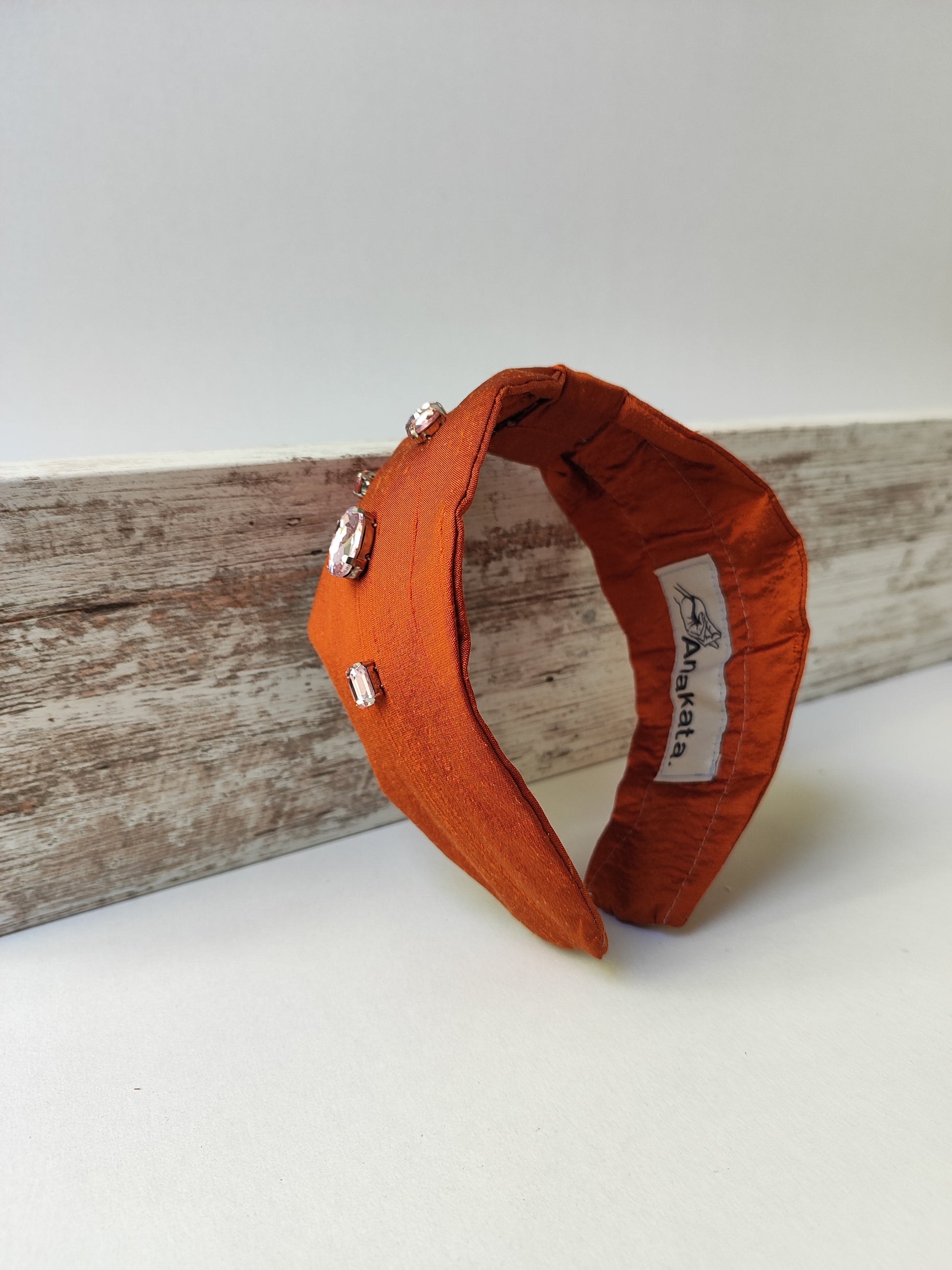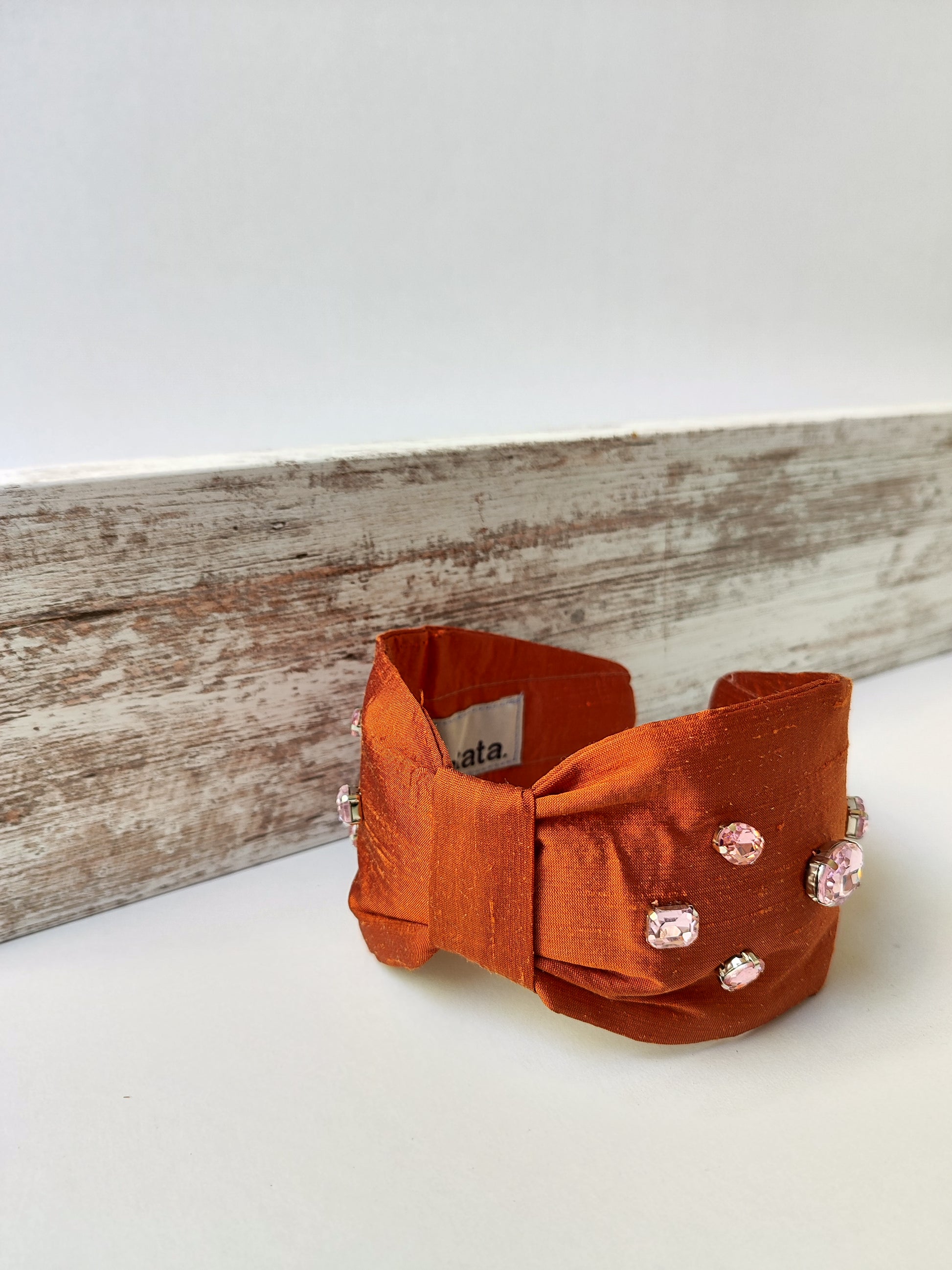 Χειροποίητη στέκα μαλλιών - κεραμμυδί κεντημένη με ροζ στρας