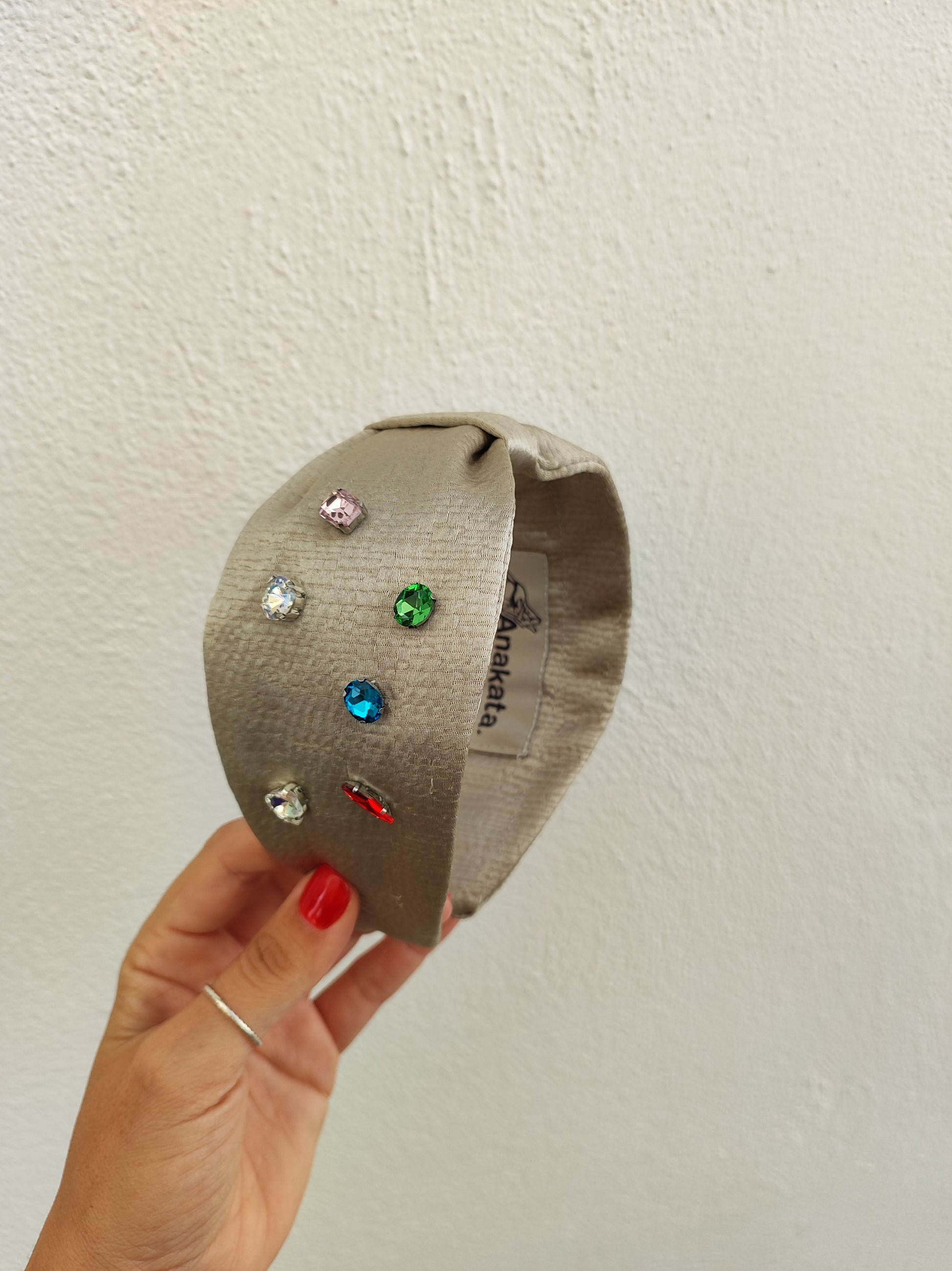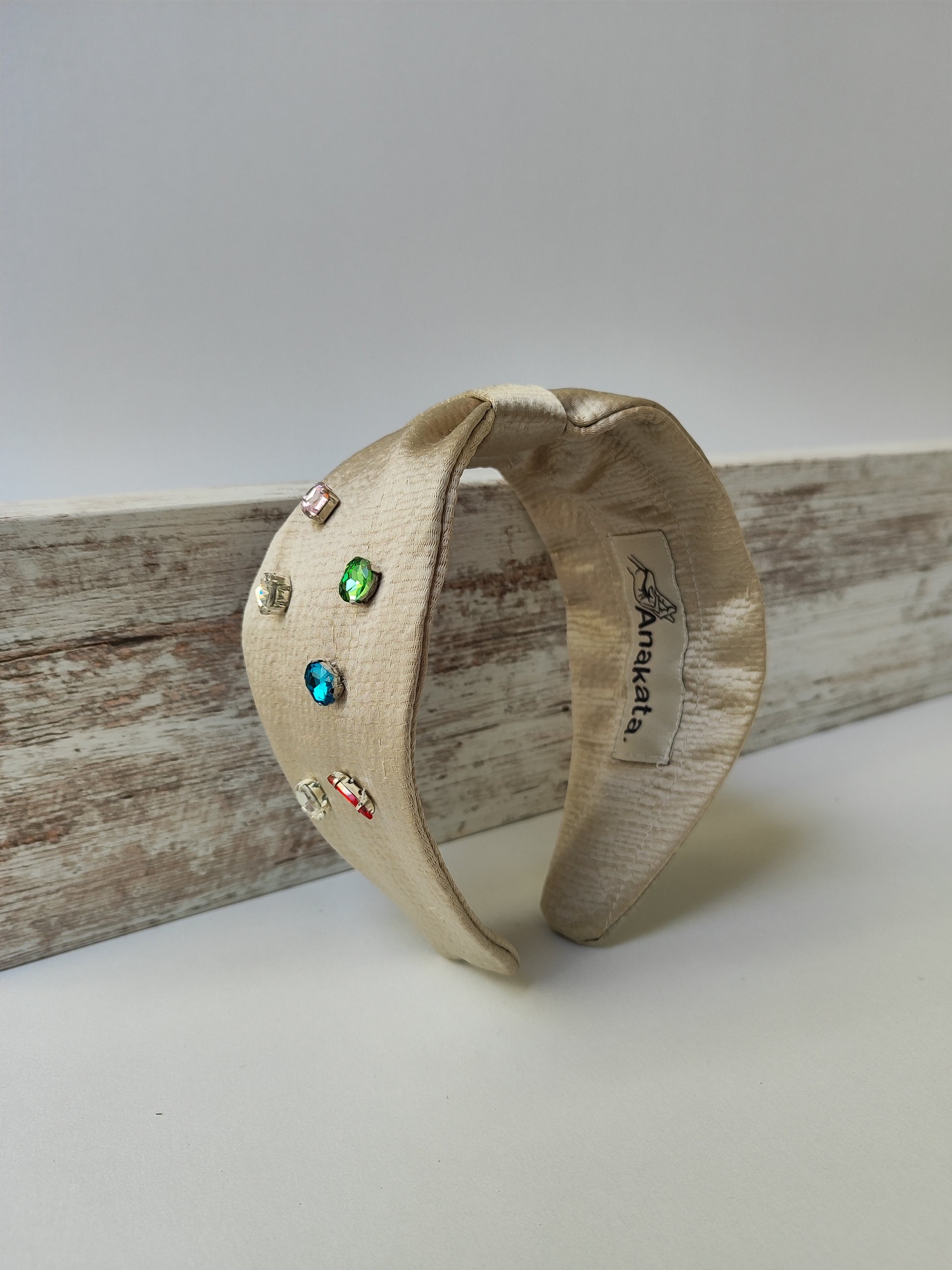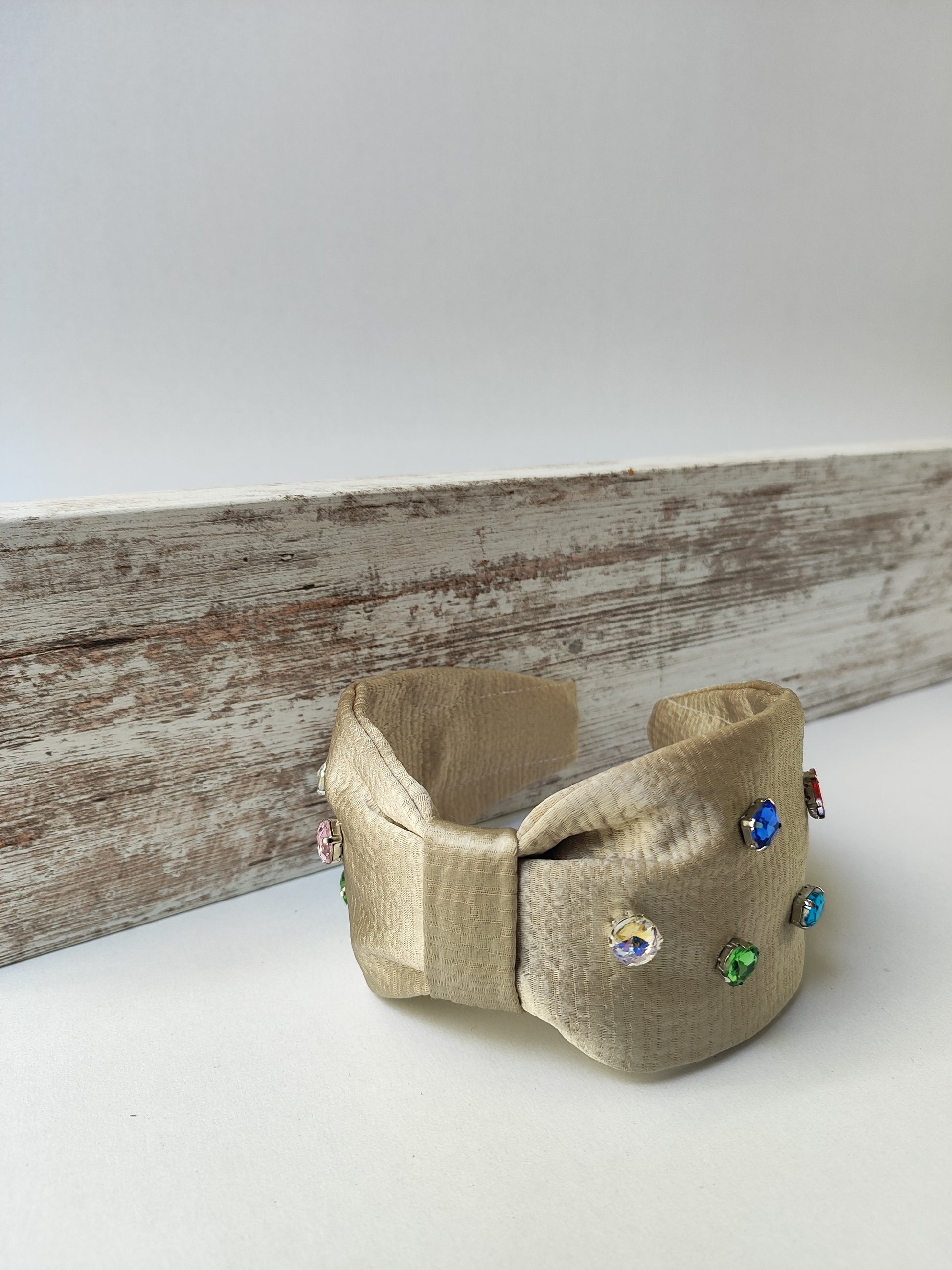 Χειροποίητη στέκα μαλλιών - μπεζ, κεντημένη με πολύχρωμα στρας