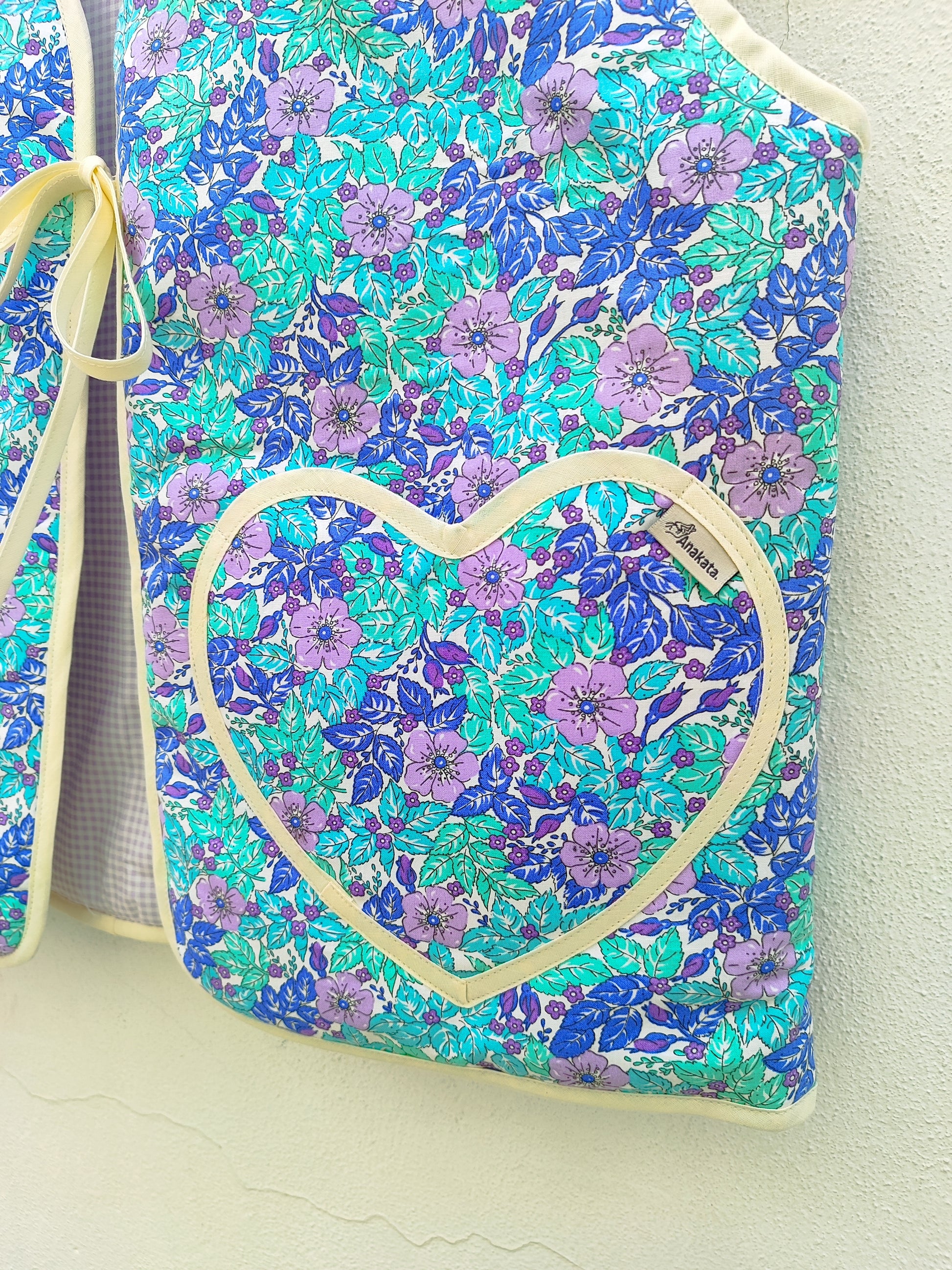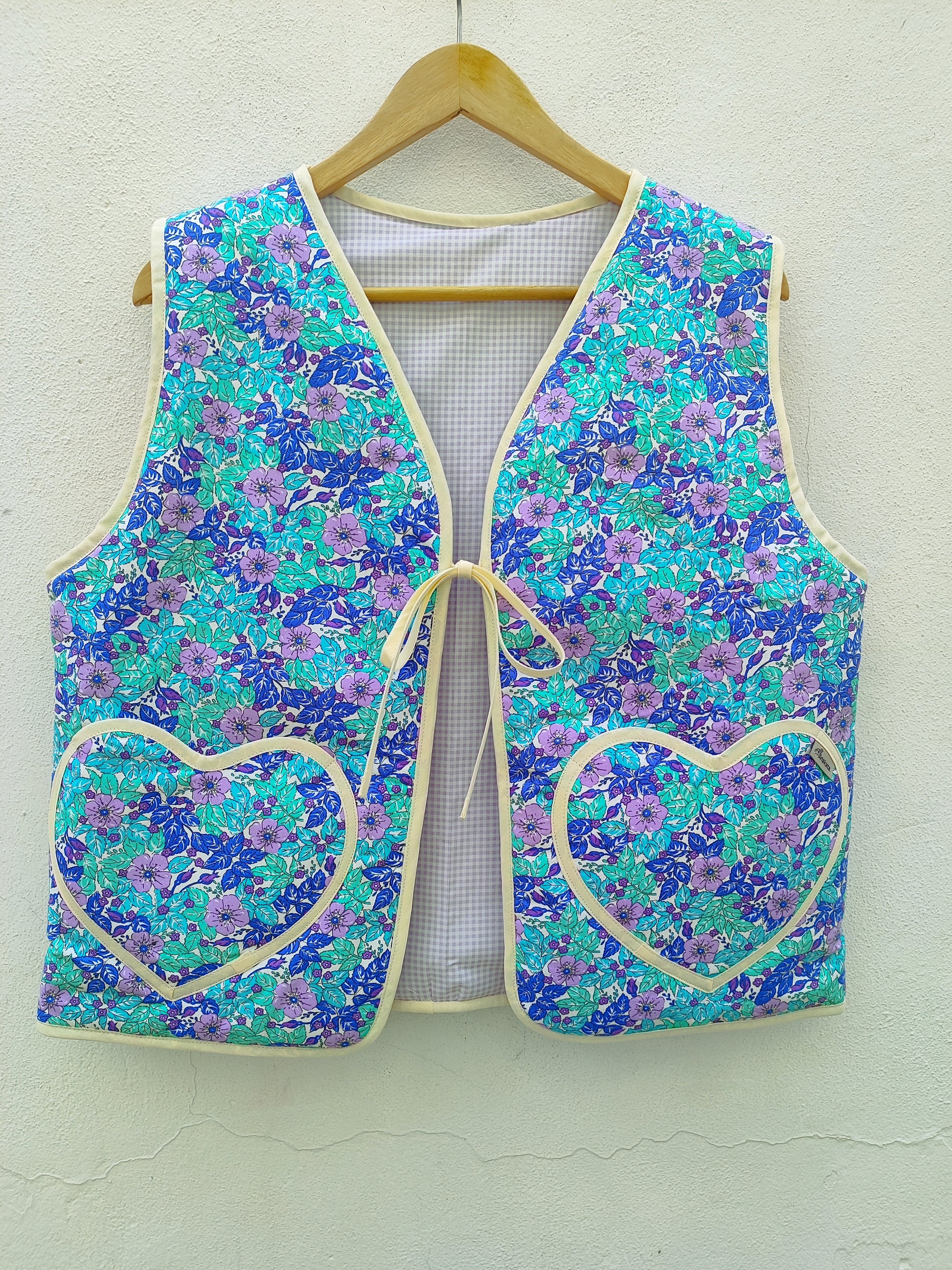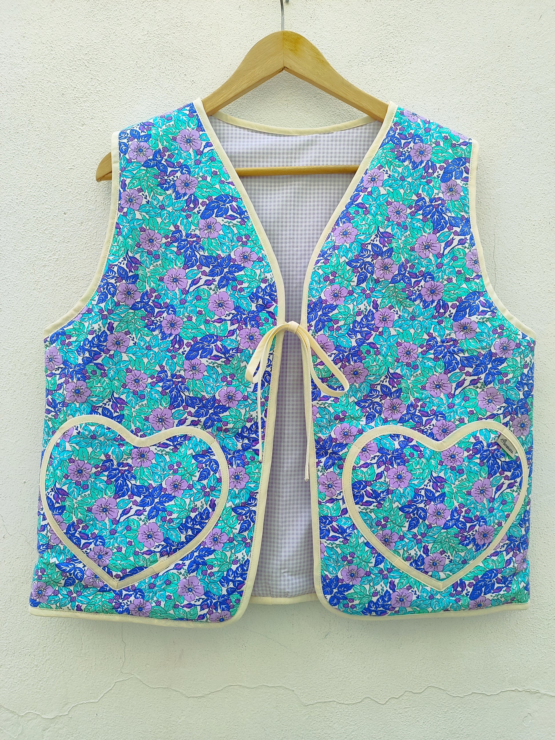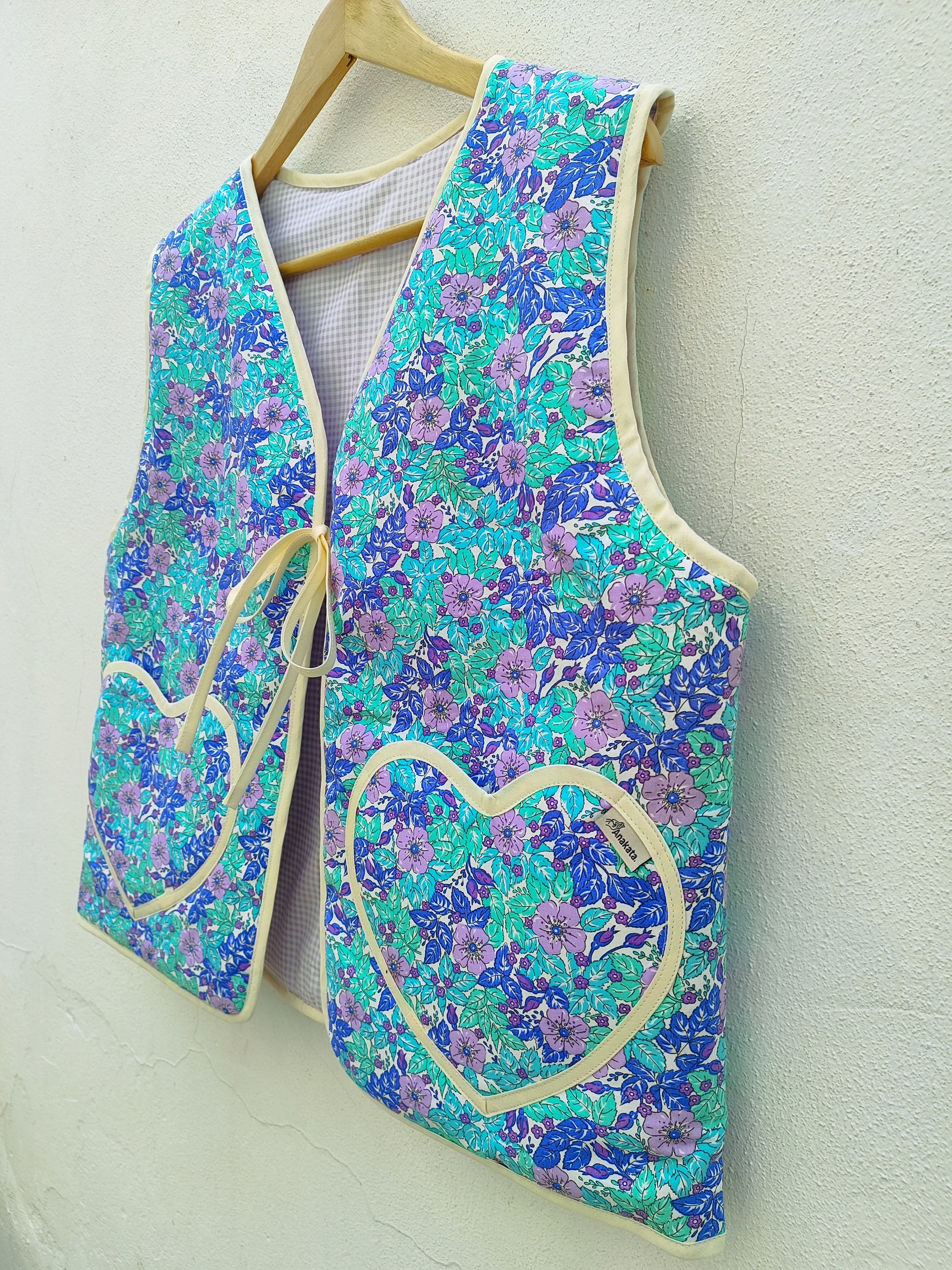 Χειροποίητο γιλέκο διπλής όψης- σιέλ φλοράλ και λιλά καρό, με τσέπες σε σχήμα καρδιάς.