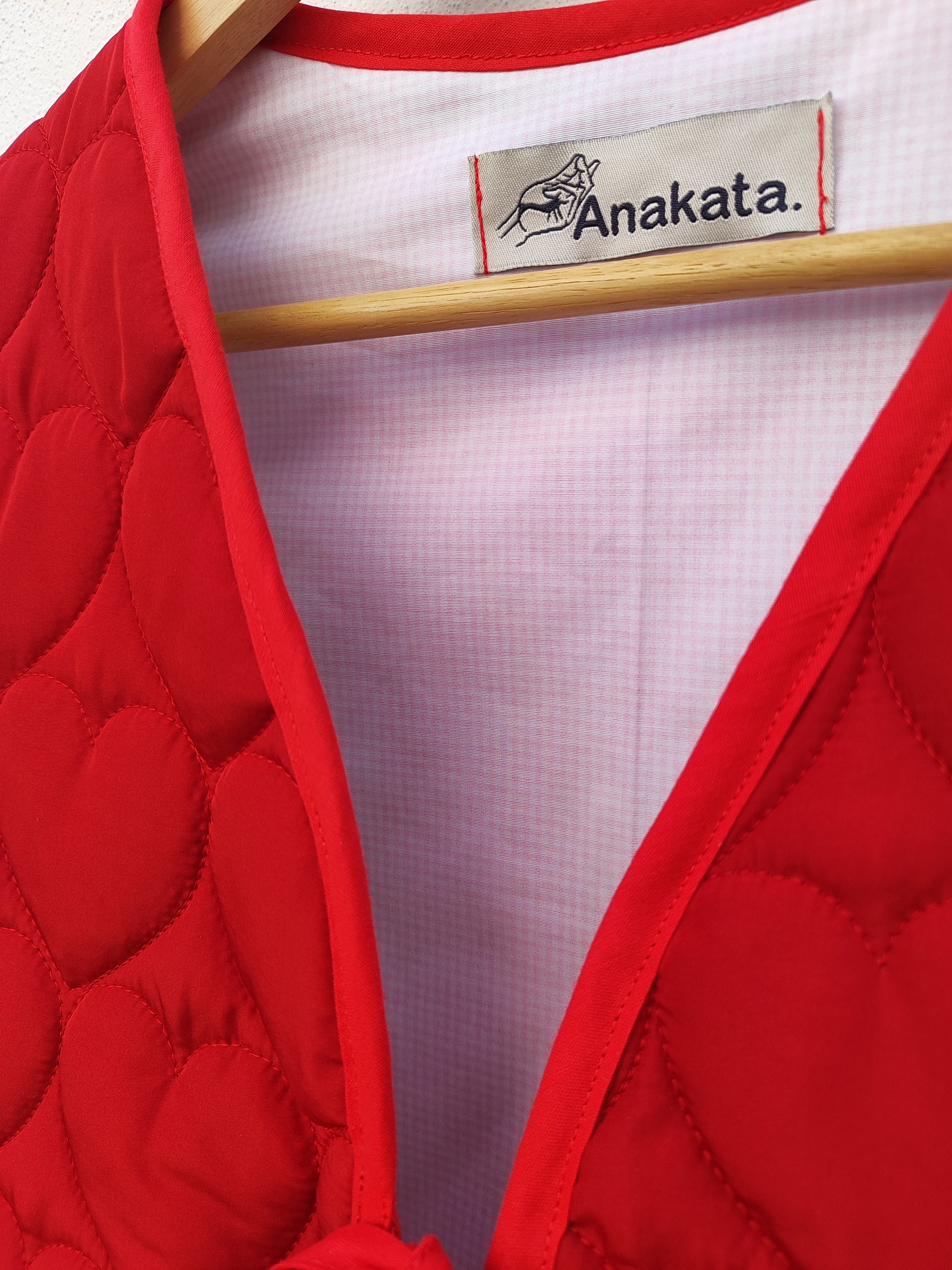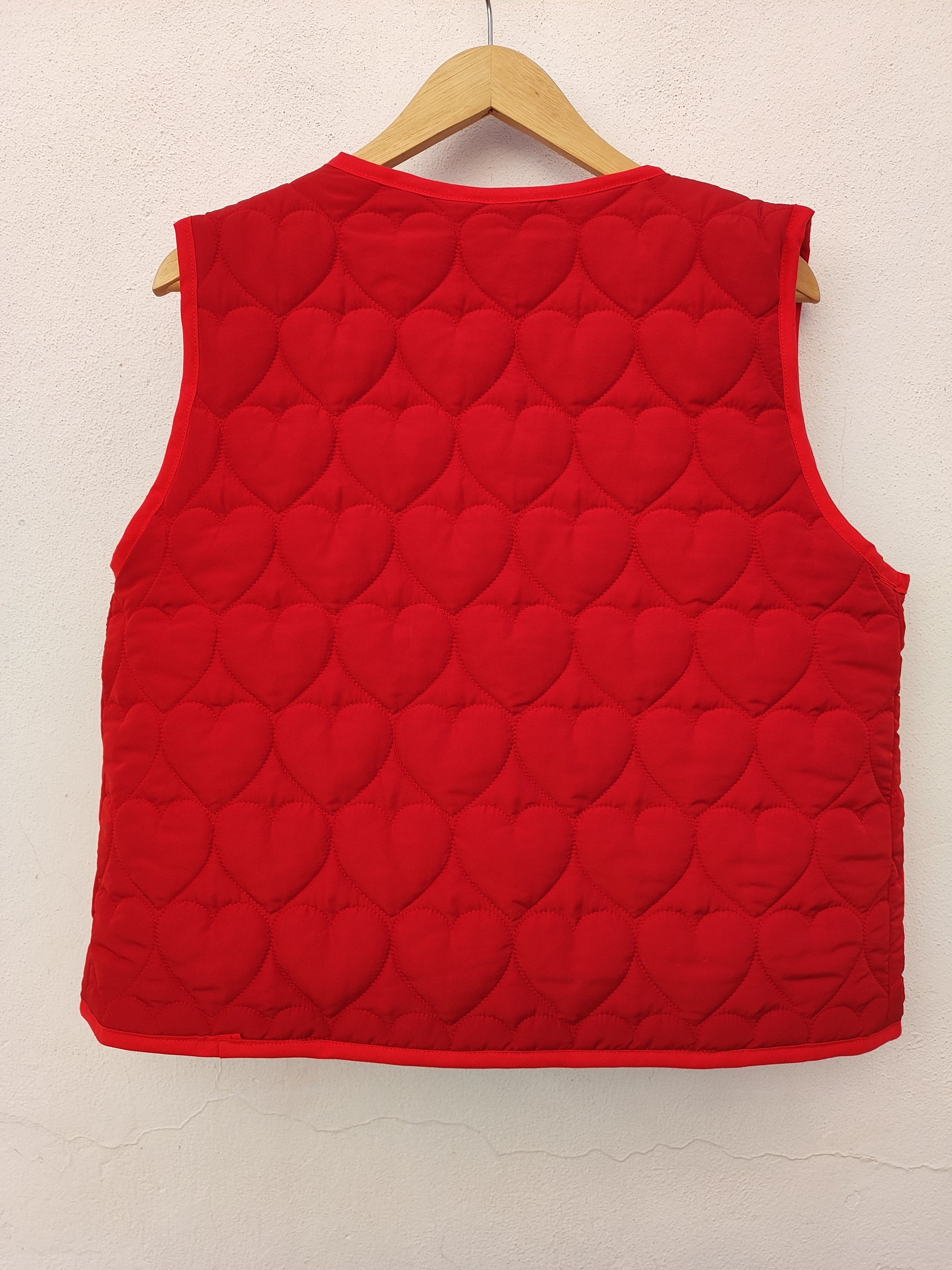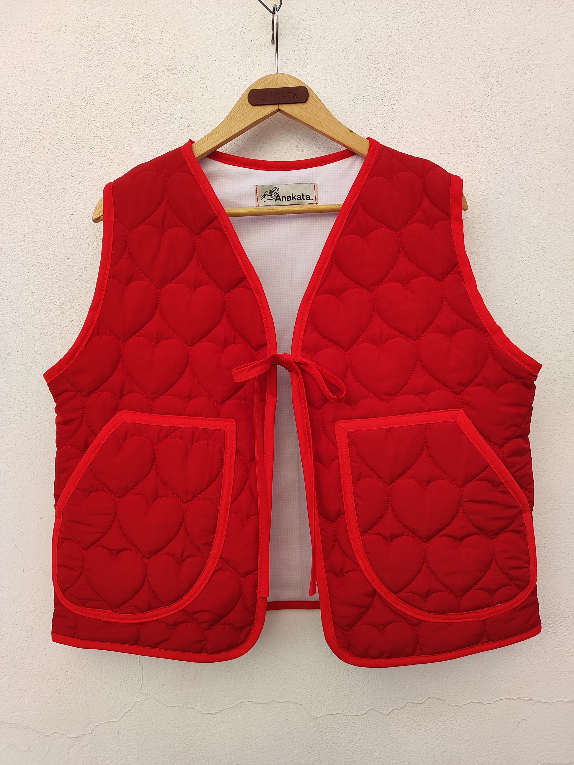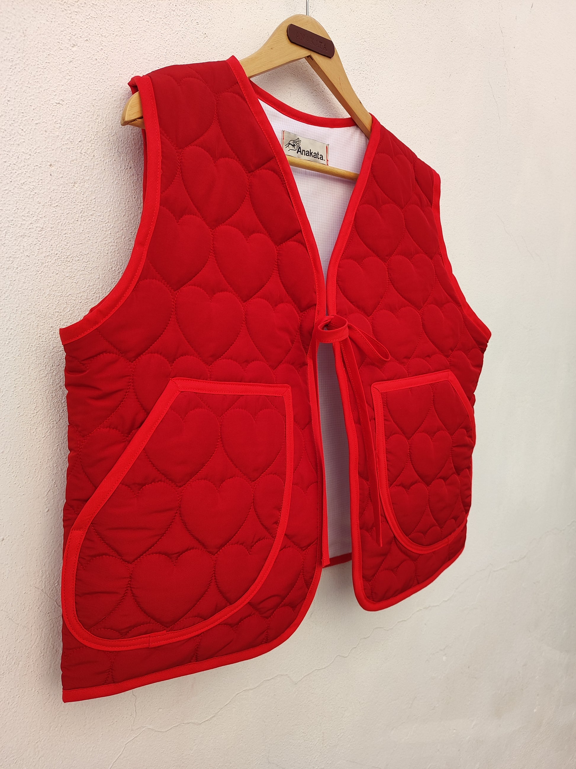 Χειροποίητο γιλέκο κόκκινο καπιτονέ με καρδιές και φιόγκο για κλείσιμο.