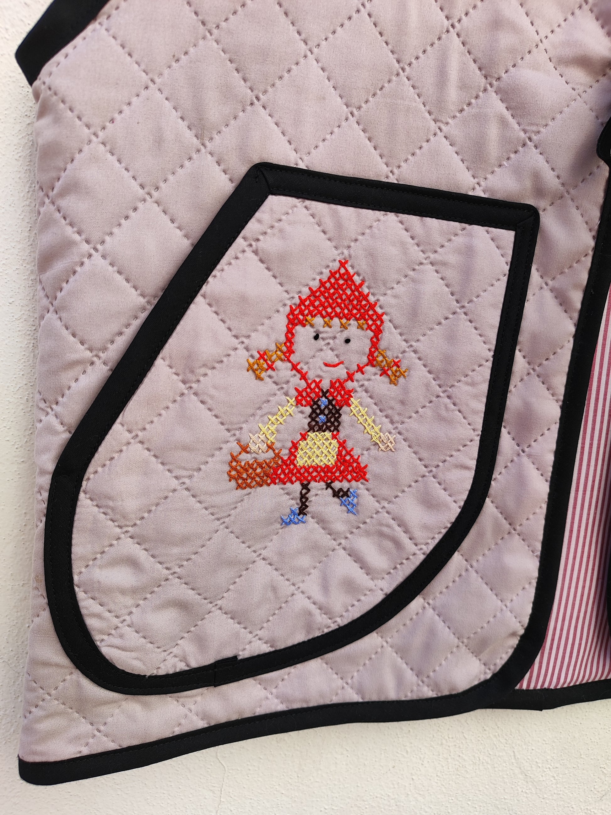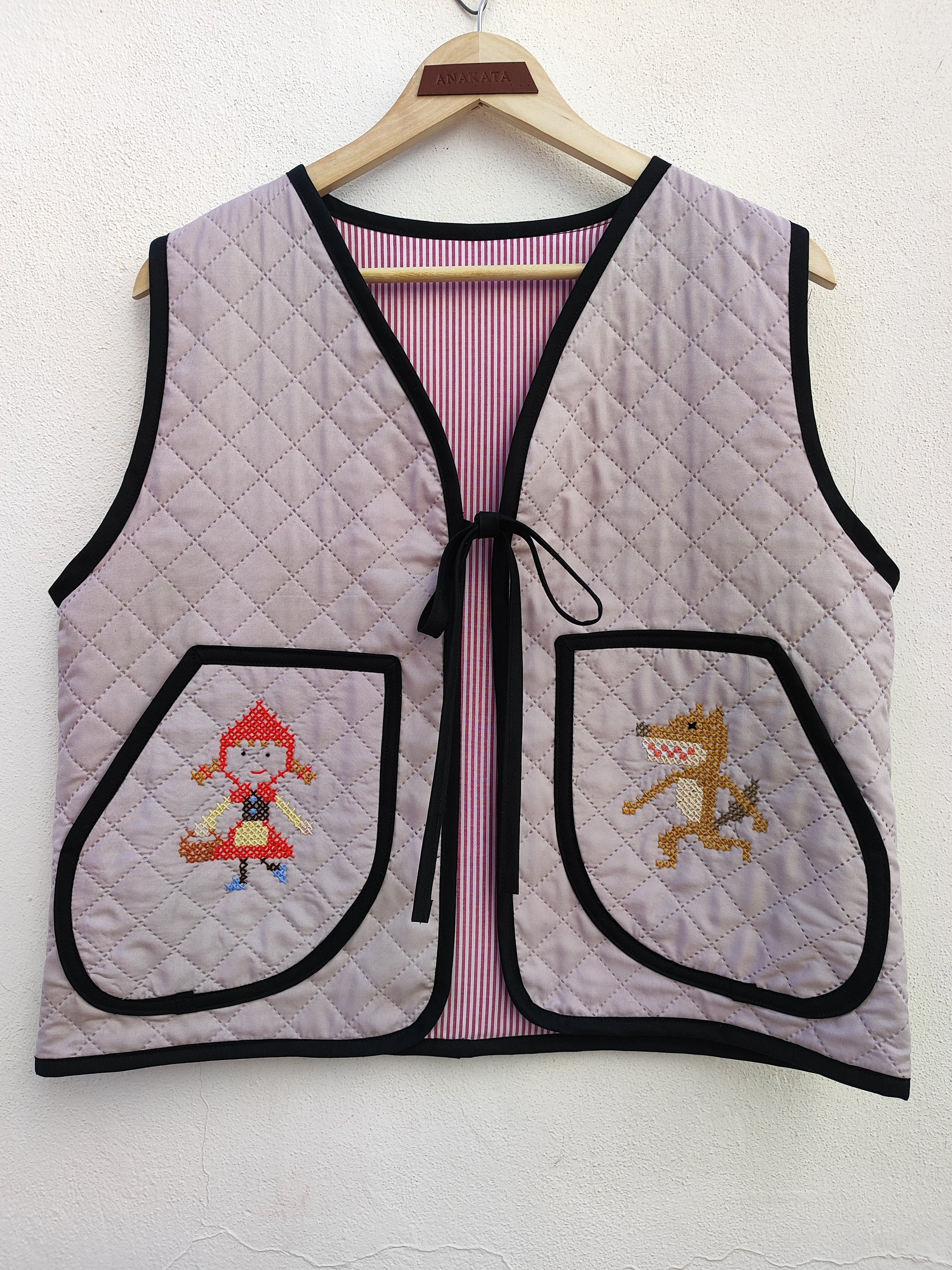 Η έμπνευση για το συγκεκριμένο γιλέκο ήρθε το καλοκαίρι. Εκεί κάπου στα βουνά και στα λαγκάδια που μάζευα φρούτα, χόρτα και λαχανικά με ένα ψάθινο καλάθι ένιωσα σαν την κοκκινοσκουφίτσα που πάει στη γιαγιά της. Έψαξα και βρήκα το συγκεκριμένο ύφασμα το οποίο κέντησα. Και ενώ θα μπορούσα να βρω πιο μοντέρνο σχέδιο για κοκκινοσκουφίτσα και λύκο, προτίμησα το συγκεκριμένο που είναι πιο παραδοσιακό.