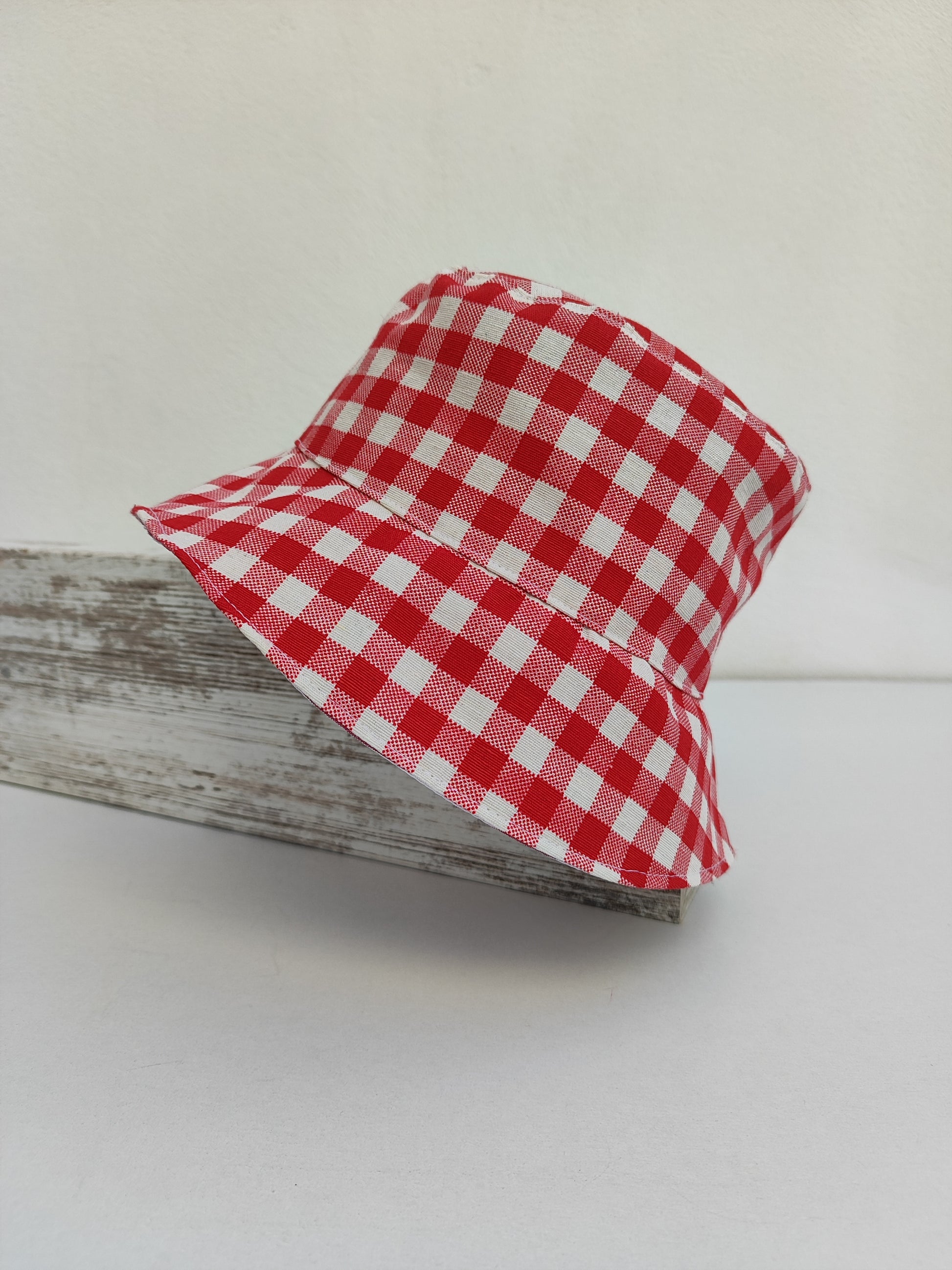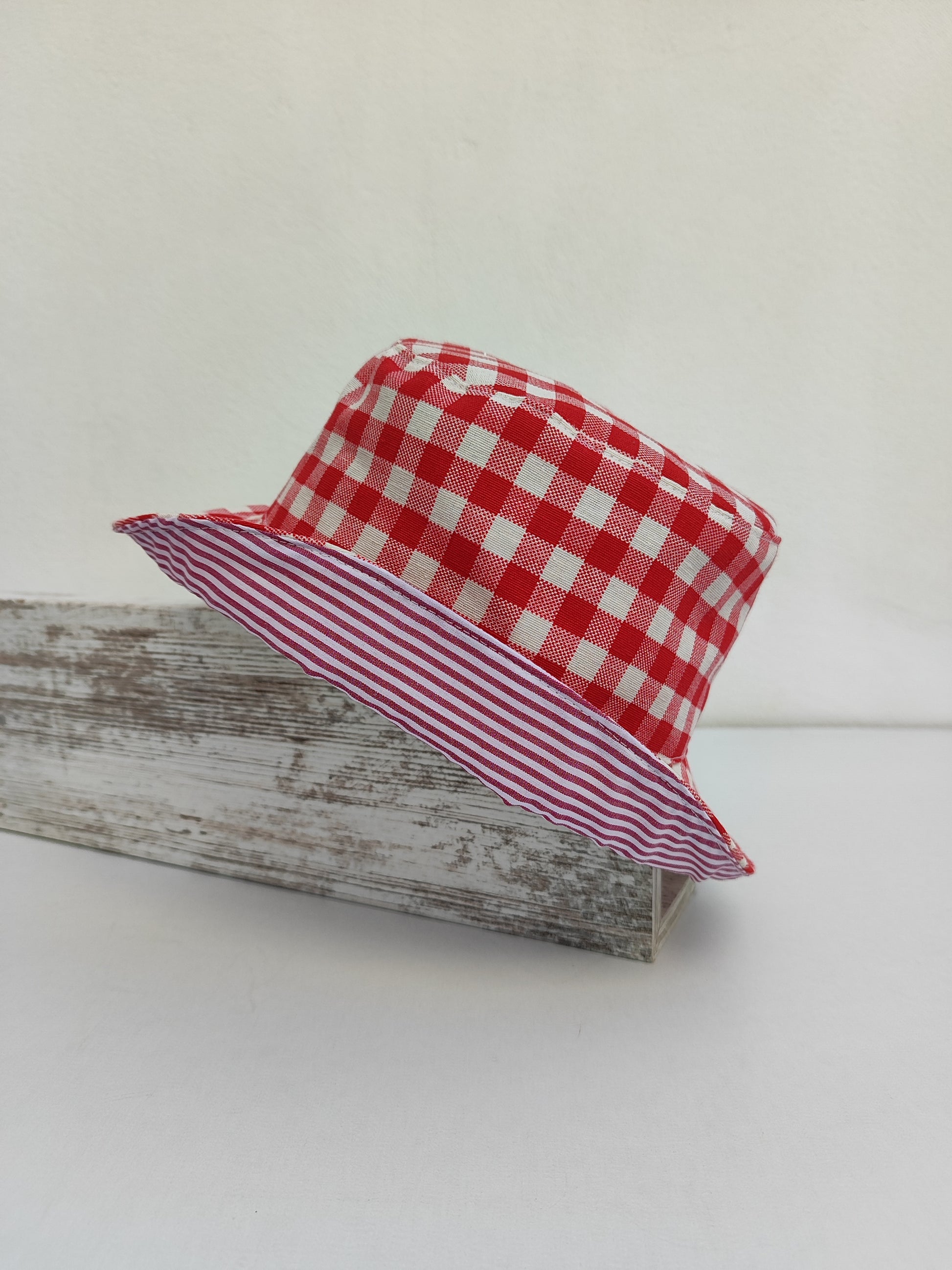 Χειροποίητο καπέλο διπλής όψης ''κόκκινο καρό - ριγέ μπορντό''
