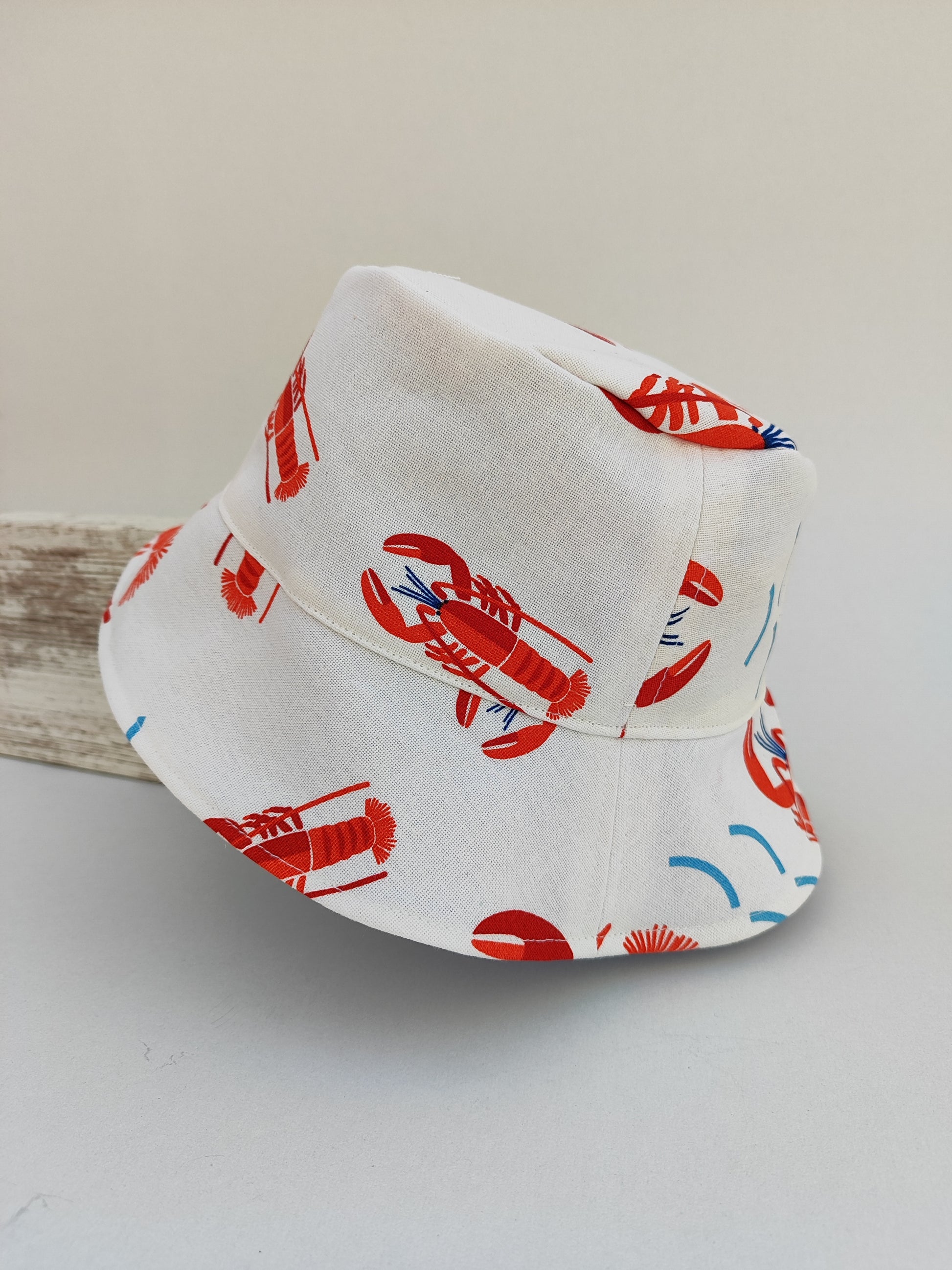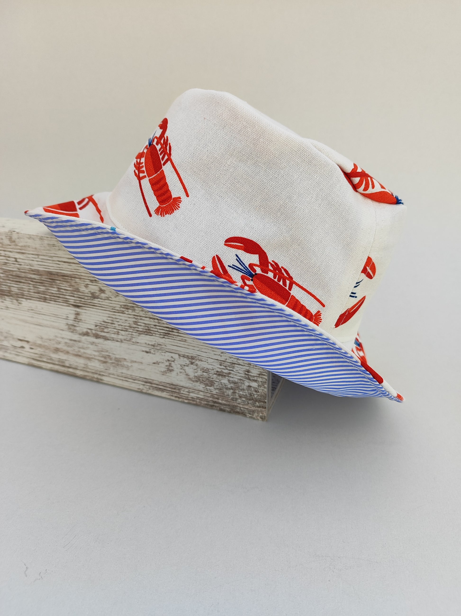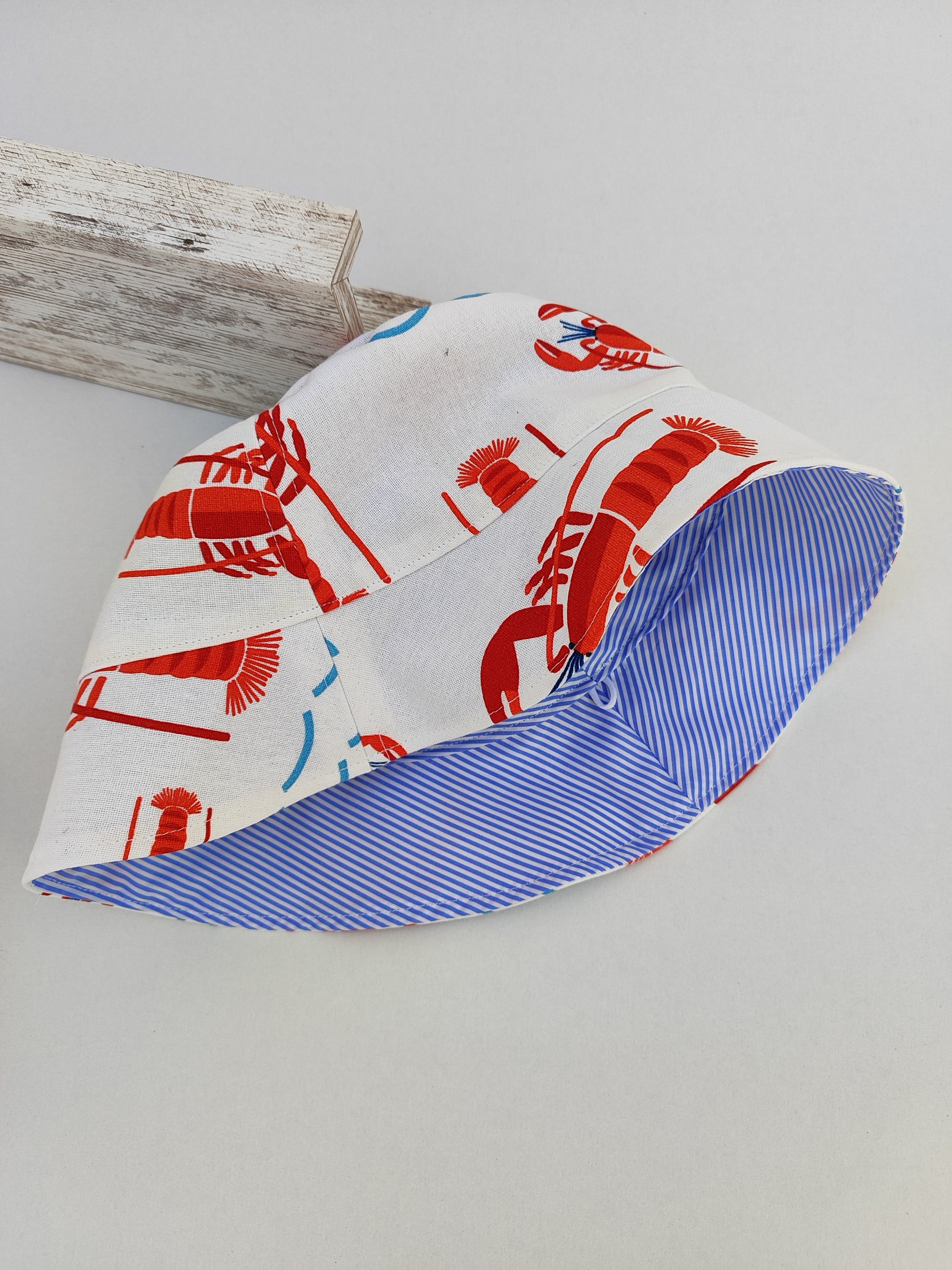 Χειροποίητο καπέλο διπλής όψης ''λευκό με καραβίδες -ριγέ γαλάζιο''