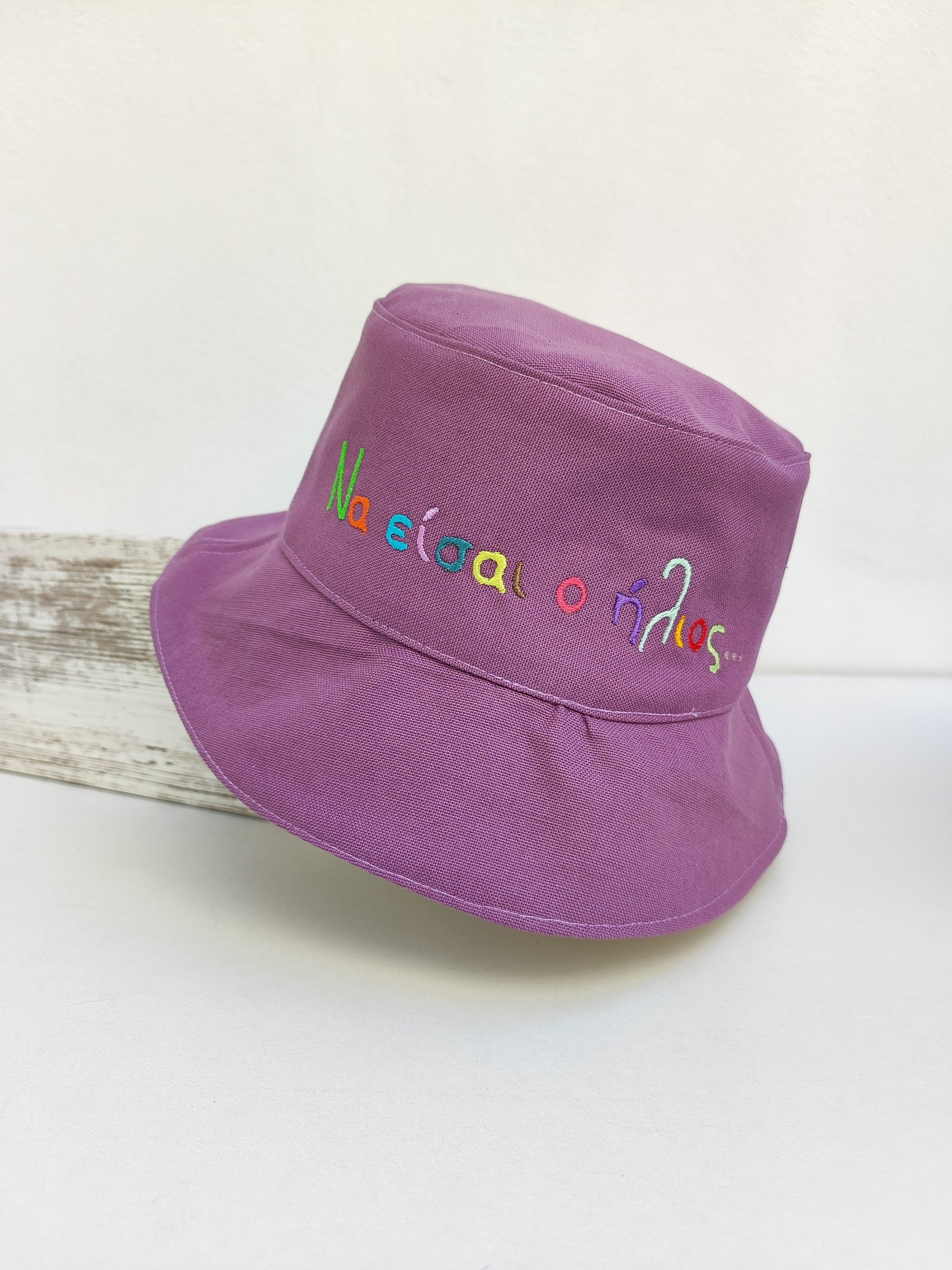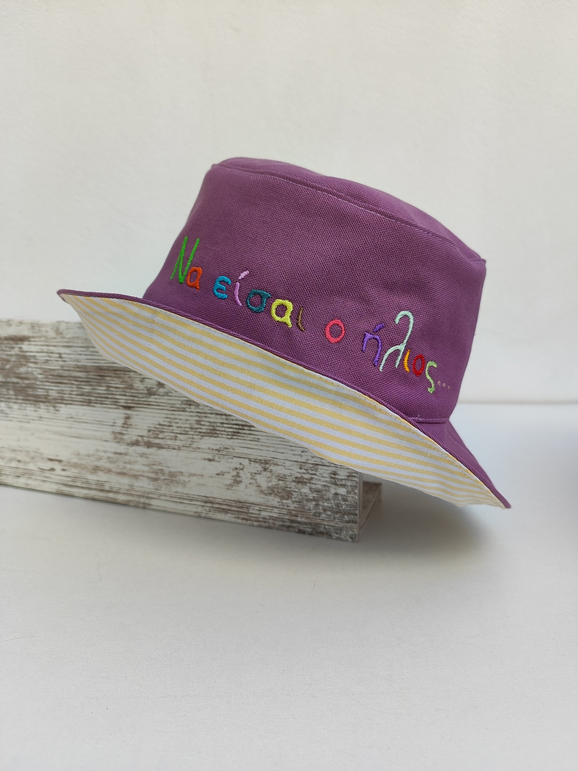 Χειροποίητο καπέλο διπλής όψης ''Να είσαι ο ήλιος'' μωβ με πολύχρωμα γράμματα και κίτρινο ριγέ