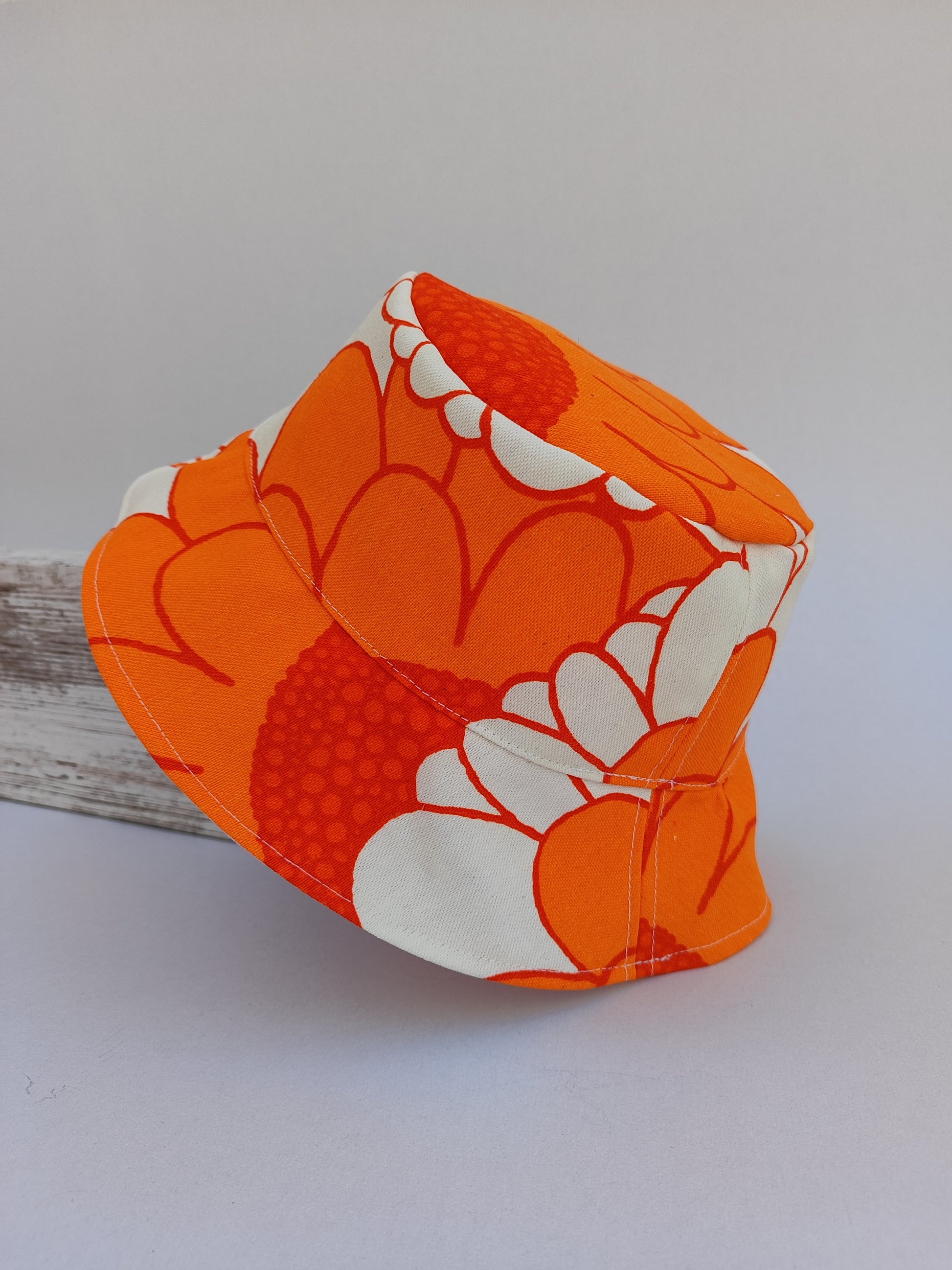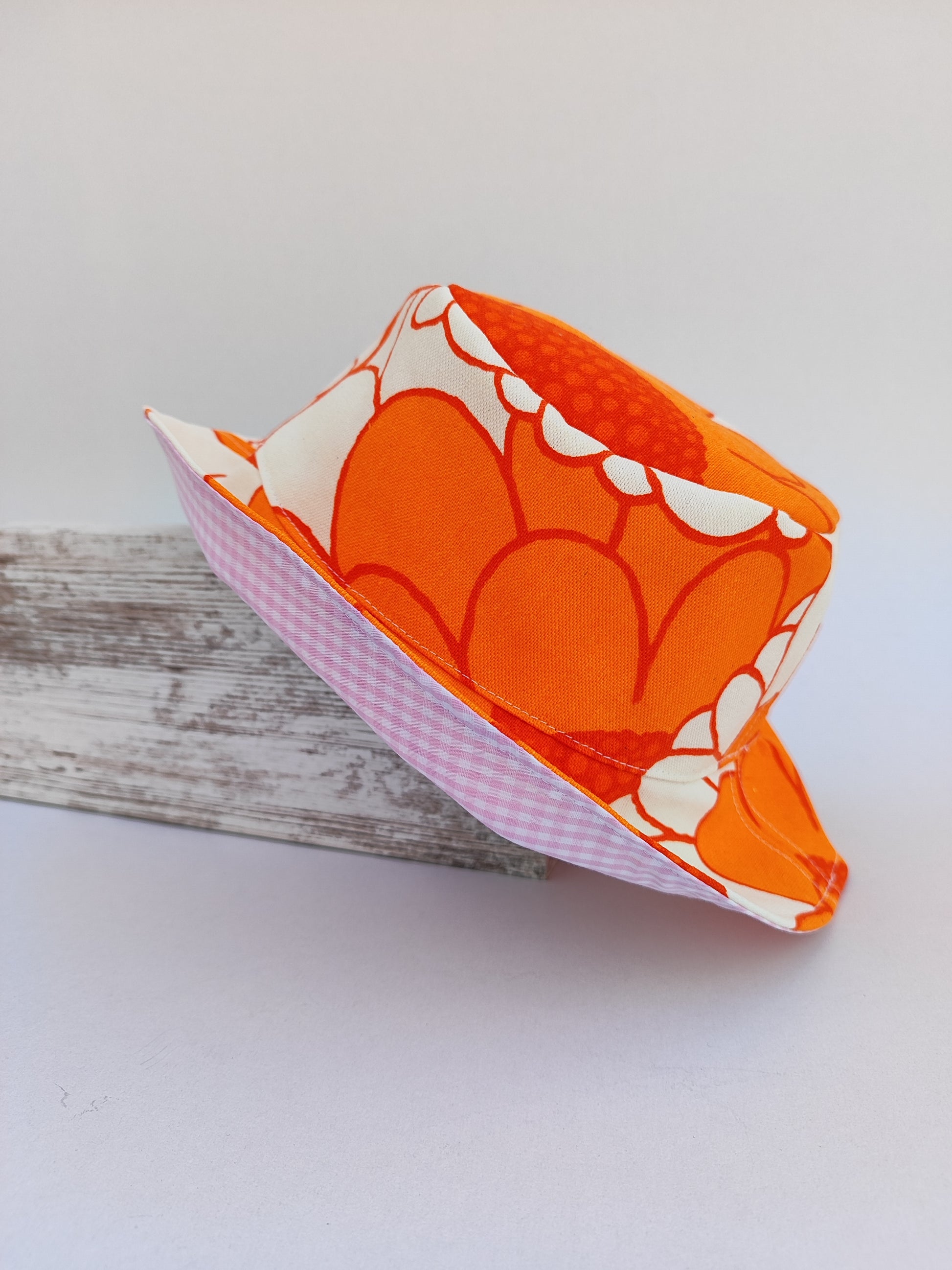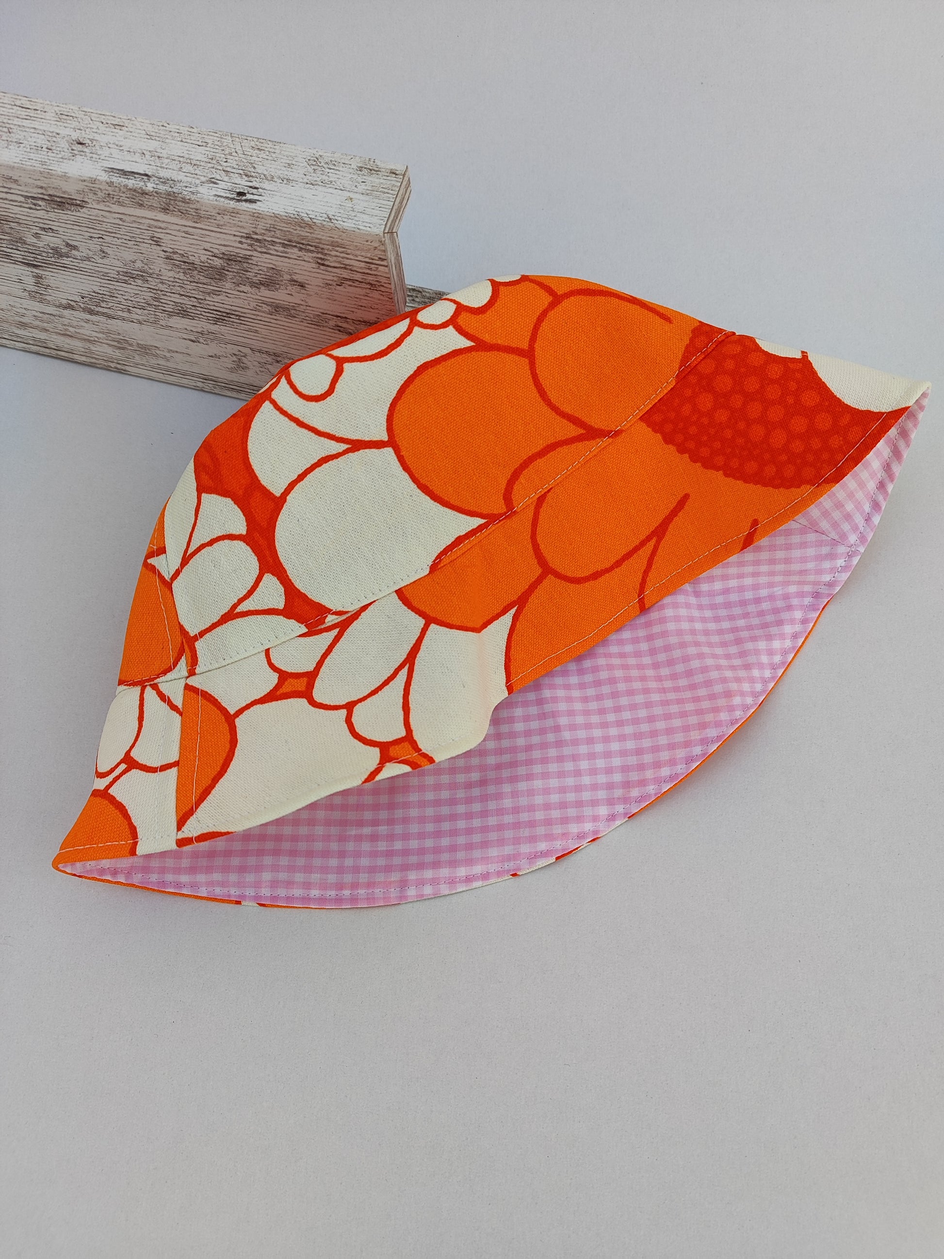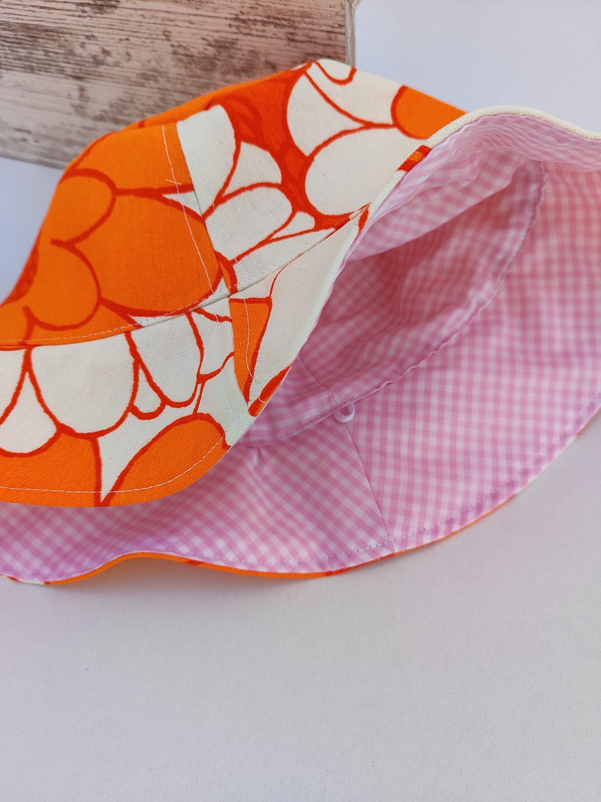 Χειροποίητο καπέλο διπλής όψης ''πορτοκαλί λουλούδια - ροζ καρό''