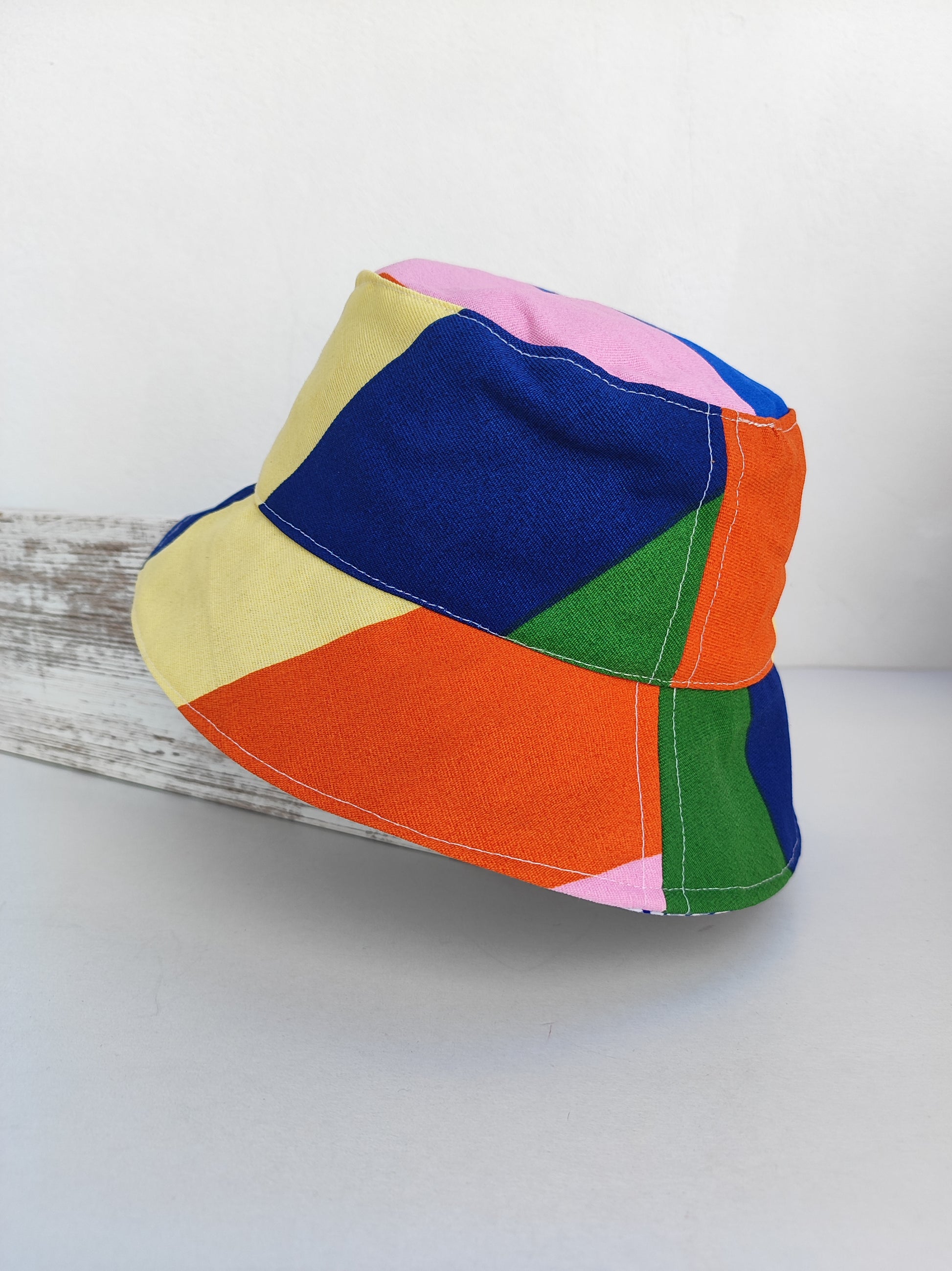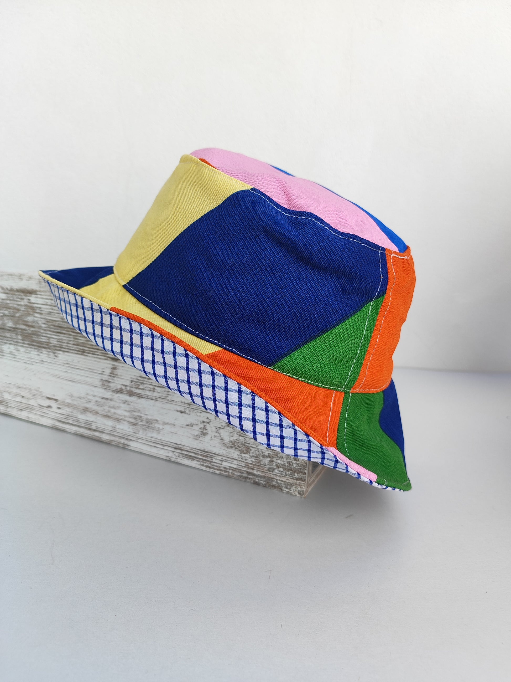 Χειροποίητο καπέλο διπλής όψης ''φαρδιές γραμμές - μπλε καρό''