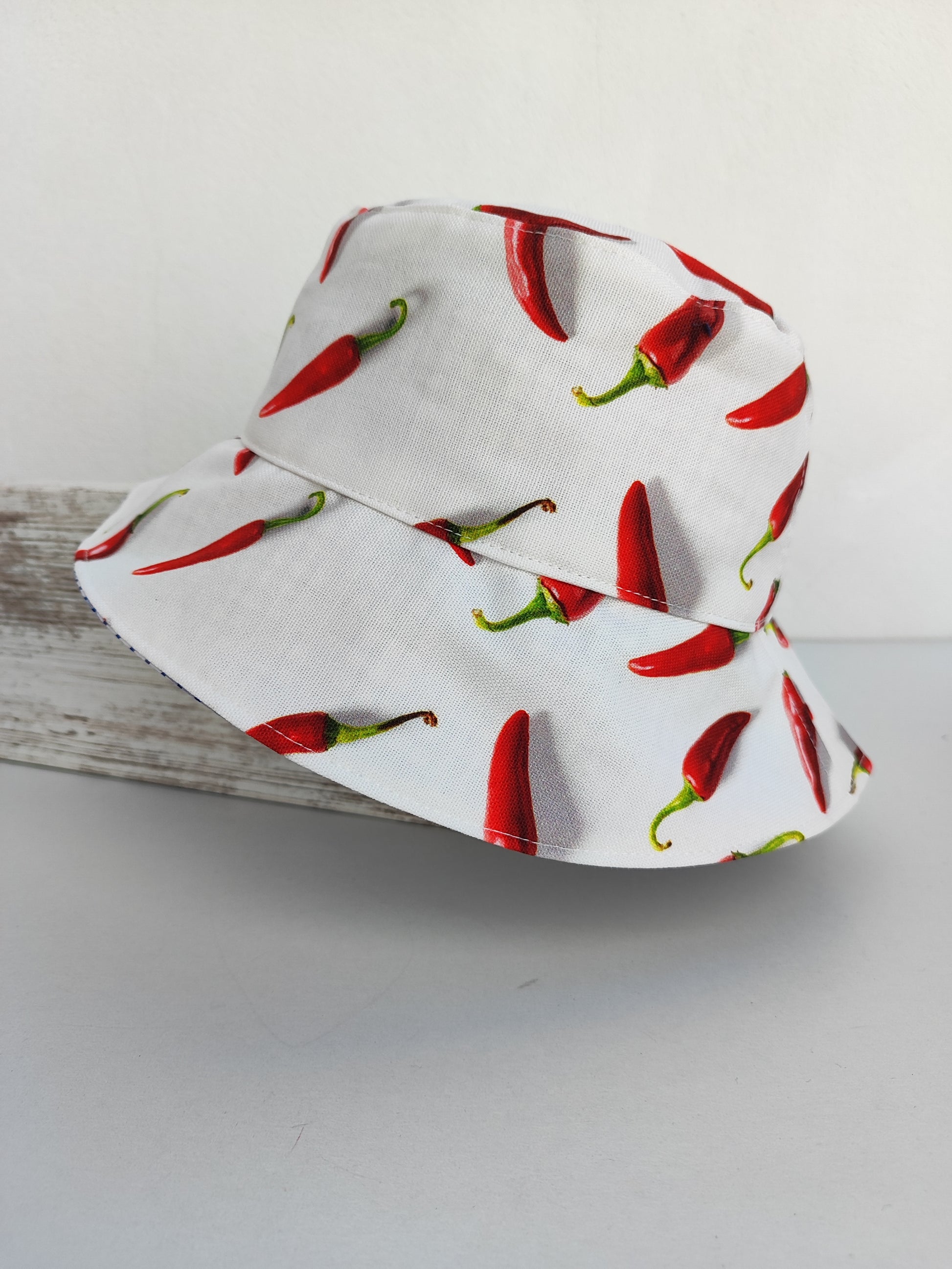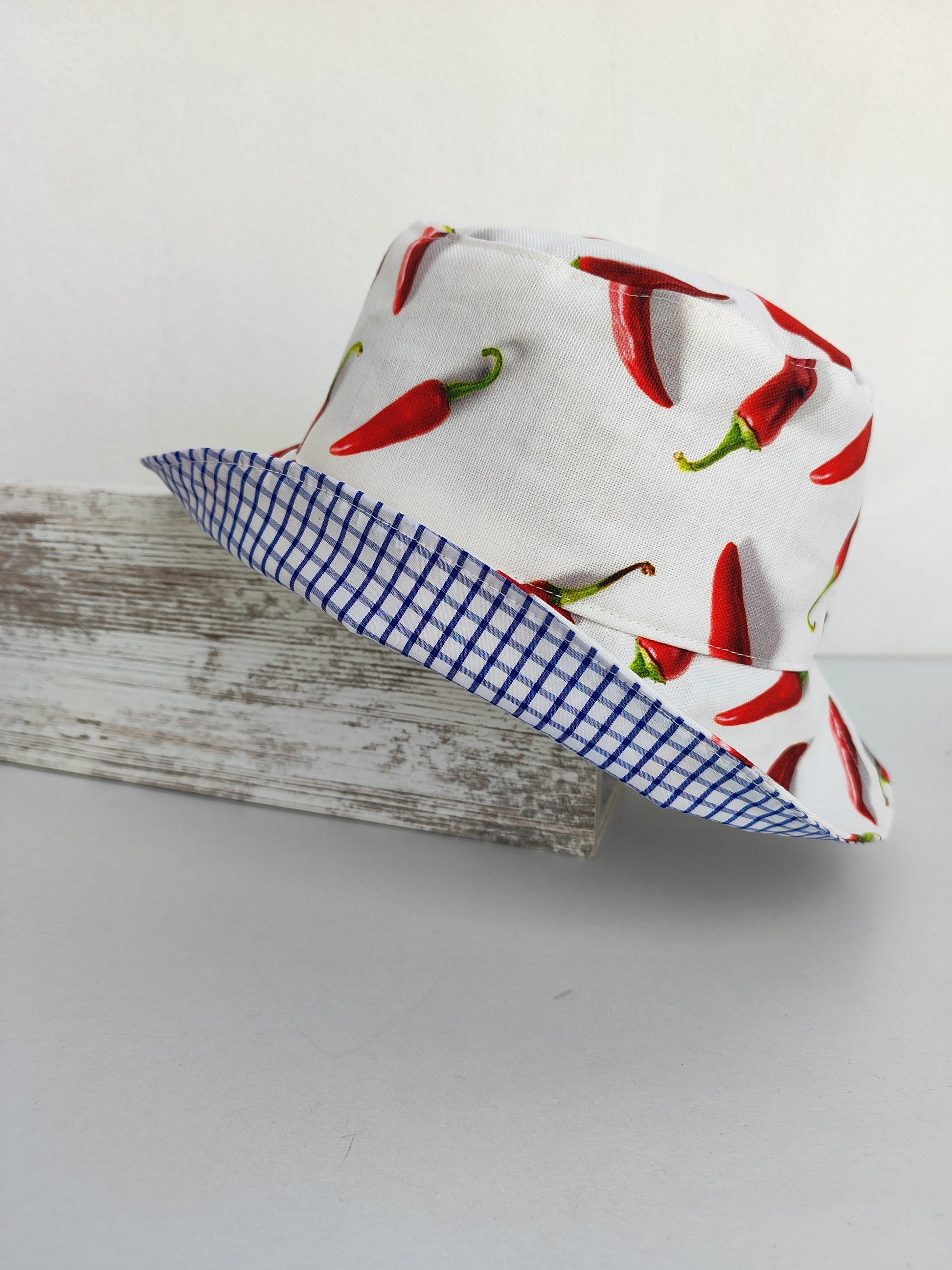 Χειροποίητο καπέλο διπλής όψης ''spicy πιπεριές - μπλε καρό''