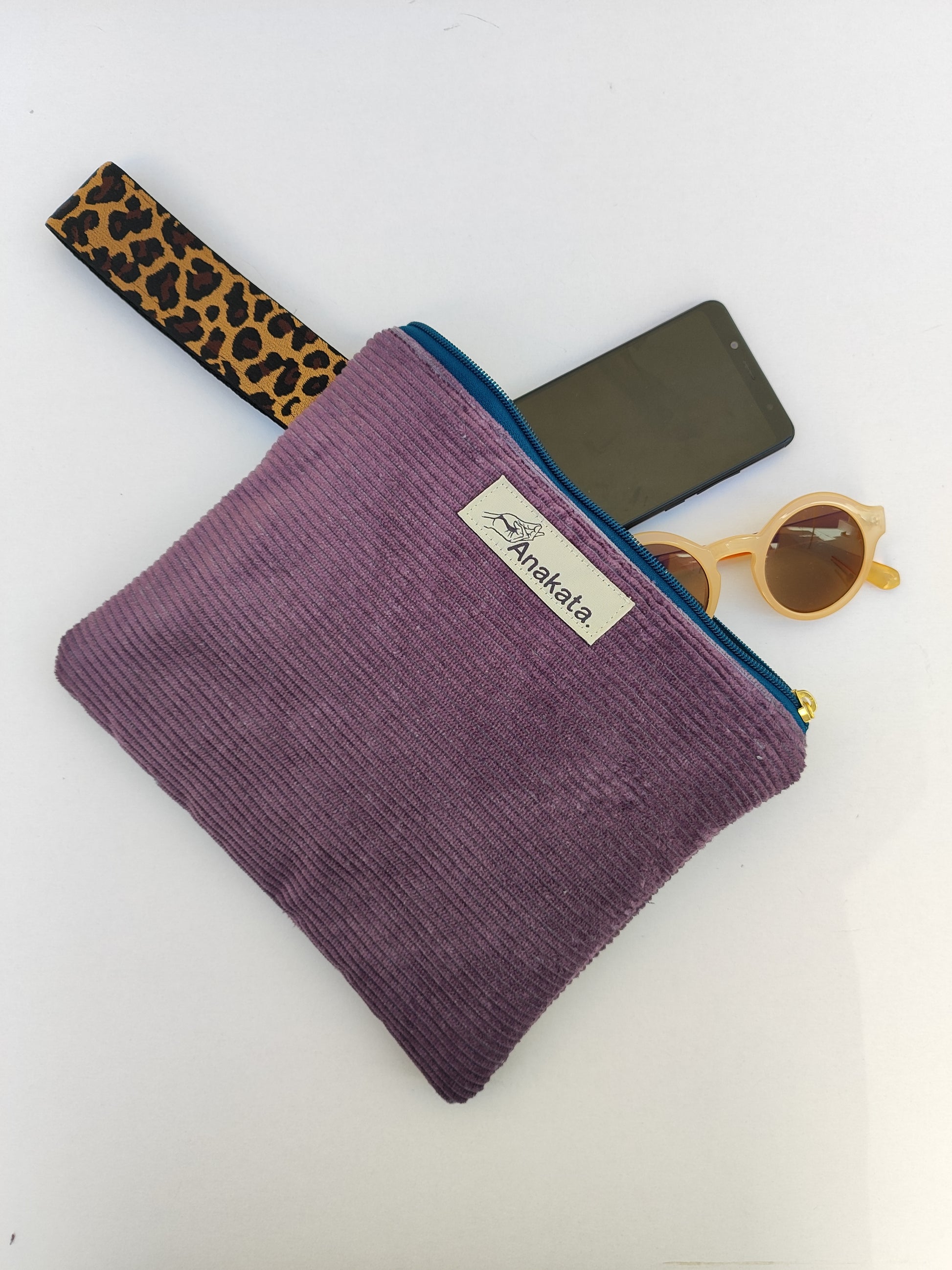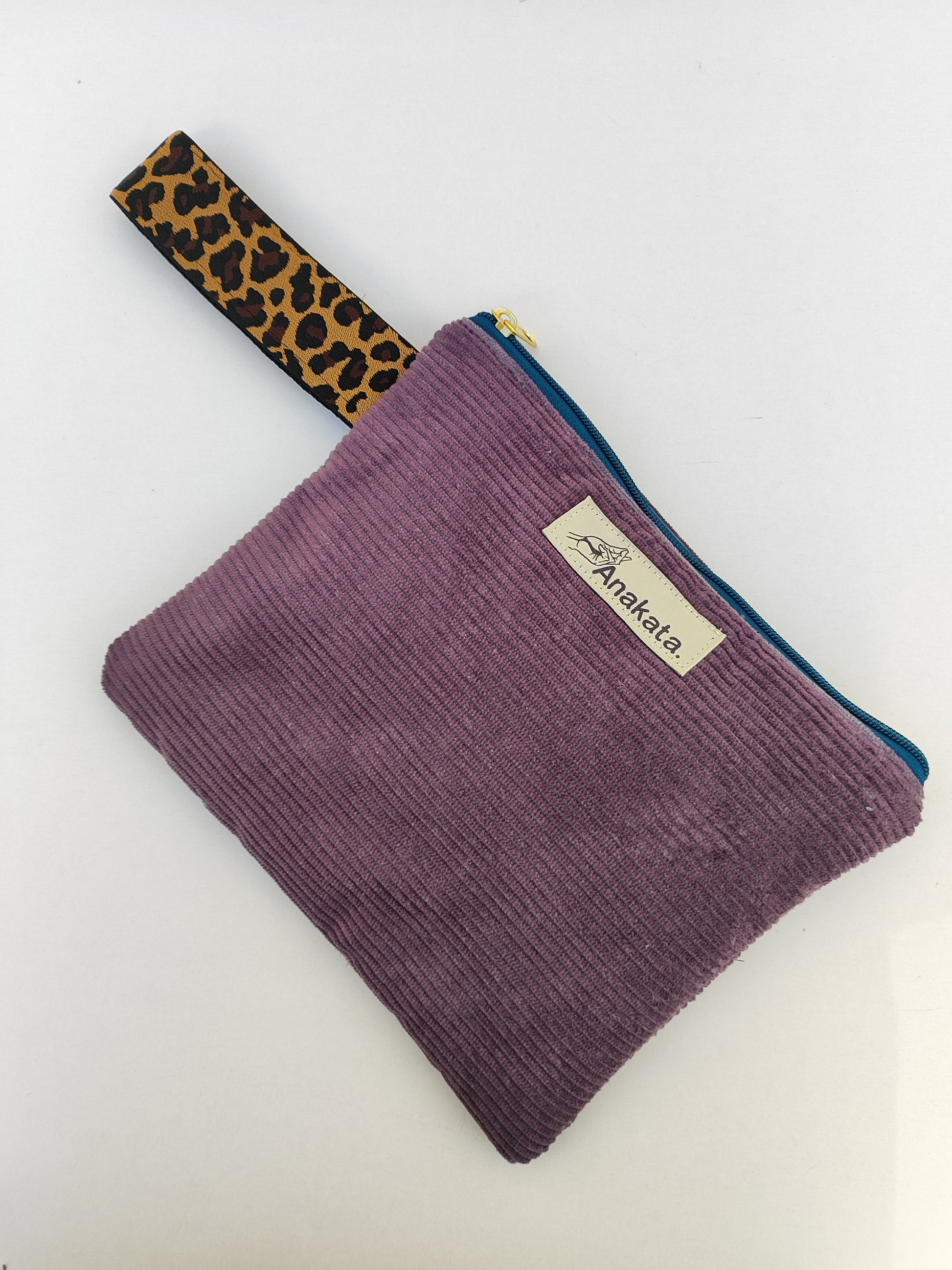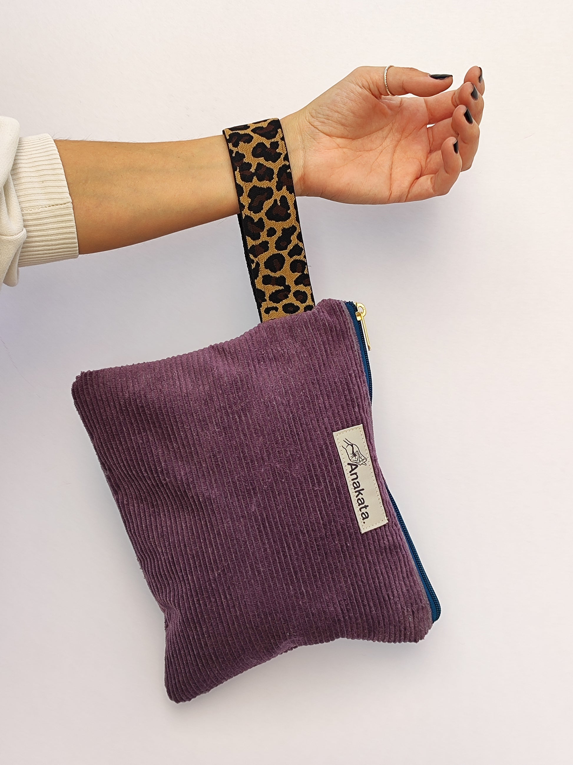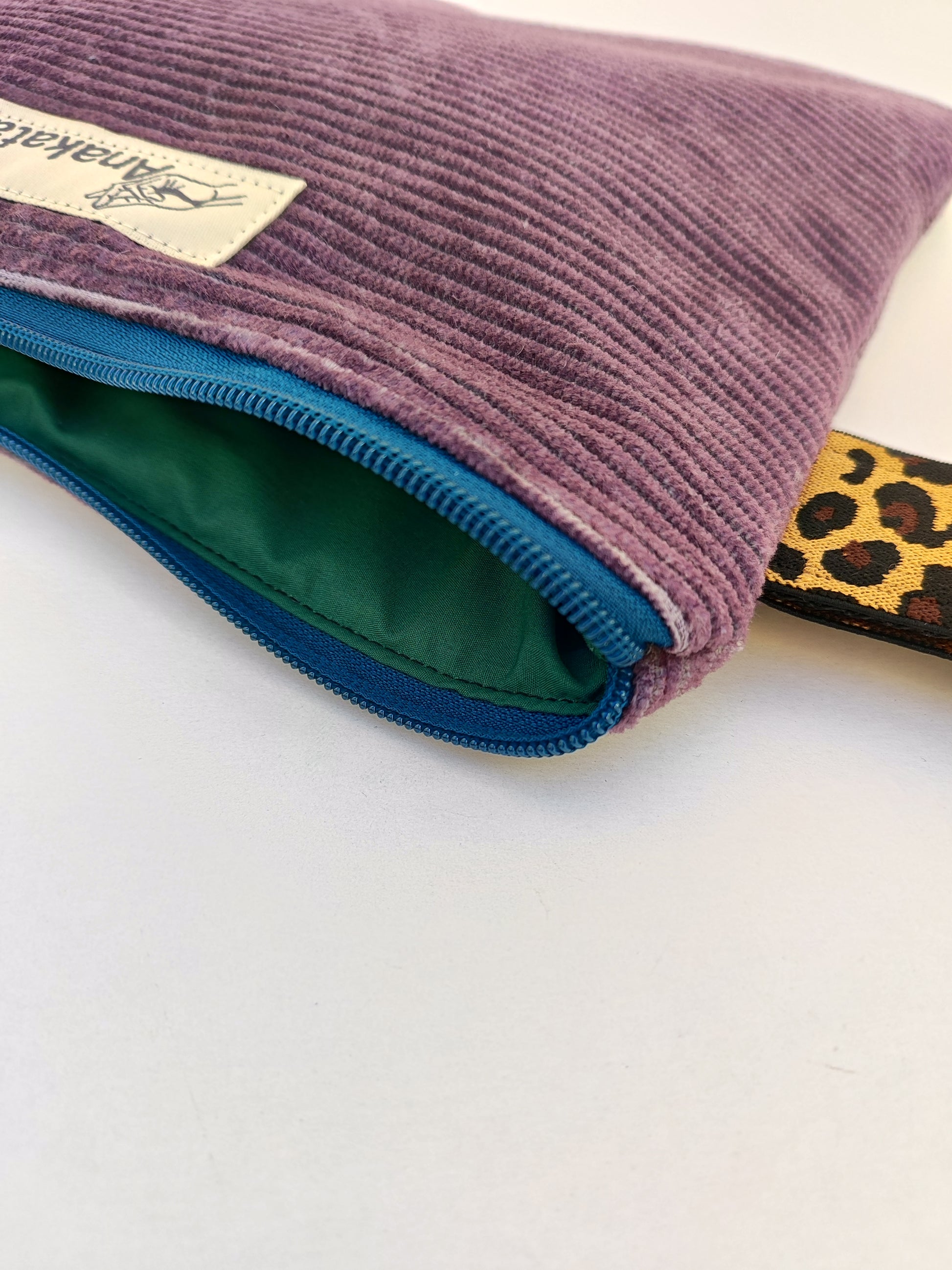 Χειροποίητο τσαντάκι με φερμουάρ ''μωβ κοτλέ με λεοπάρ ιμάντα''