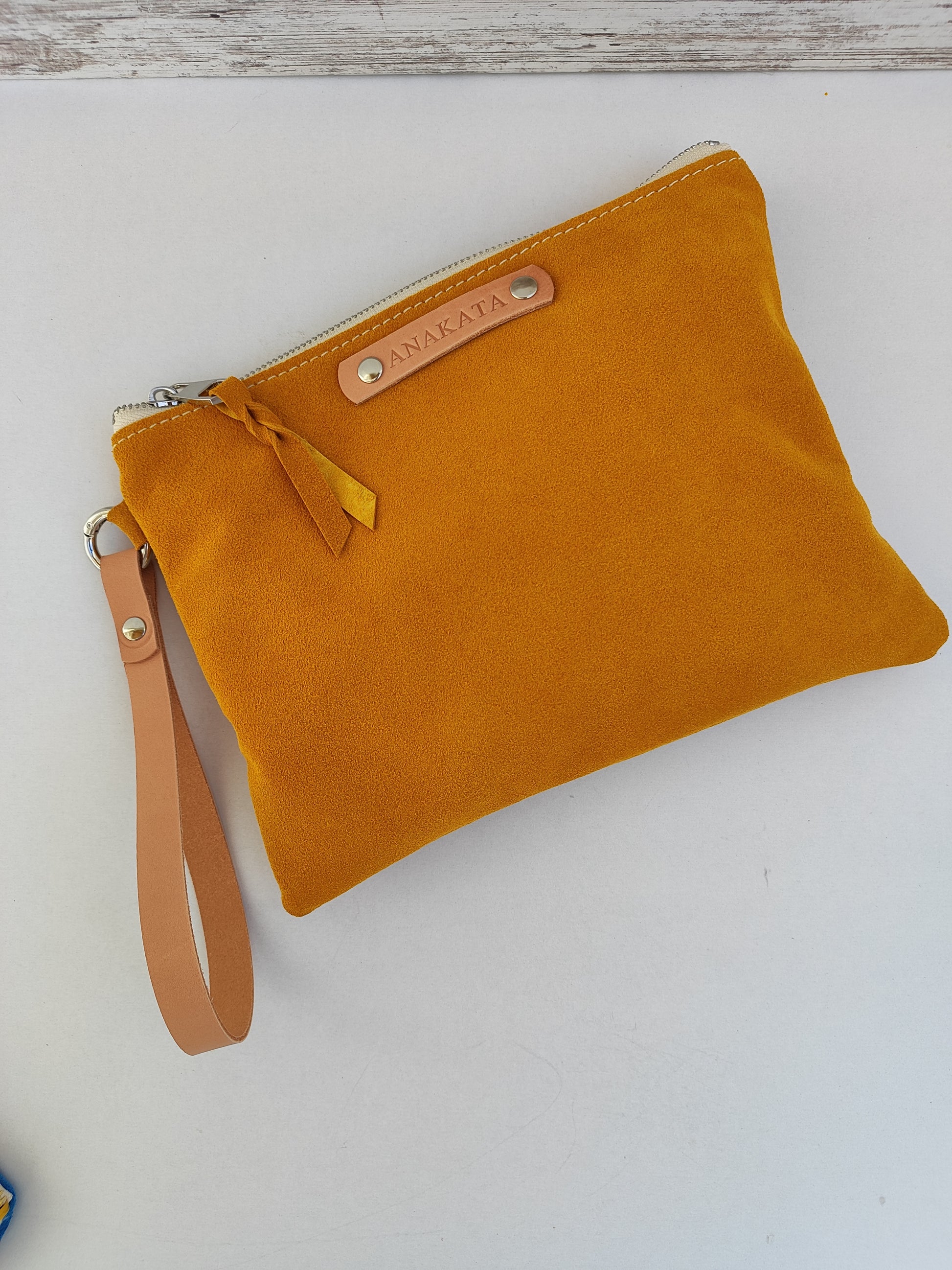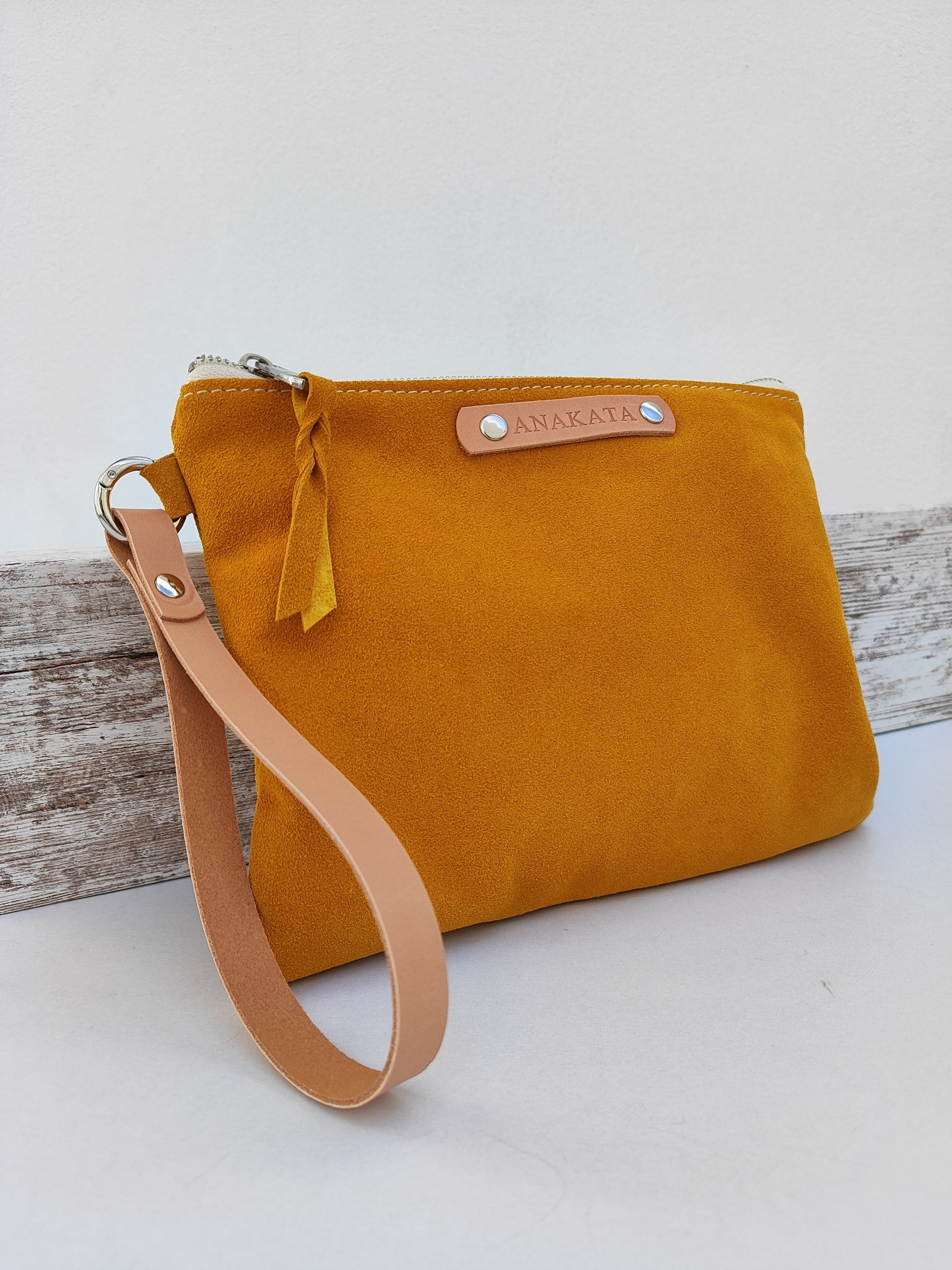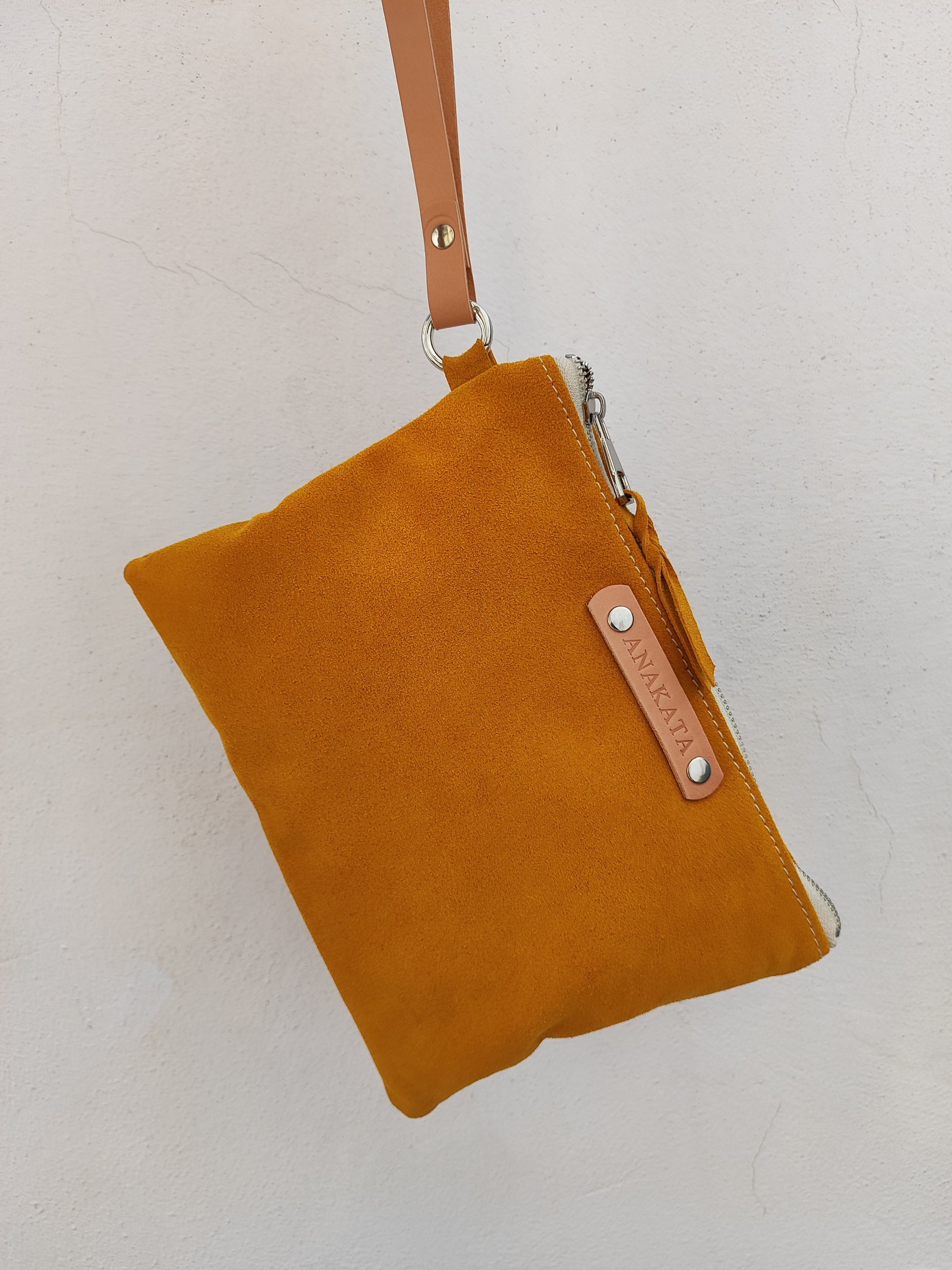 Χειροποίητο suede τσαντάκι με φερμουάρ, εσωτερική επένδυση με τσεπάκι και αποσπώμενο δεράτινο λουράκι.