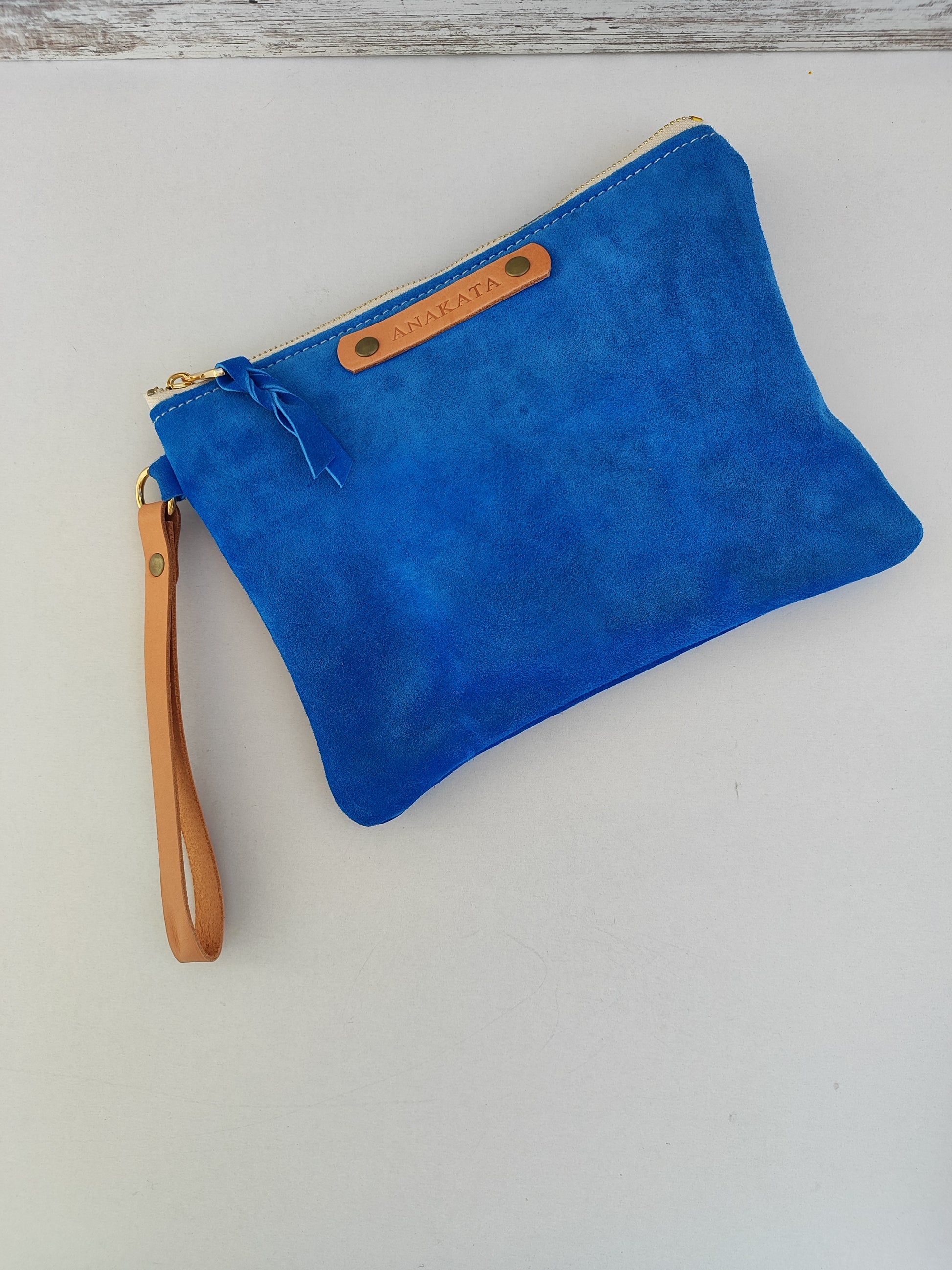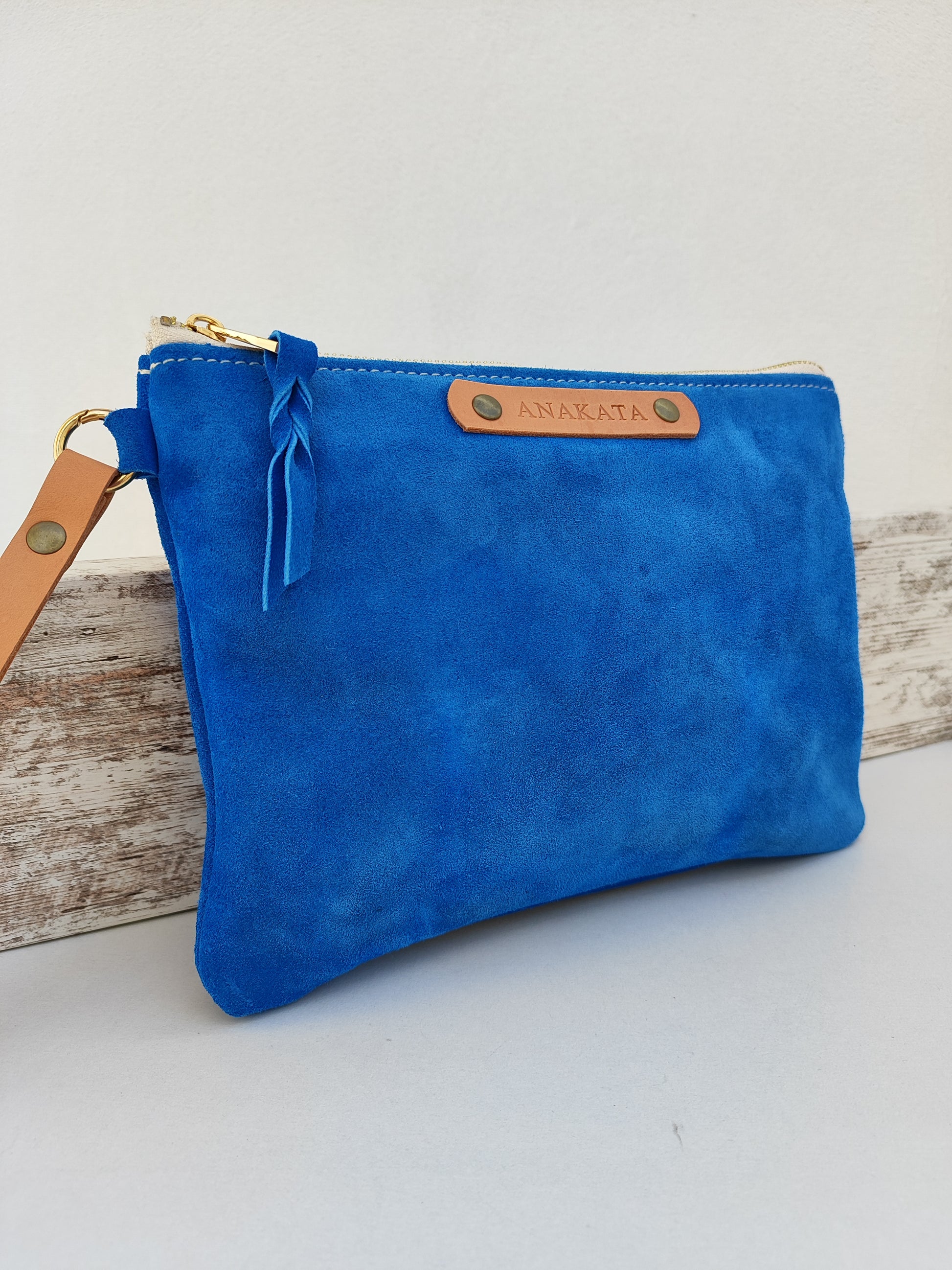 Χειροποίητο suede τσαντάκι με φερμουάρ, εσωτερική επένδυση με τσεπάκι και αποσπώμενο δεράτινο λουράκι.