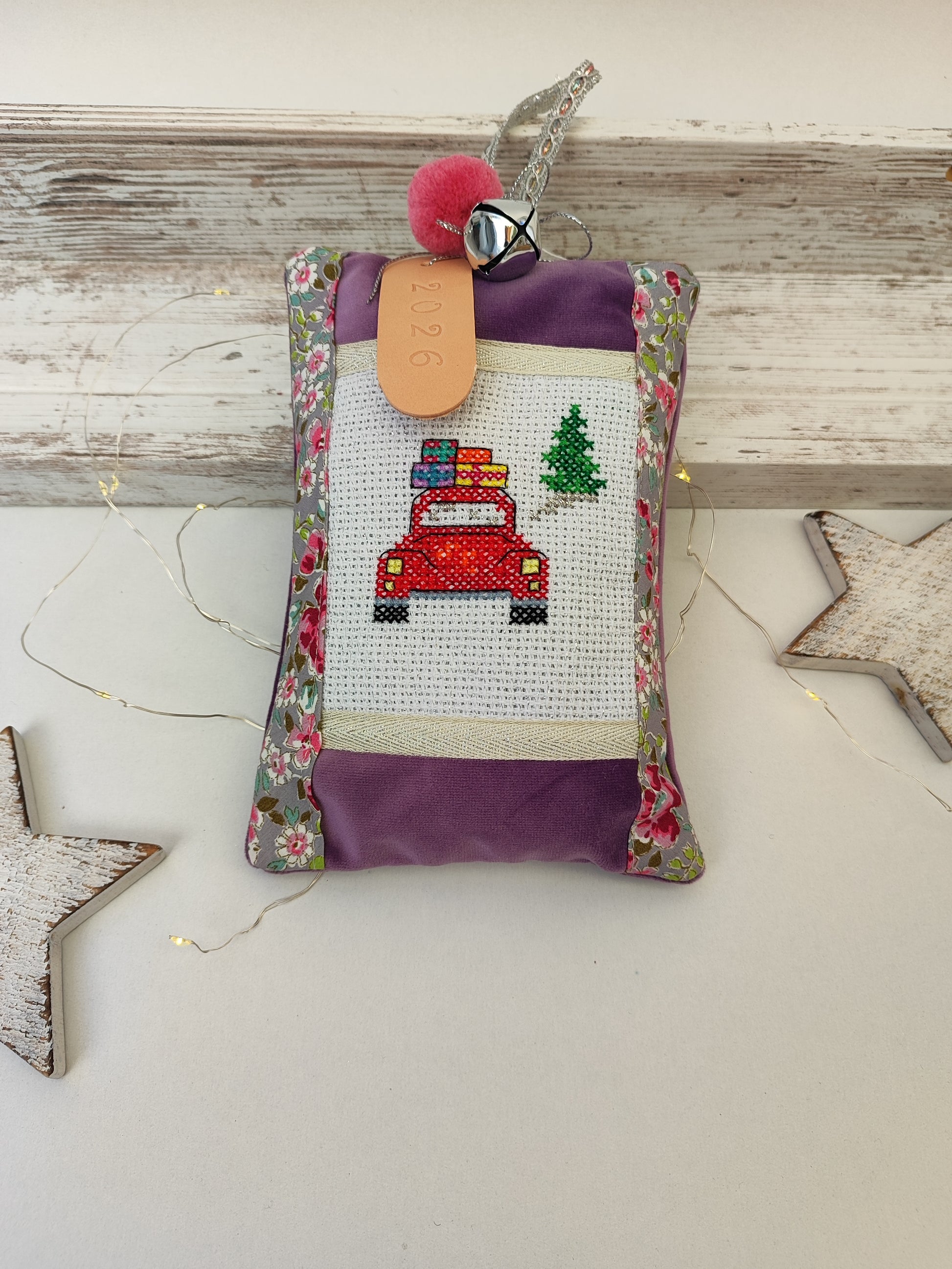Χριστουγεννιάτικο υφασμάτινο γούρι κεντημένο σταυροβελονιά - κόκκινο αυτοκίνητο.