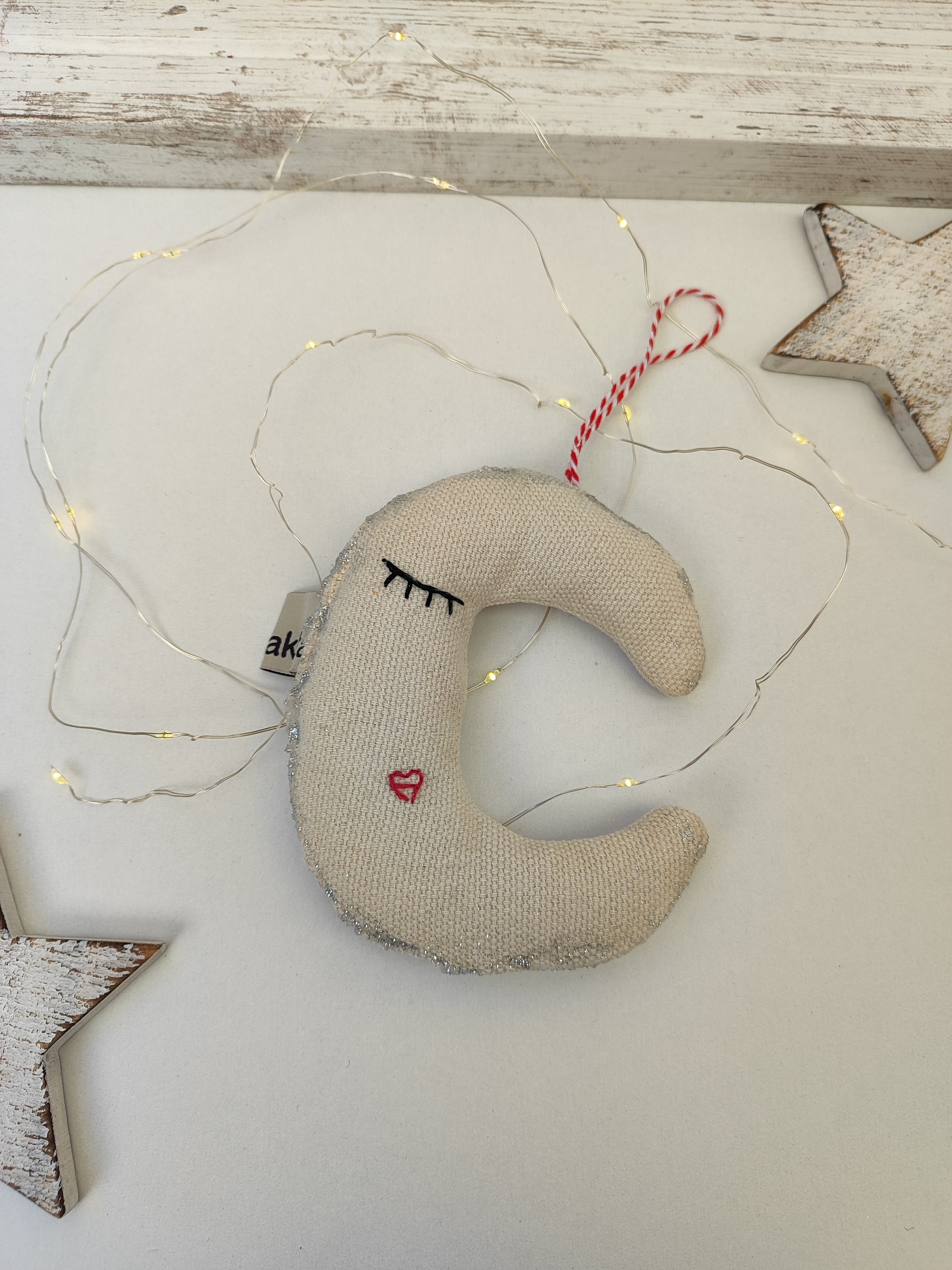 Χριστουγεννιάτικο υφασμάτινο στολίδι - κεντημένο φεγγάρι.