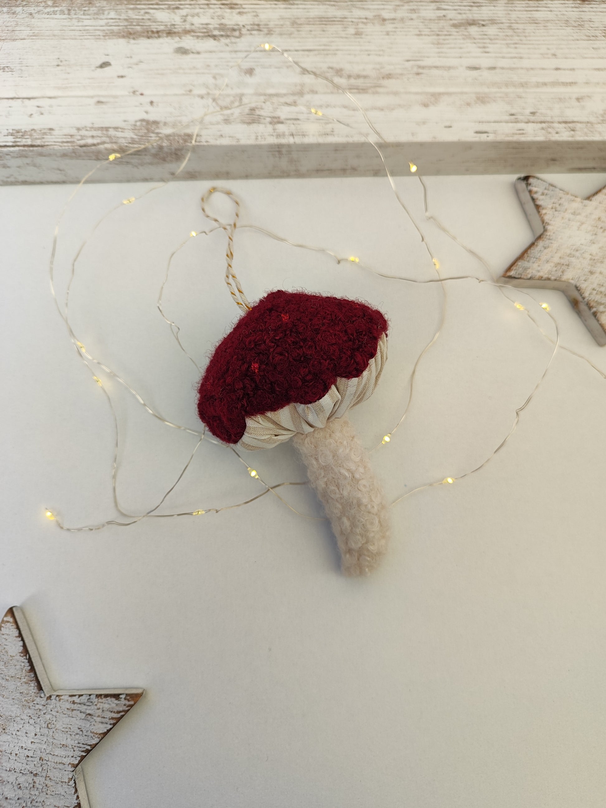 Χριστουγεννιάτικο υφασμάτινο στολίδι - μπορντό και εκρού μανιτάρι .