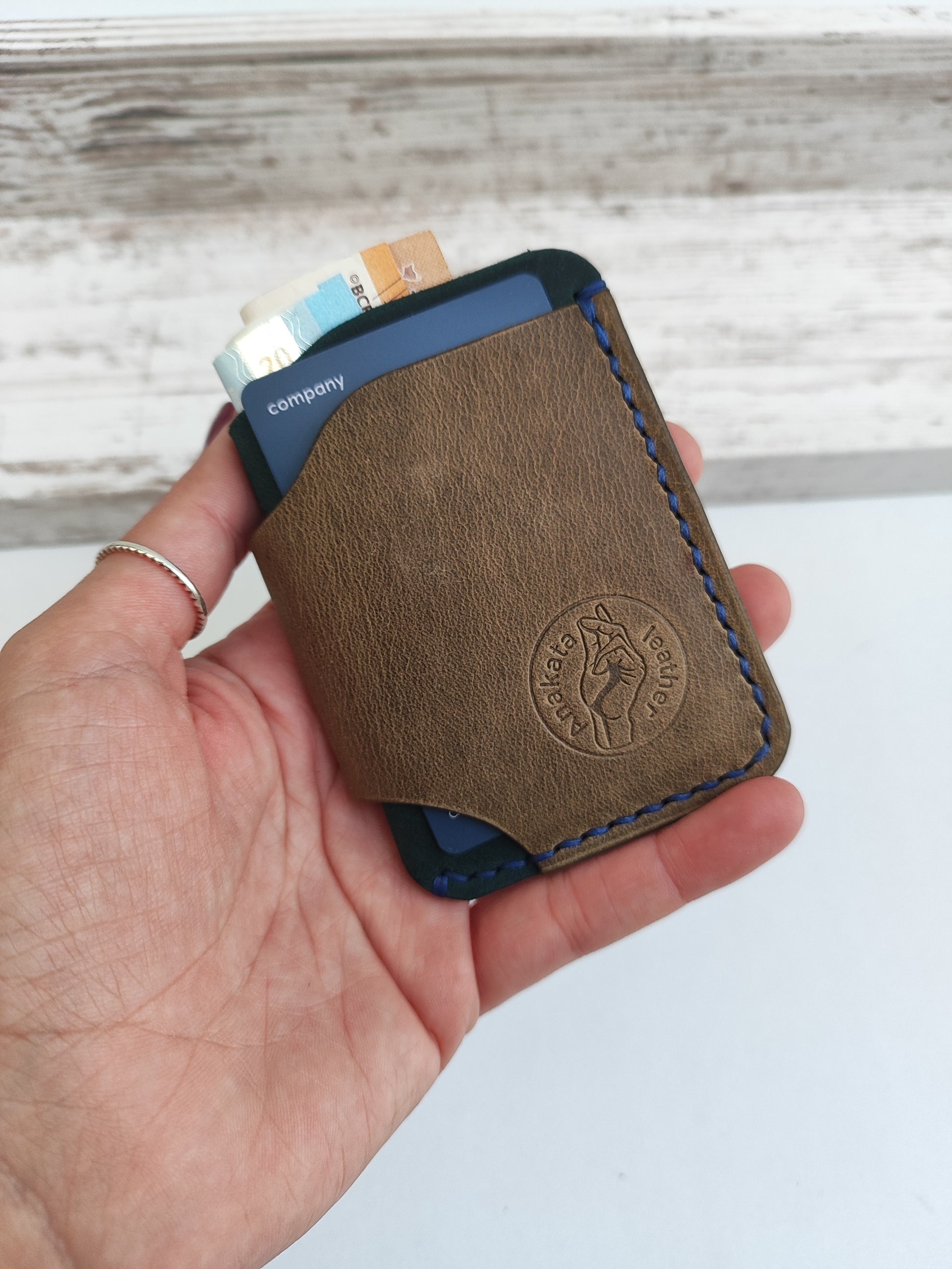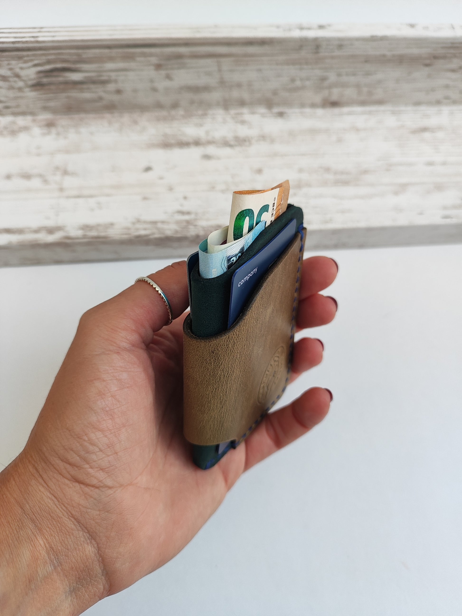 Hobbit δερμάτινο πορτοφόλι ''σκούρο πετρόλ με λαδί και μπλε κλωστή''