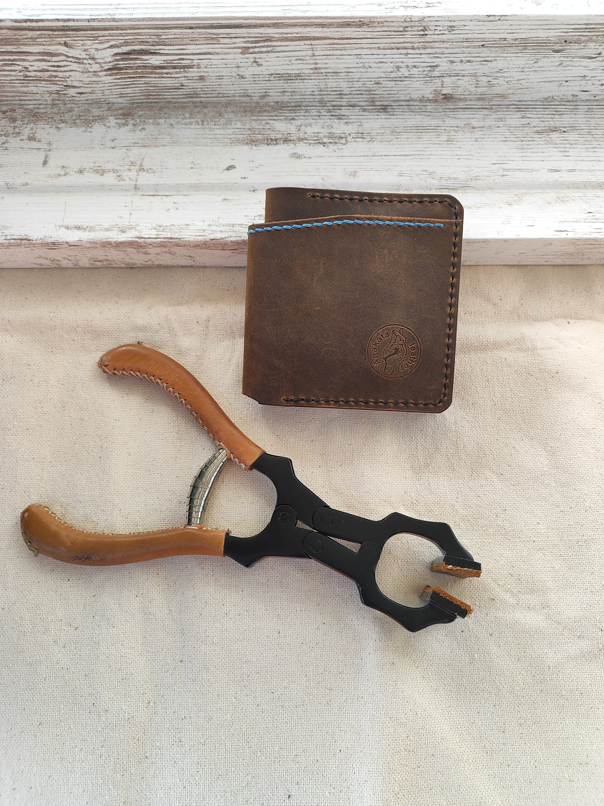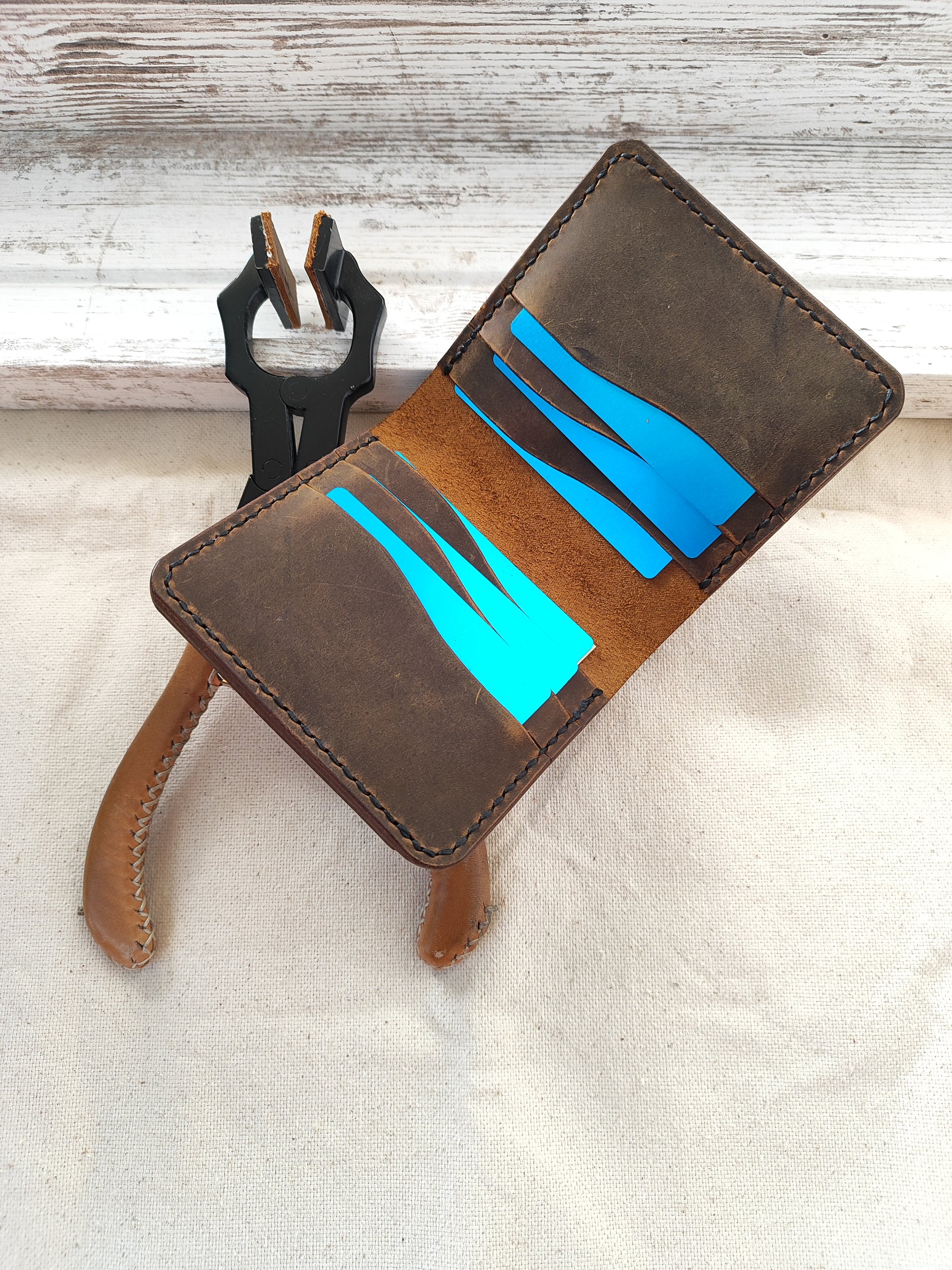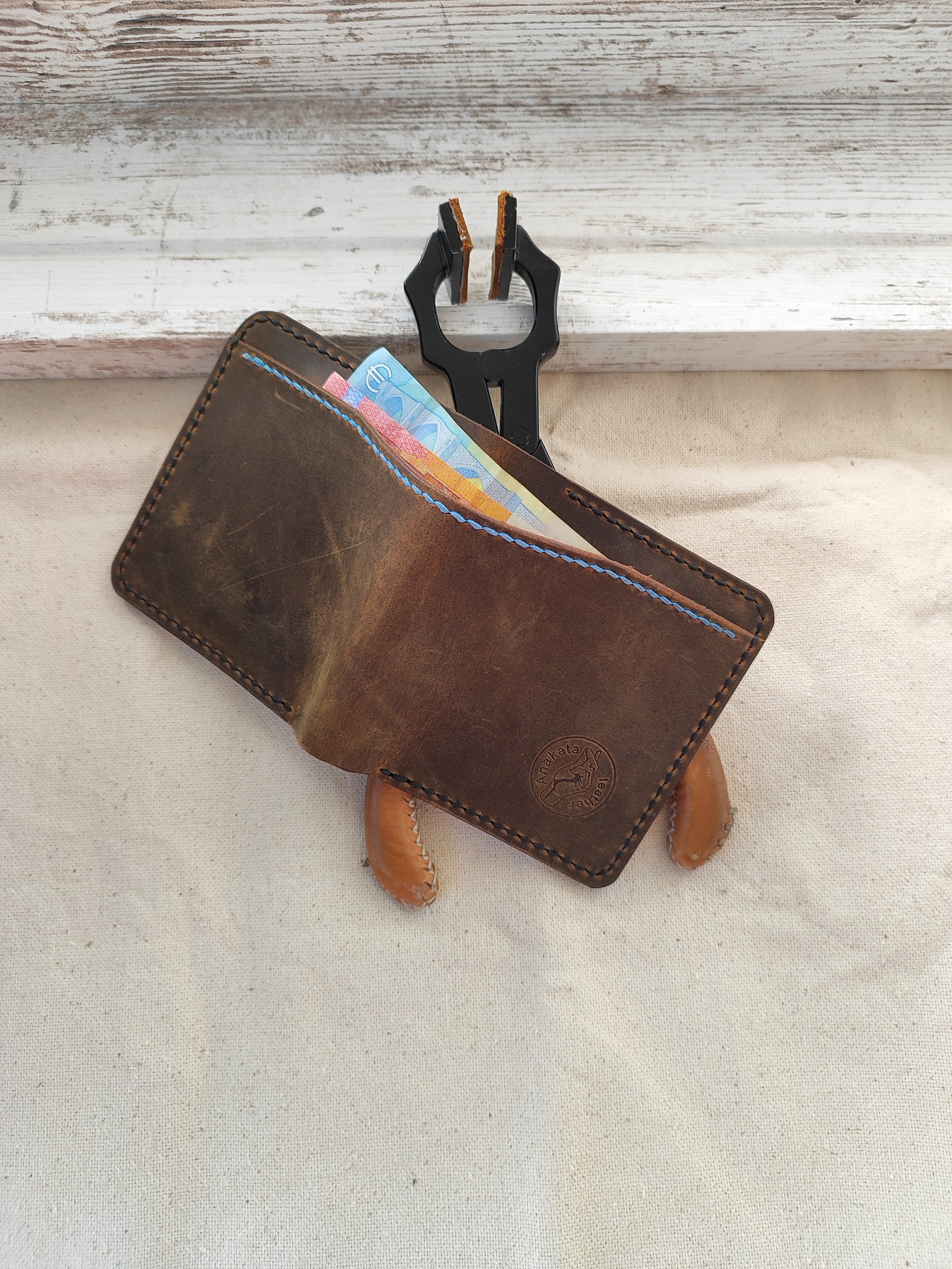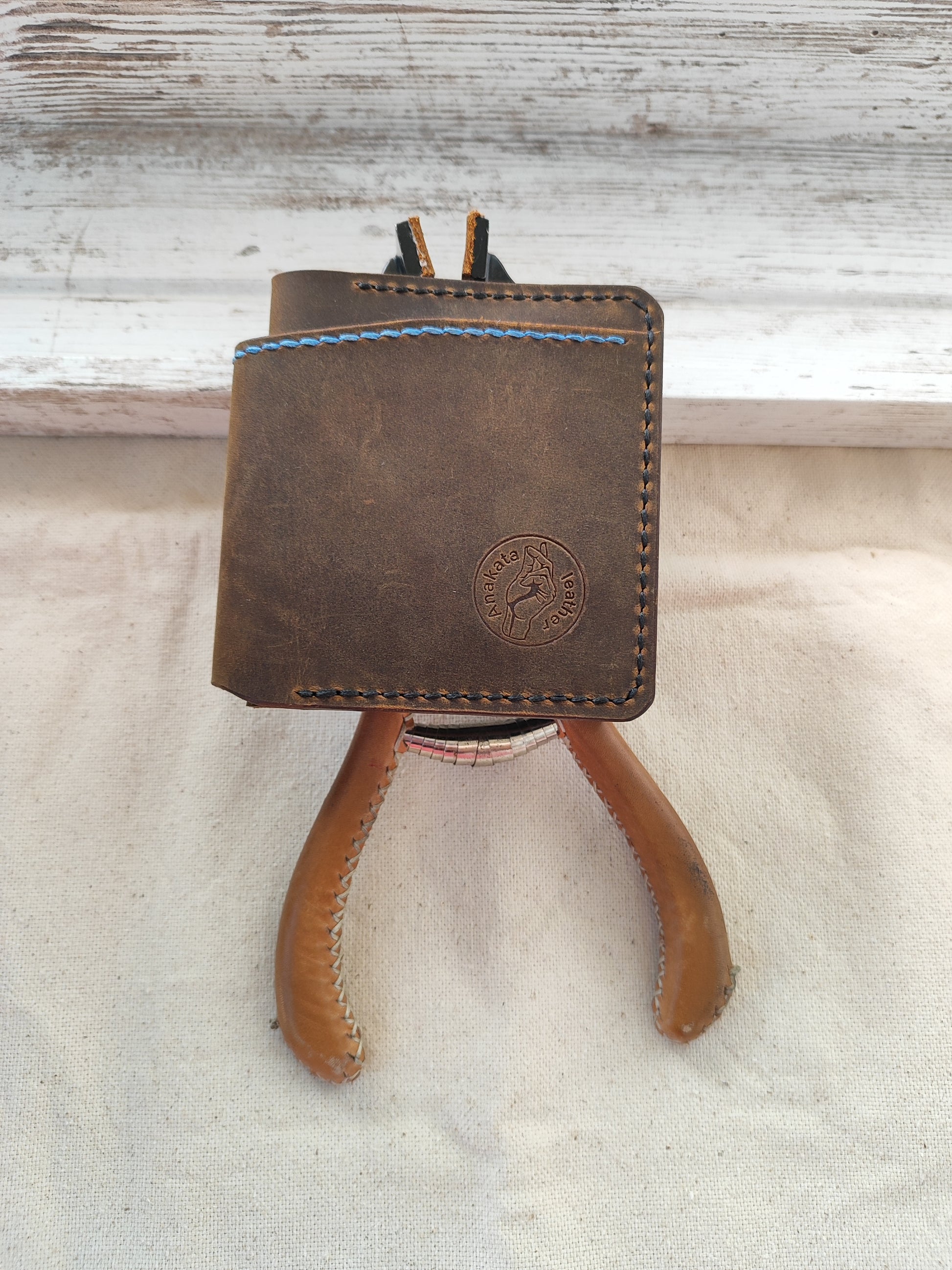 ''McFly'' χειροποίητο δερμάτινο πορτοφόλι - καφέ με γαλάζια και μαύρη κλωστή.