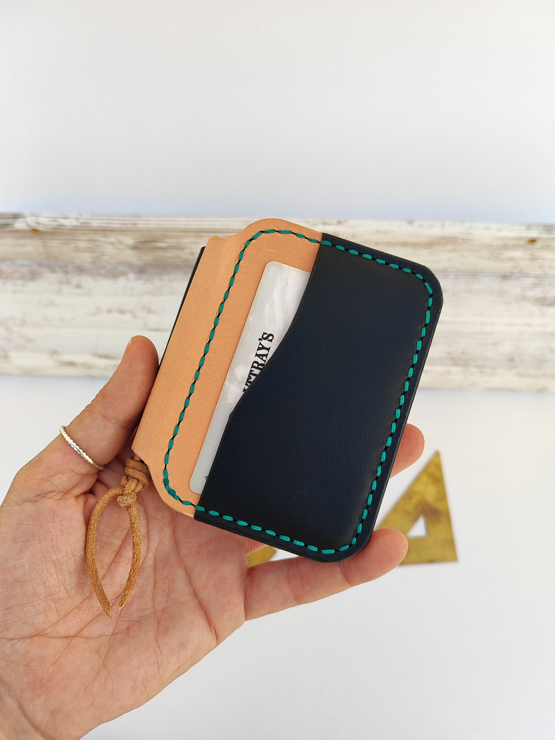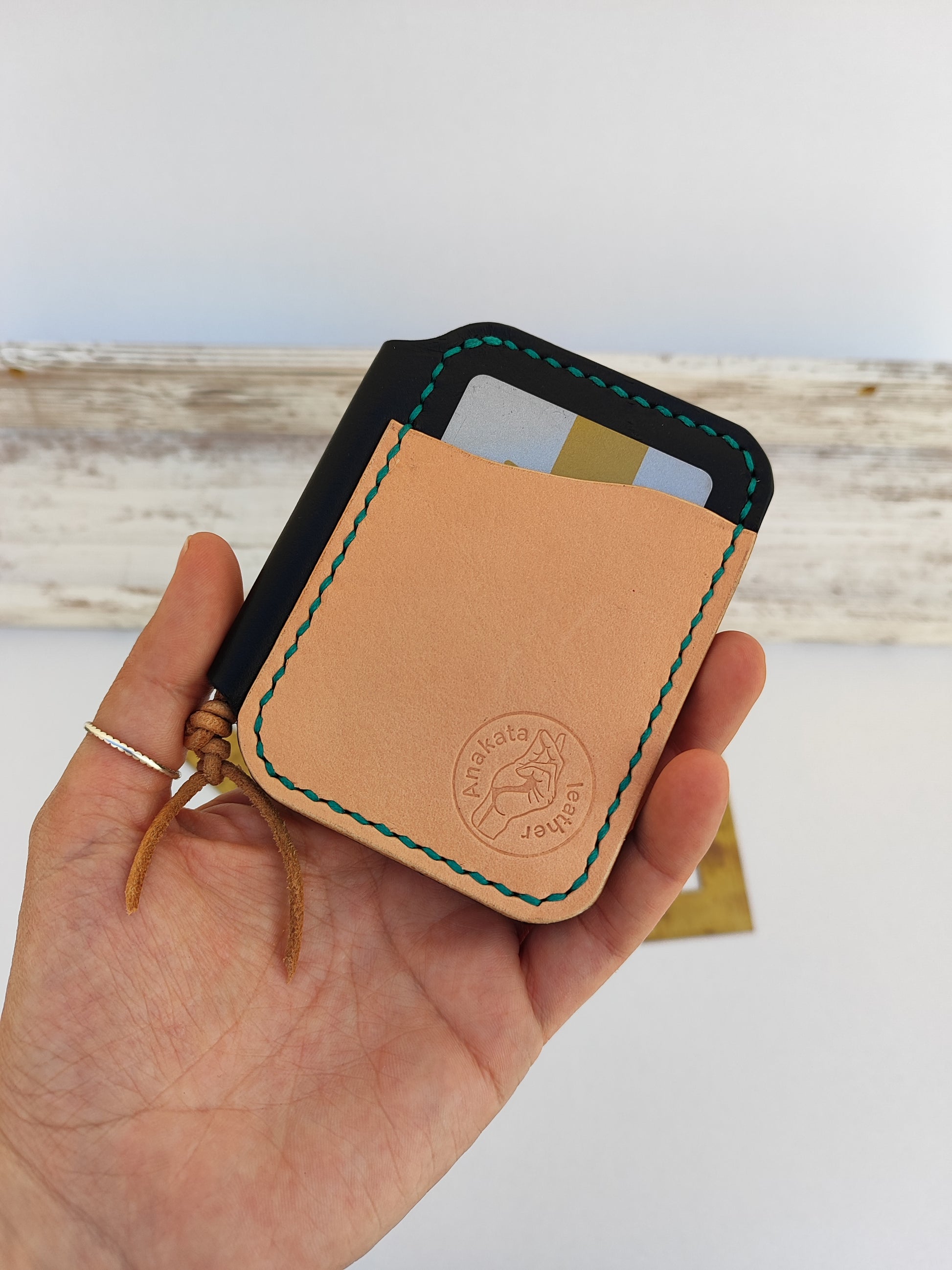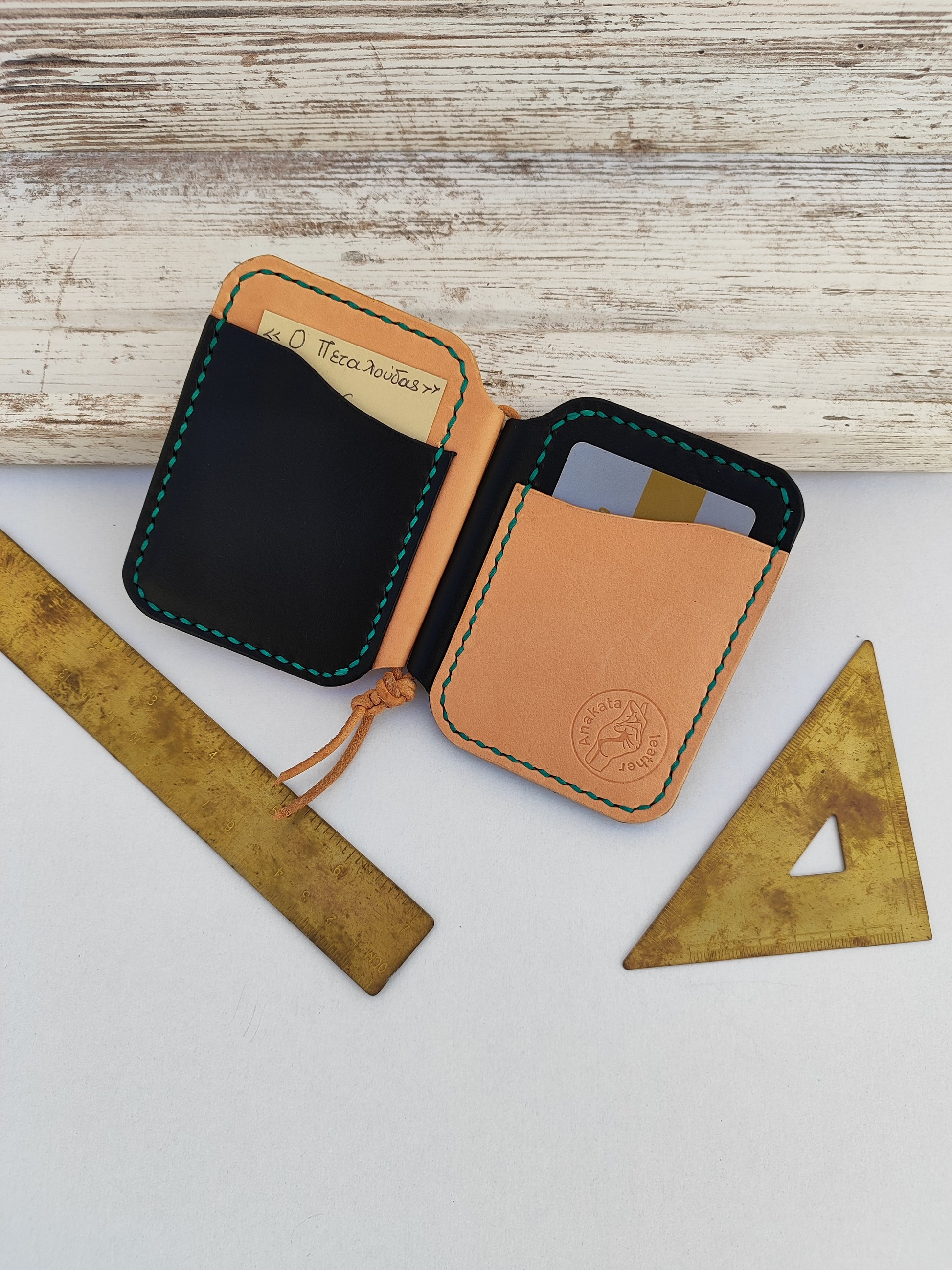 ''Papillon'' Ο Πεταλούδας - χειροποίητο δερμάτινο πορτοφόλι - μαύρο και φυσικό (άβαφο) μπεζ με τυρκουάζ κλωστή.