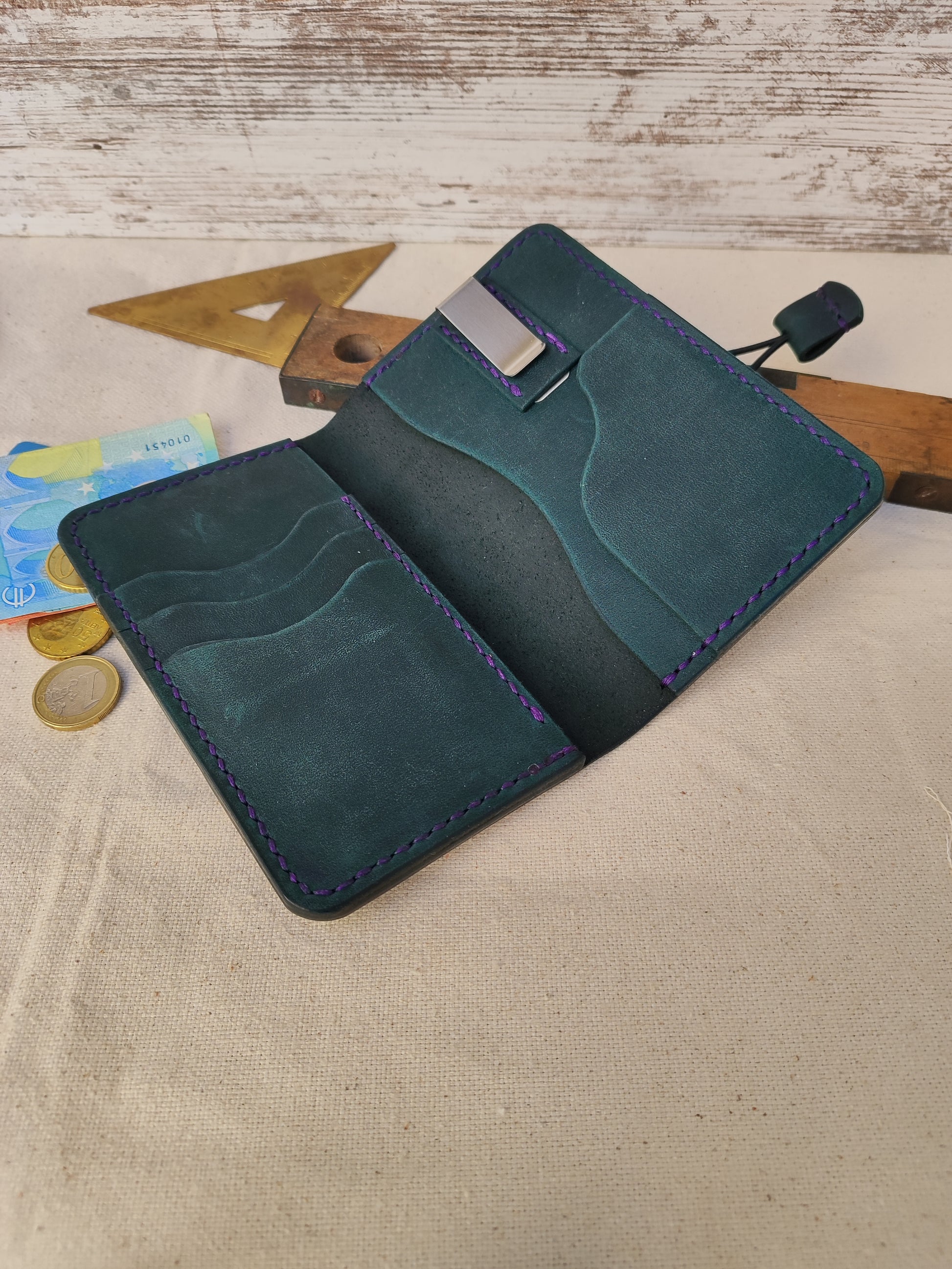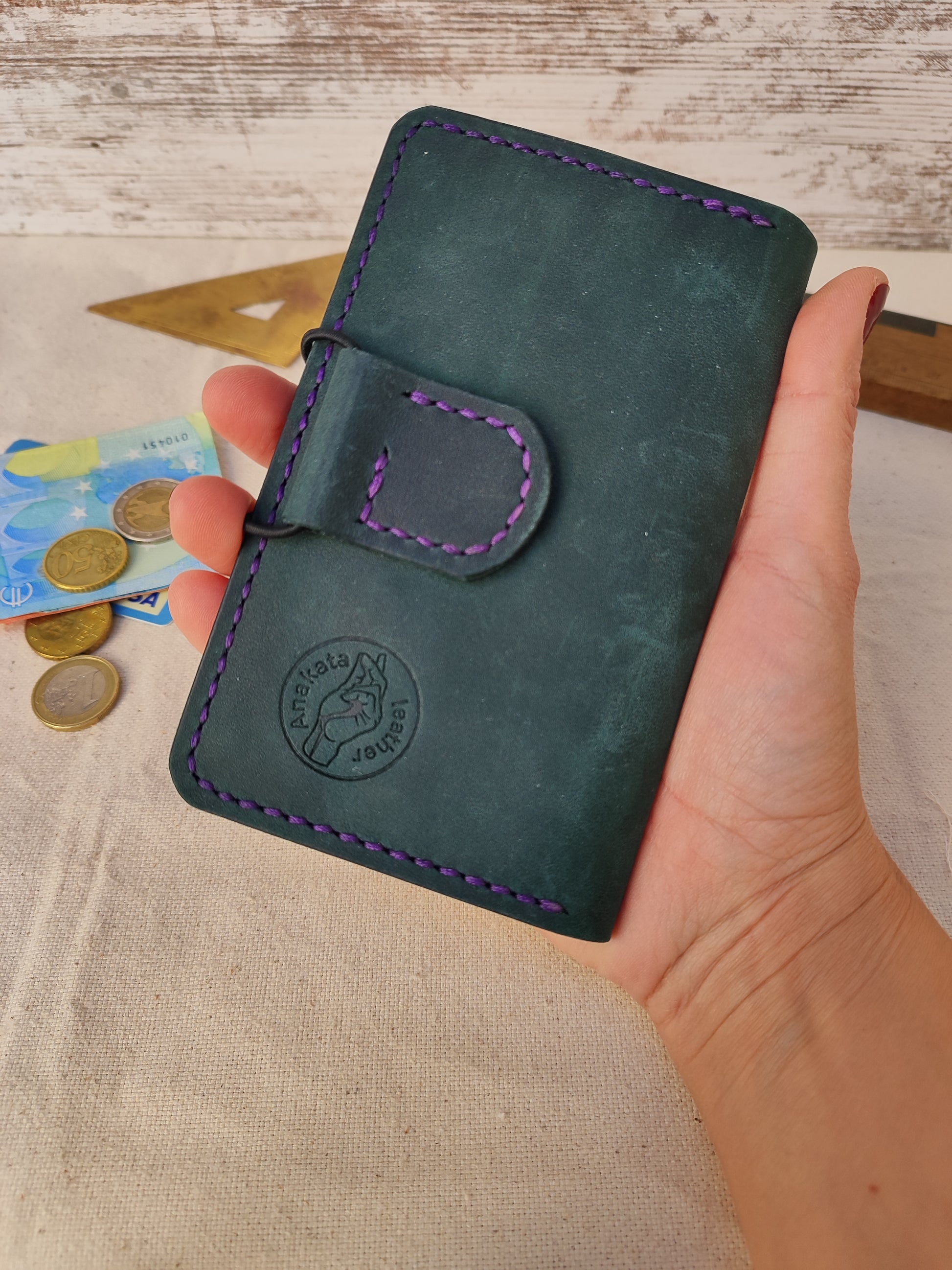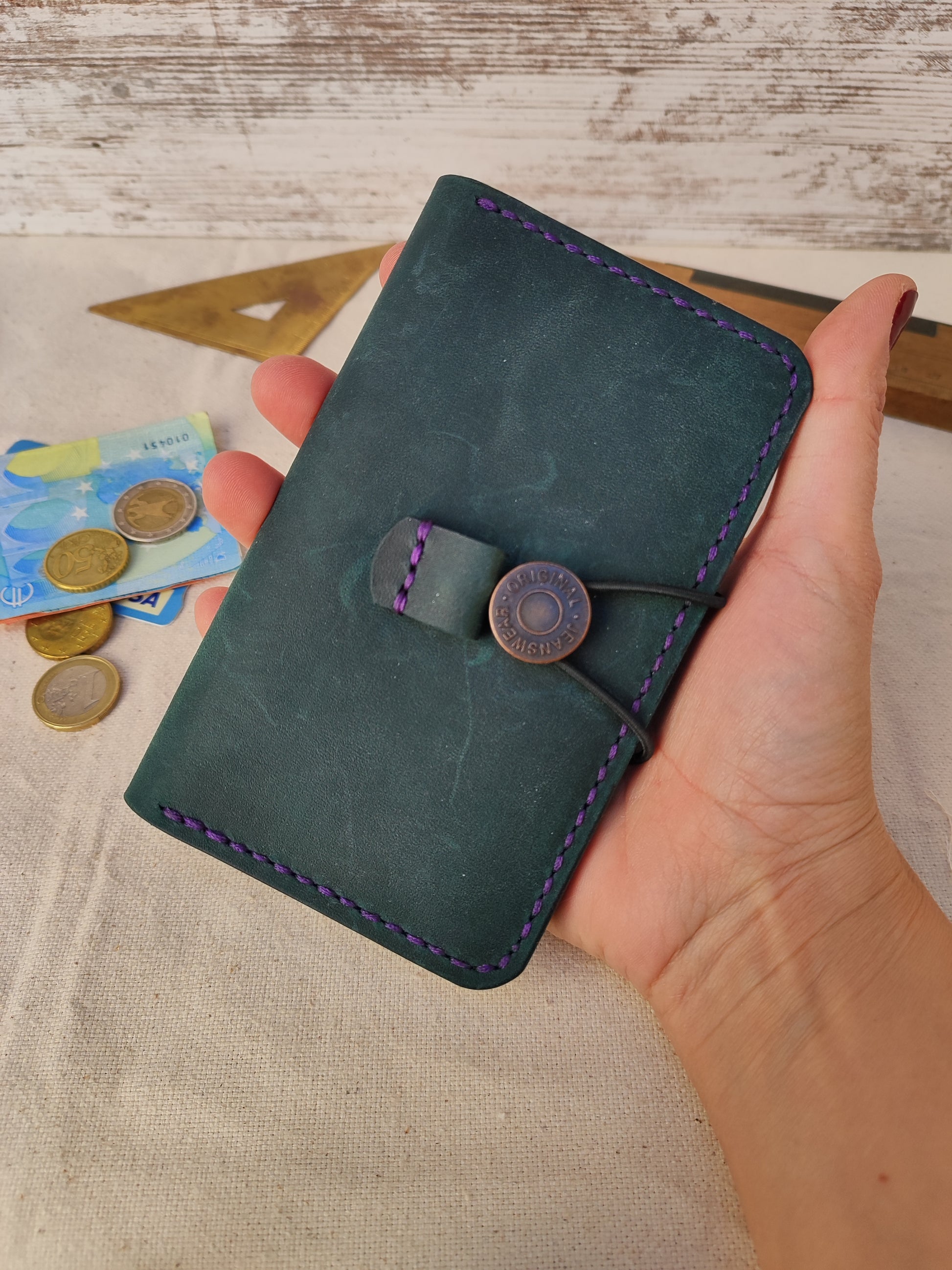 Sherlock Holmes. Χειροποίητο δερμάτινο πορτοφόλι ''σκούρο πετρόλ με μωβ κλωστή''