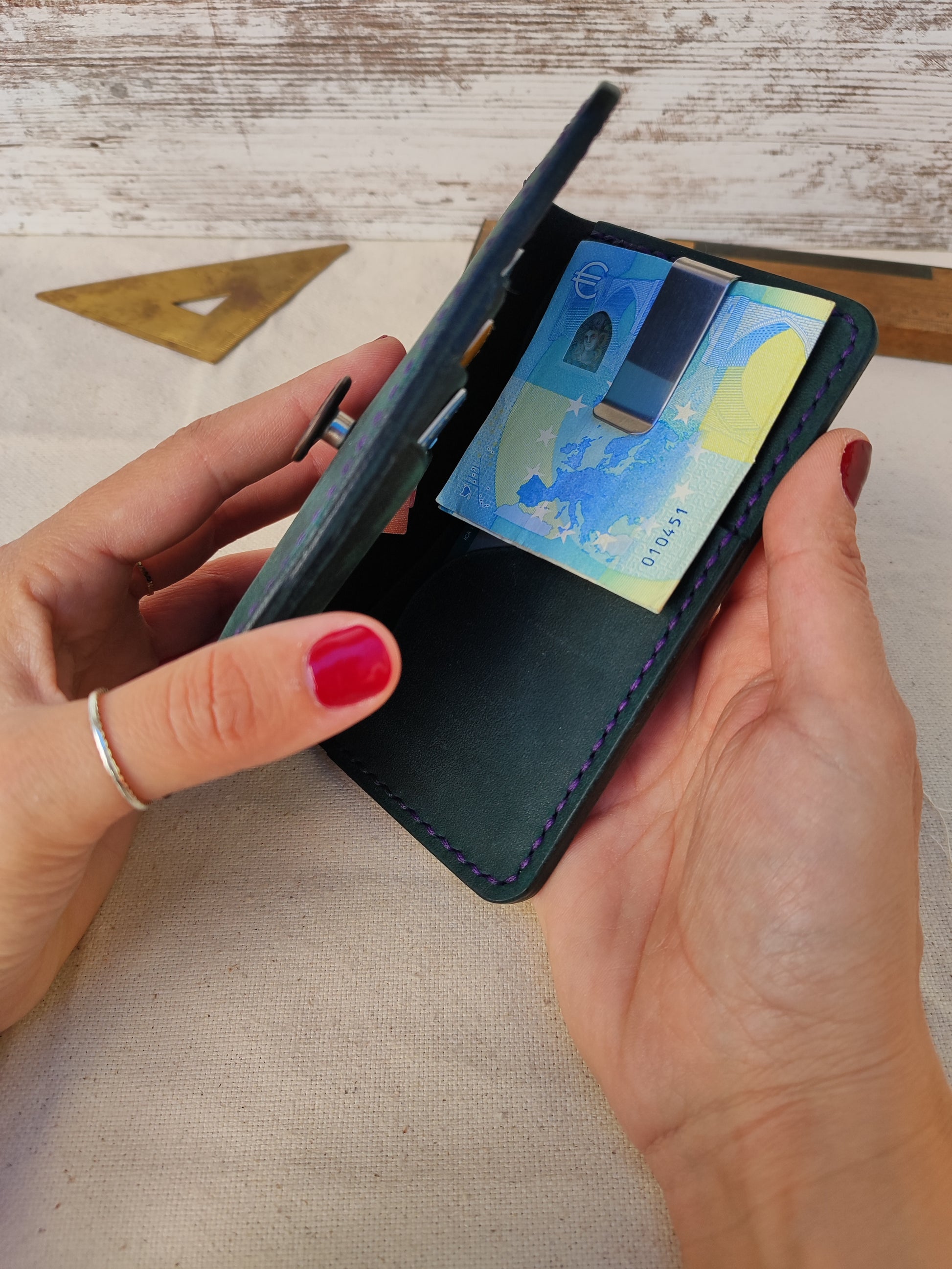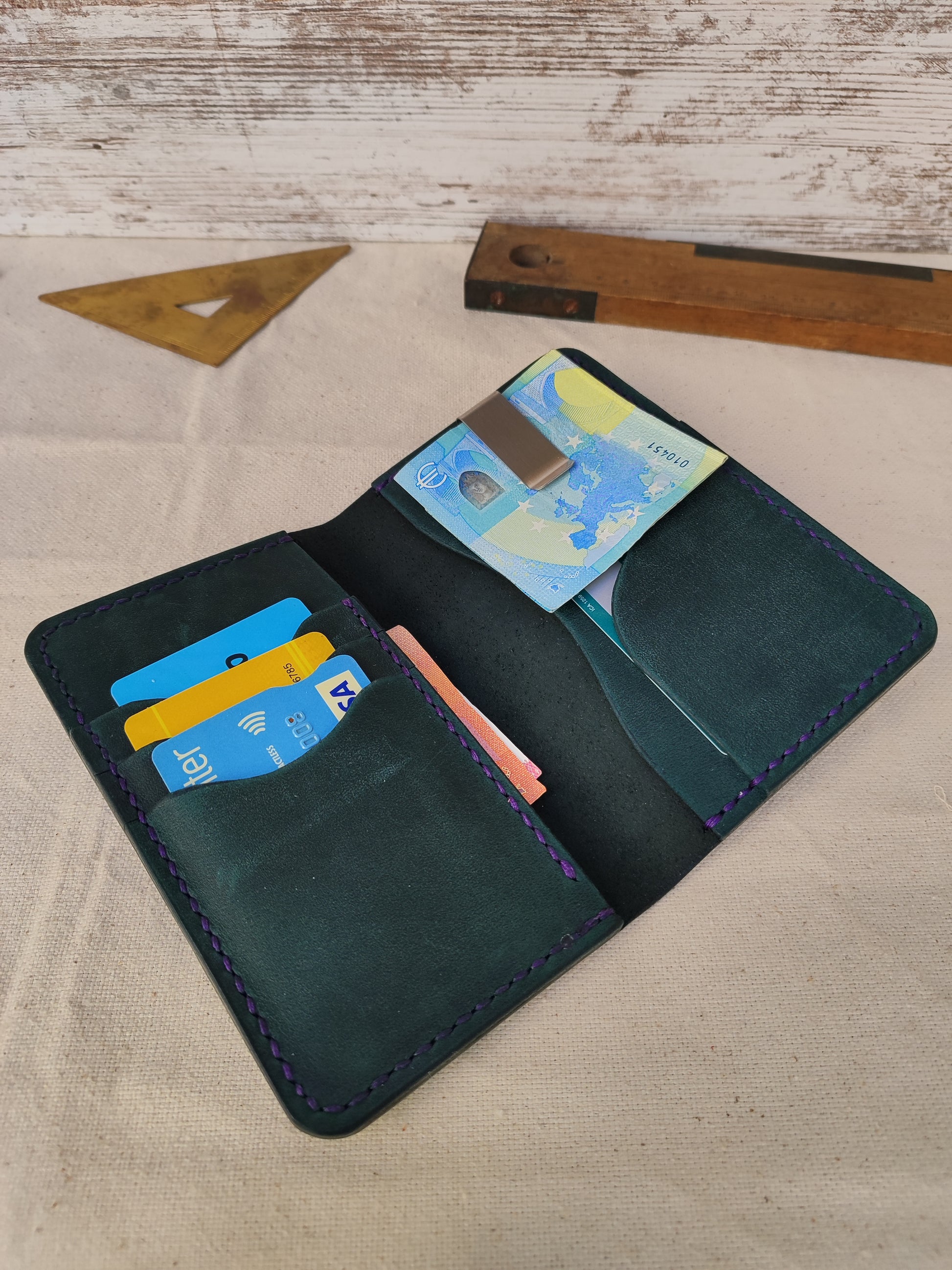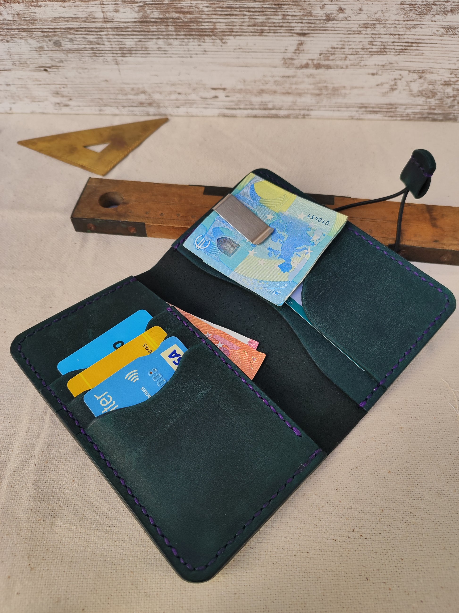 Sherlock Holmes. Χειροποίητο δερμάτινο πορτοφόλι ''σκούρο πετρόλ με μωβ κλωστή''