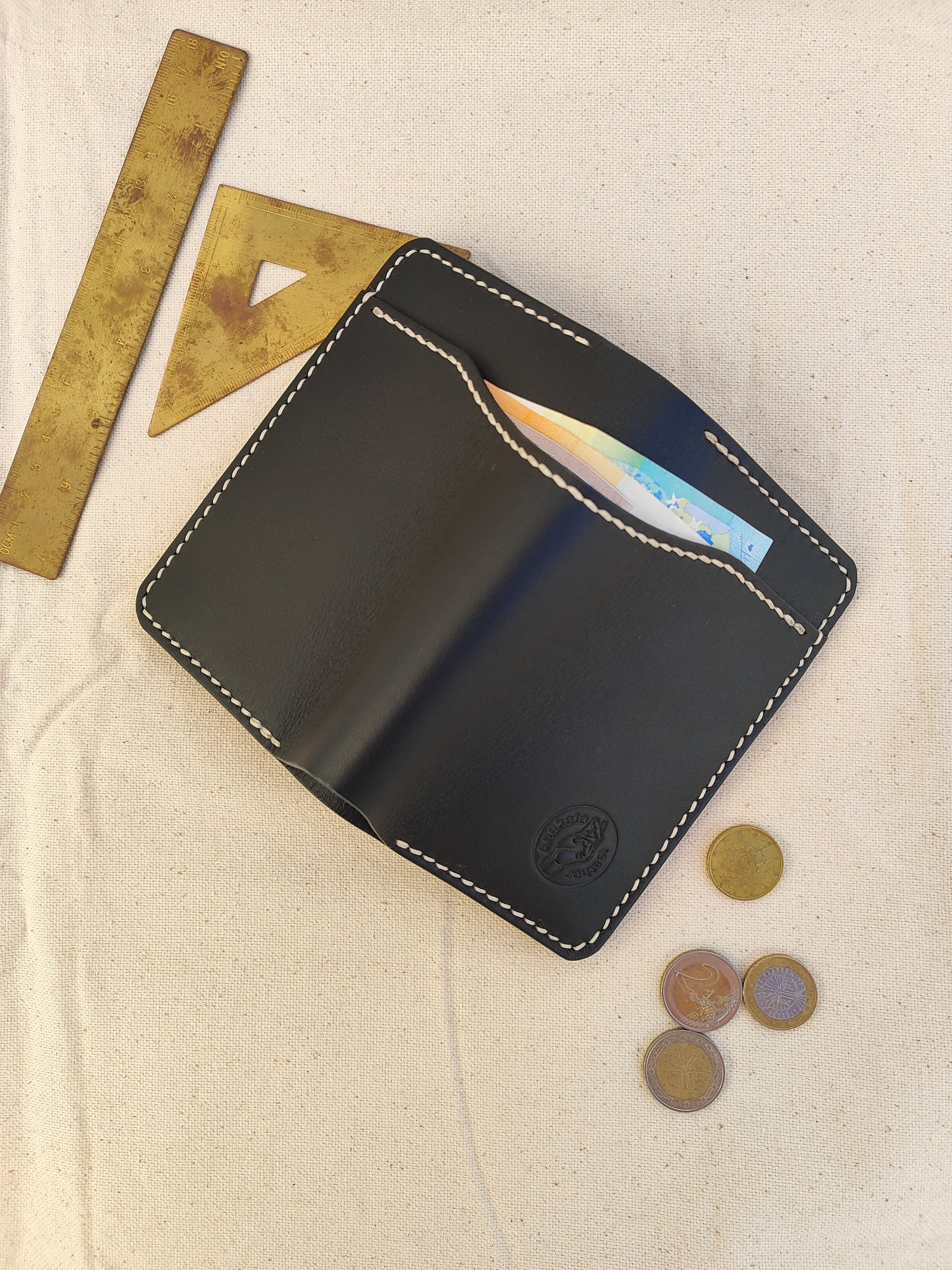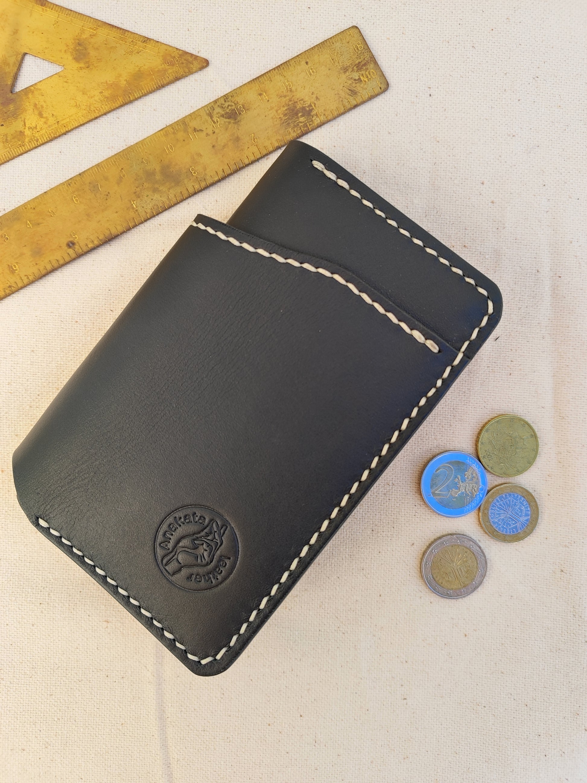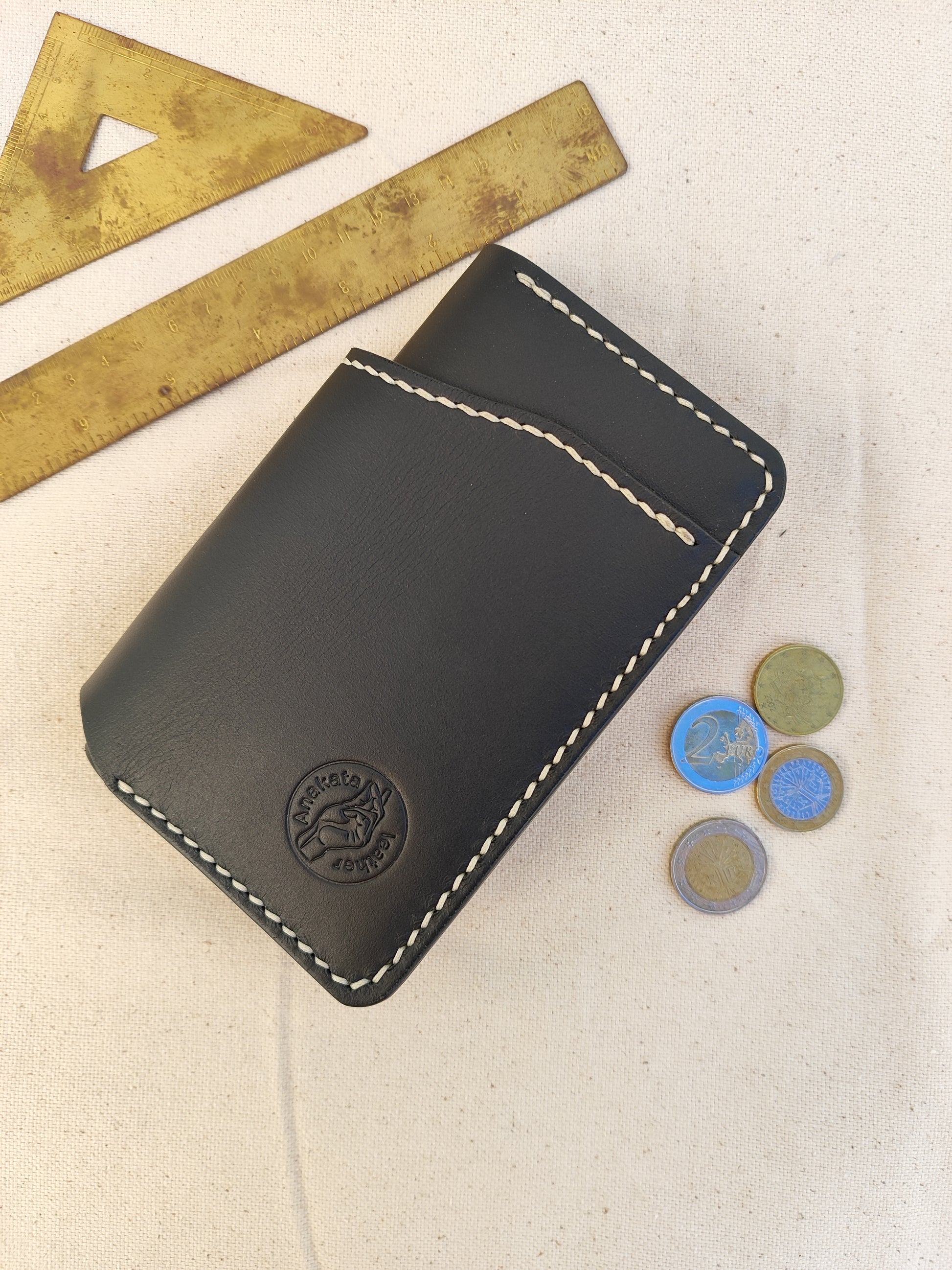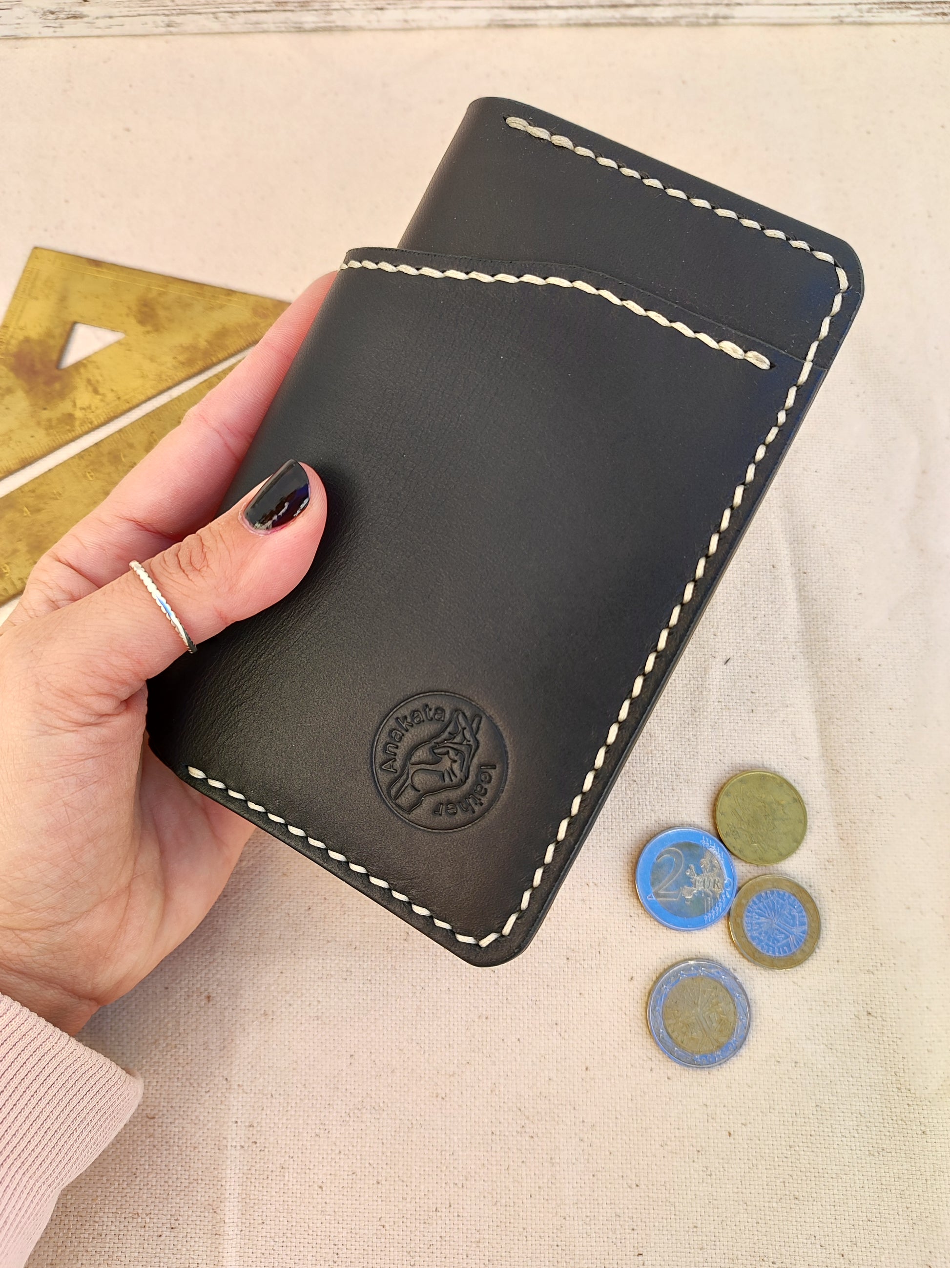 Tom Ripley. Χειροποίητο δερμάτινο πορτοφόλι ''μαύρο με εκρού κλωστή''