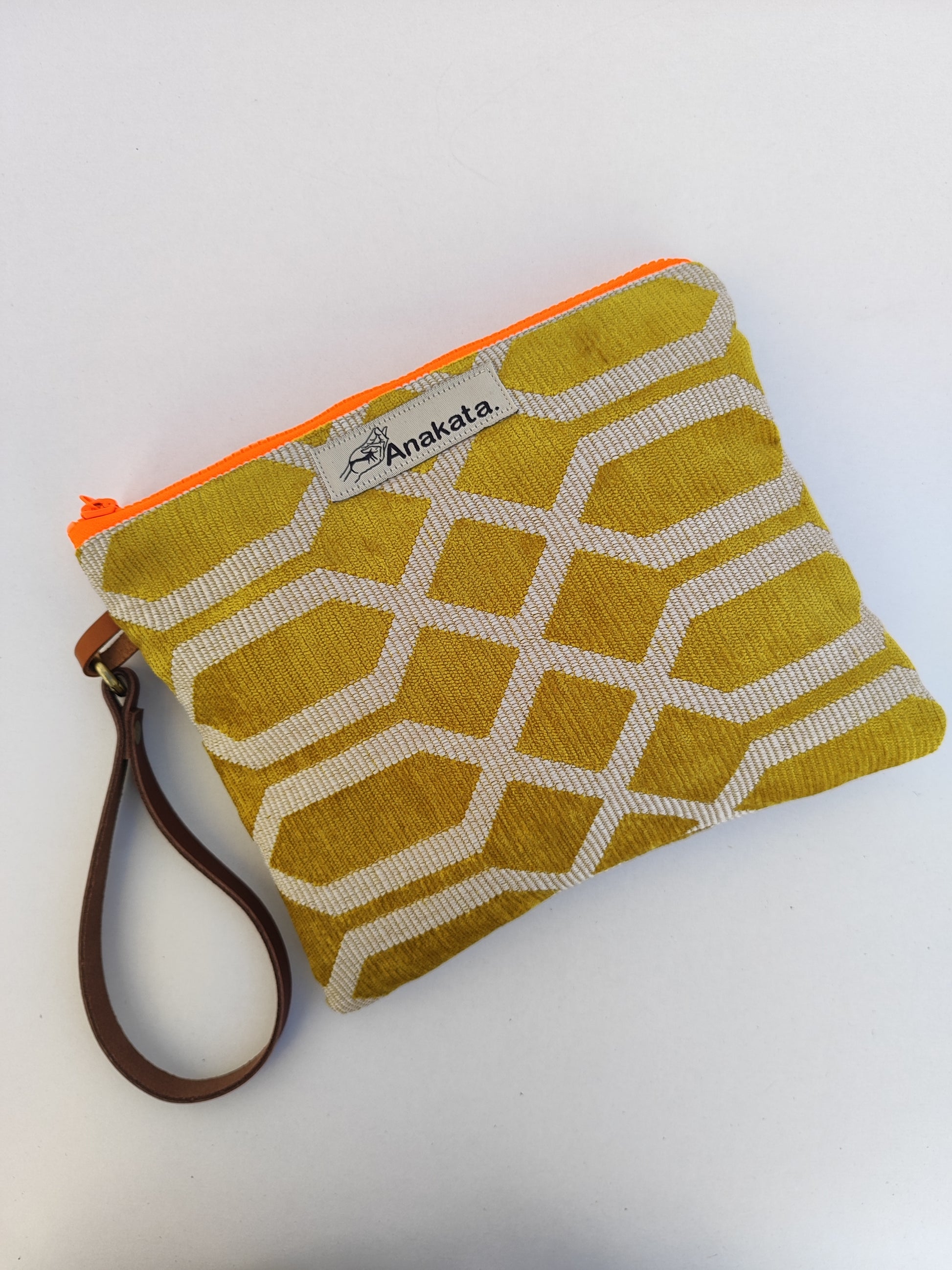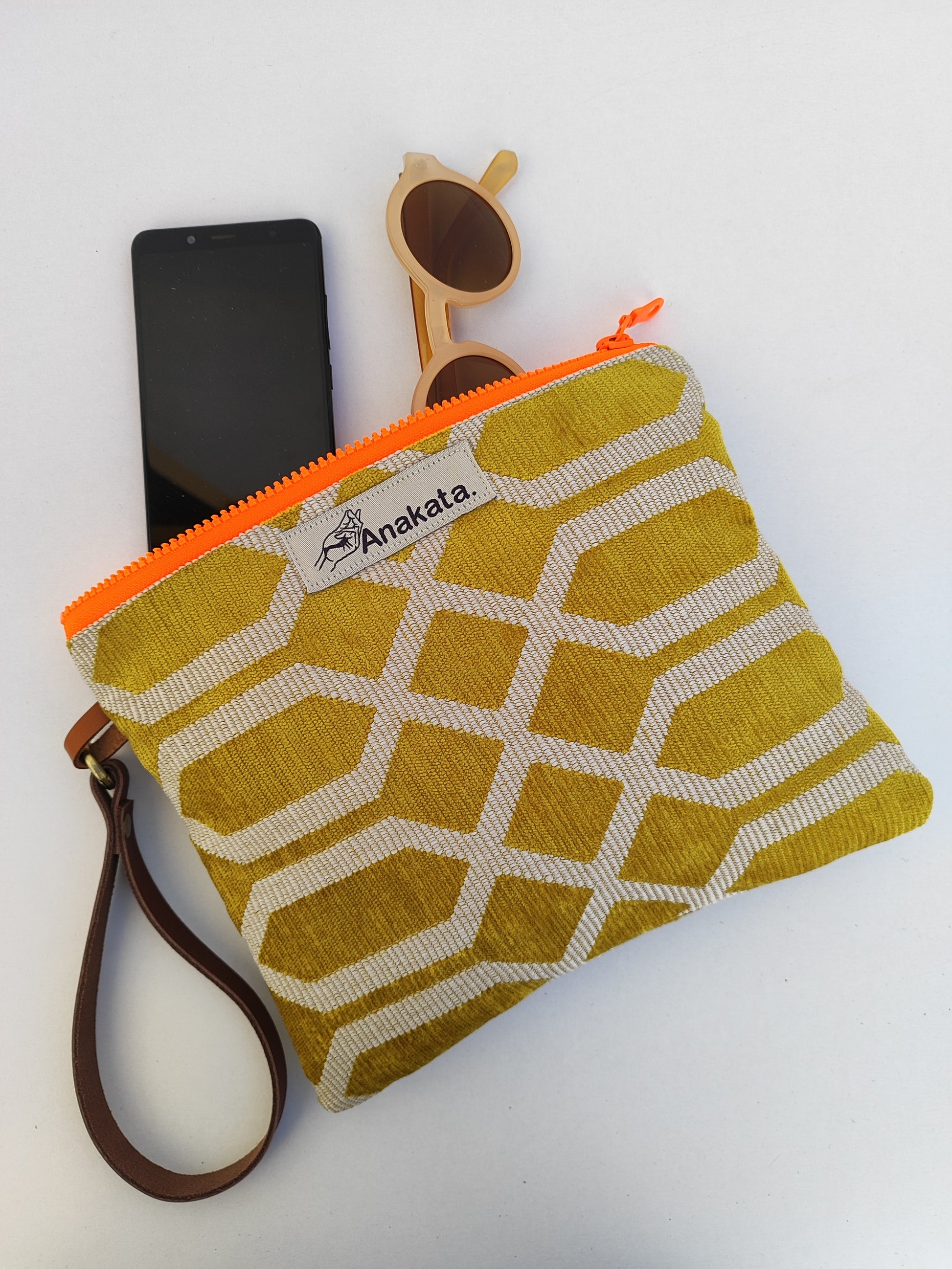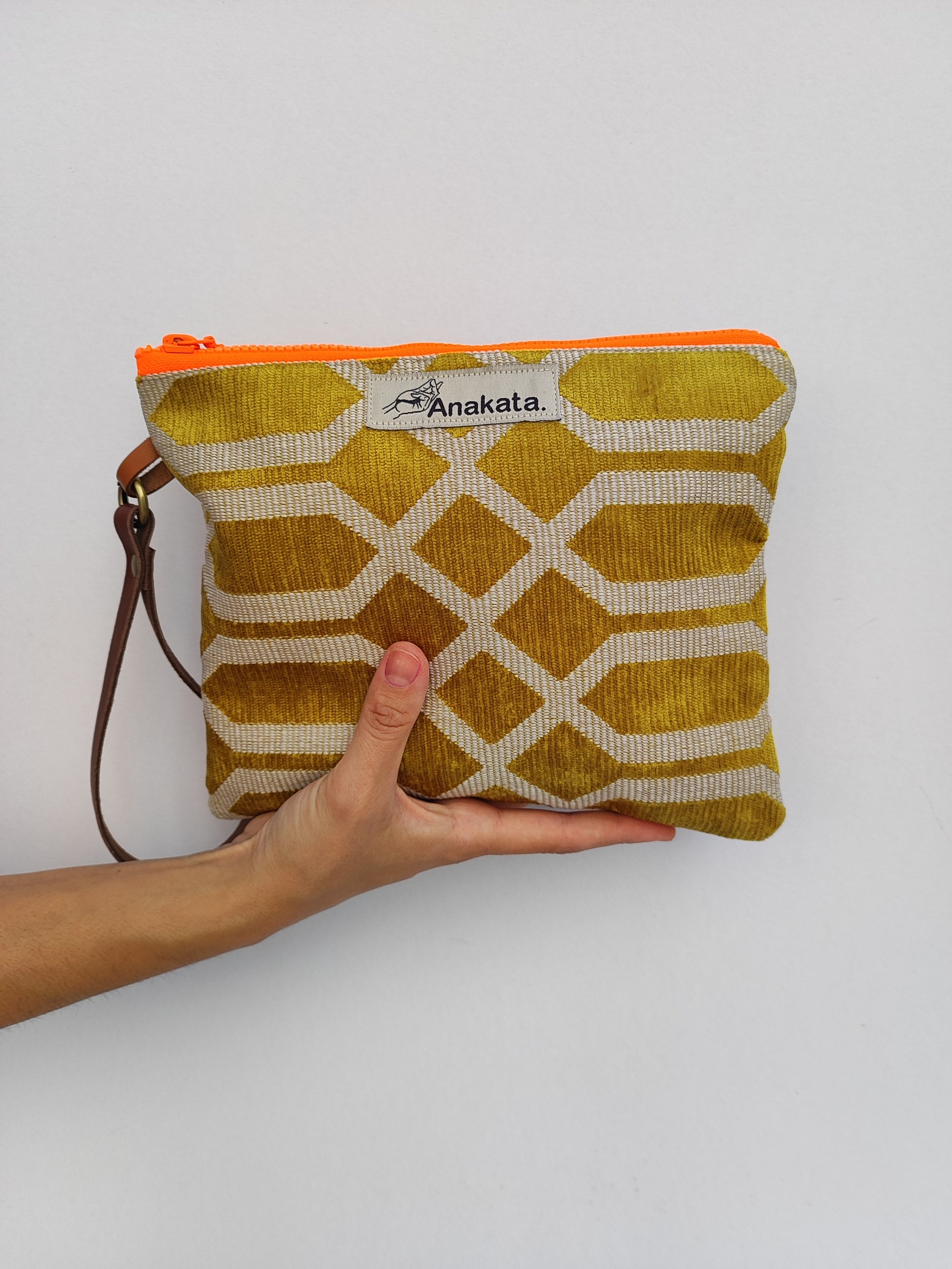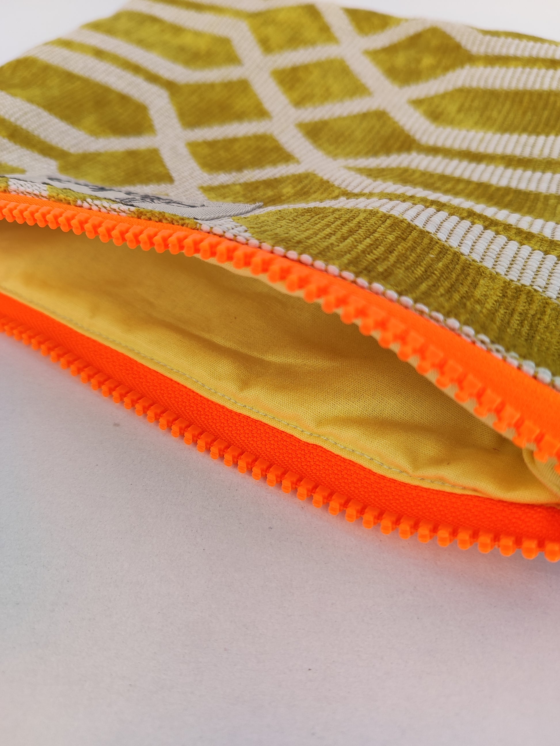 Χειροποίητο τσαντάκι με φερμουάρ ''μουσταρδί, γεωμετρικά σχήματα''
